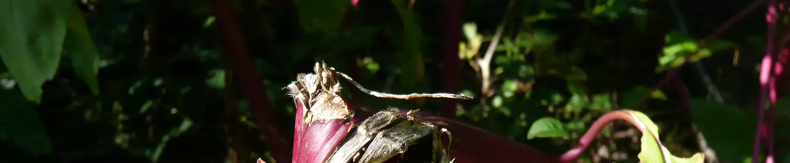 QLMB2008 037 Voilà ce qu'il ne faut pas faire : cette phytolaque a été bastonnée il y a 1 mois ou 2, mais pas sectionnée, et de fait elle n'est pas morte et sa tige pliée...
