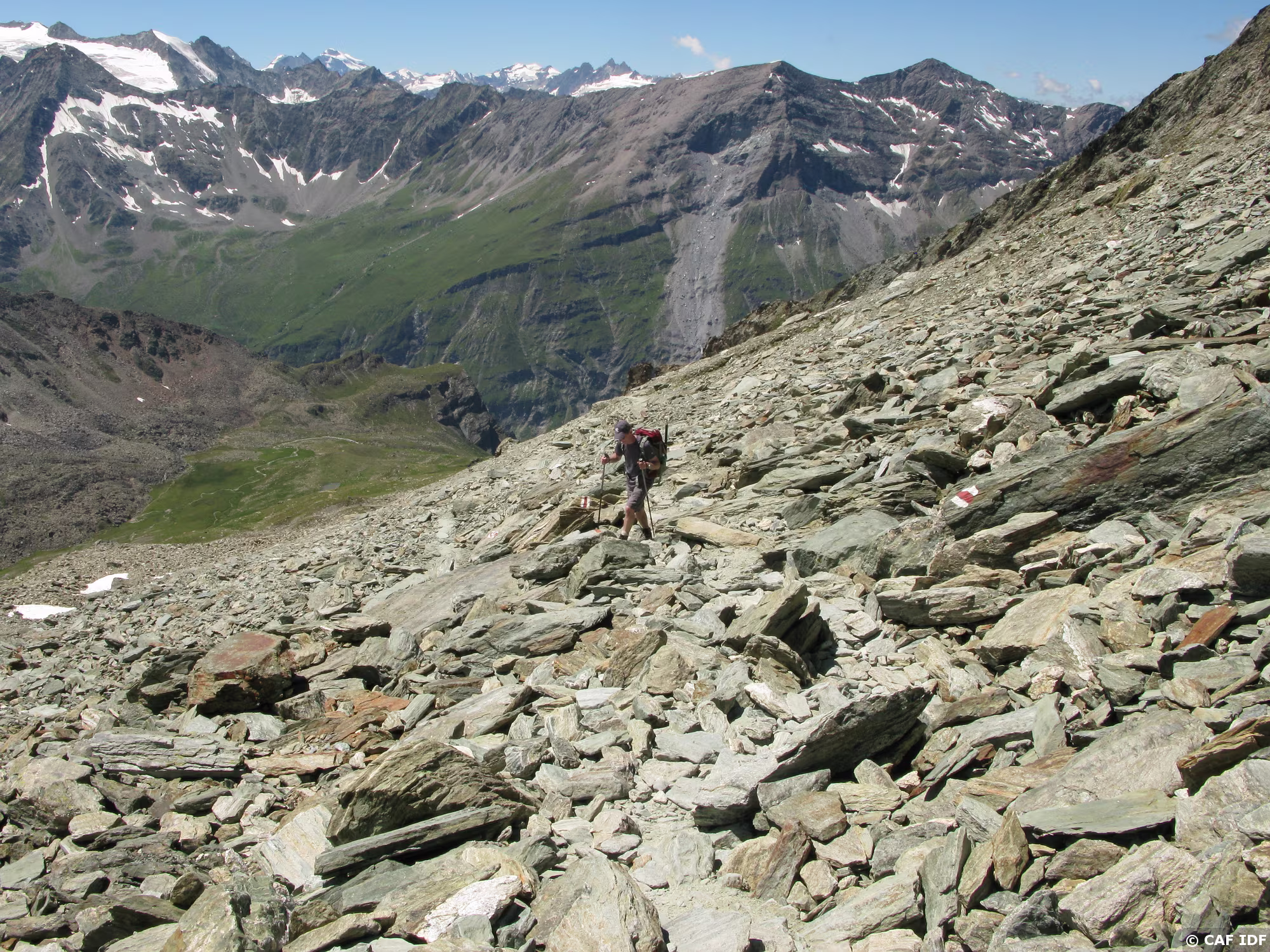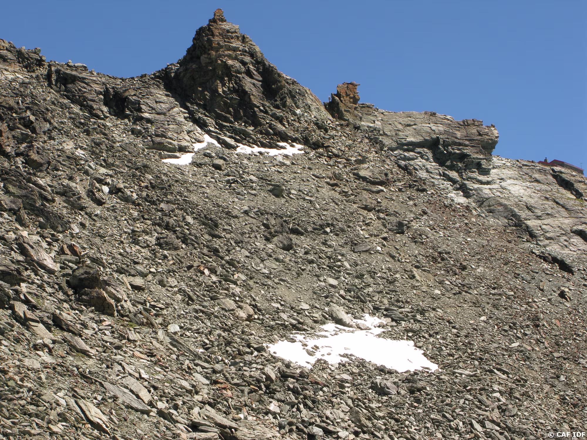 Tout à gauche des chaines à environ 50 mètres du gendarme donnent accès au col de Tracuit. La cabane du refuge est visible à l’extrême droite