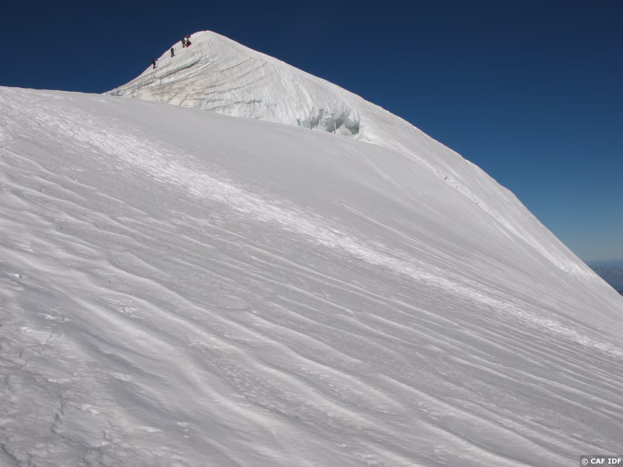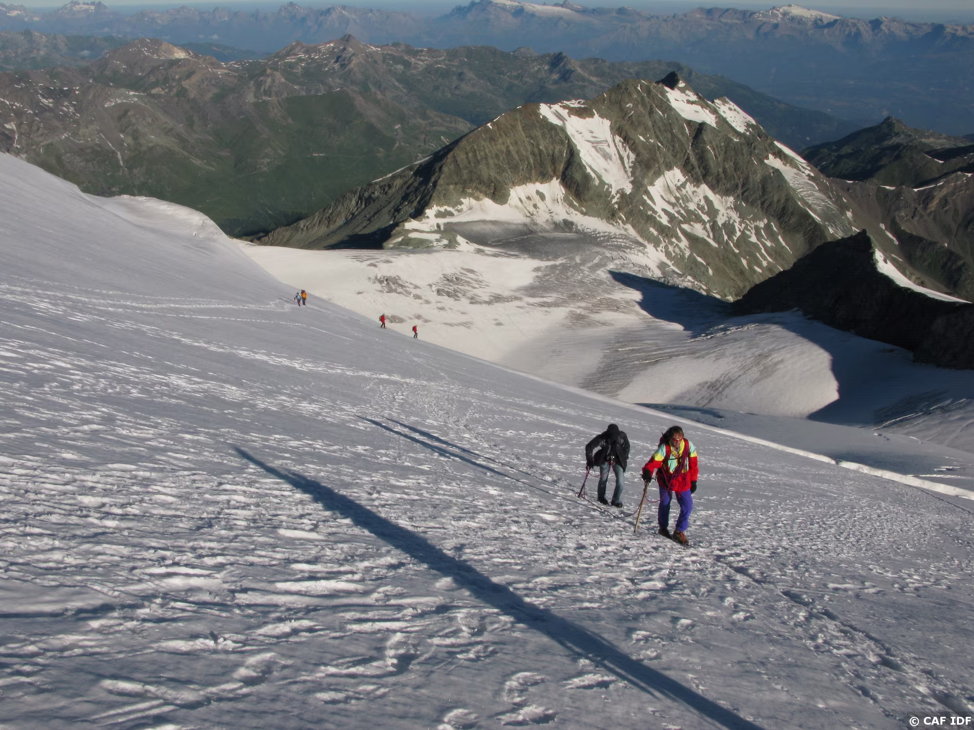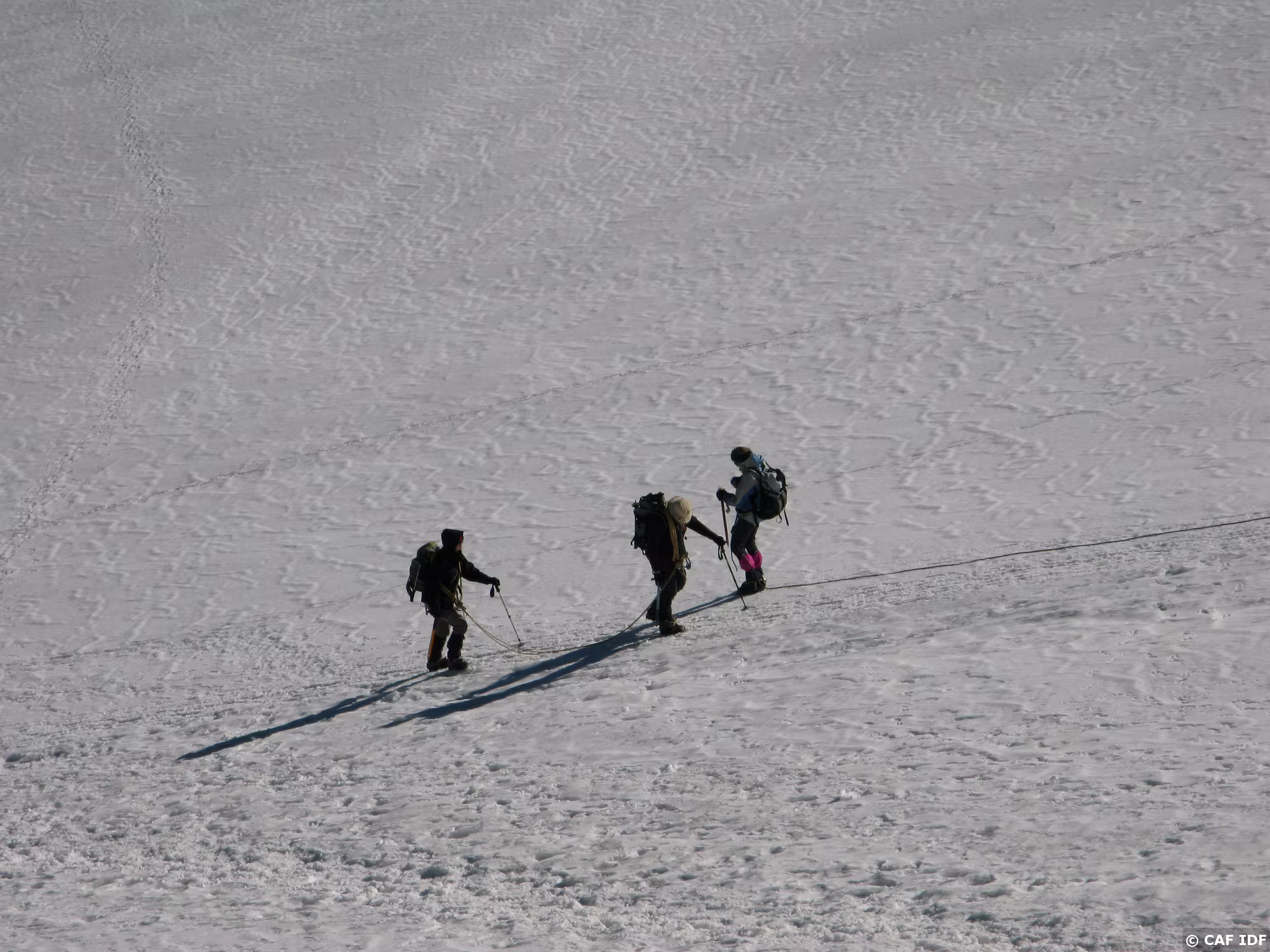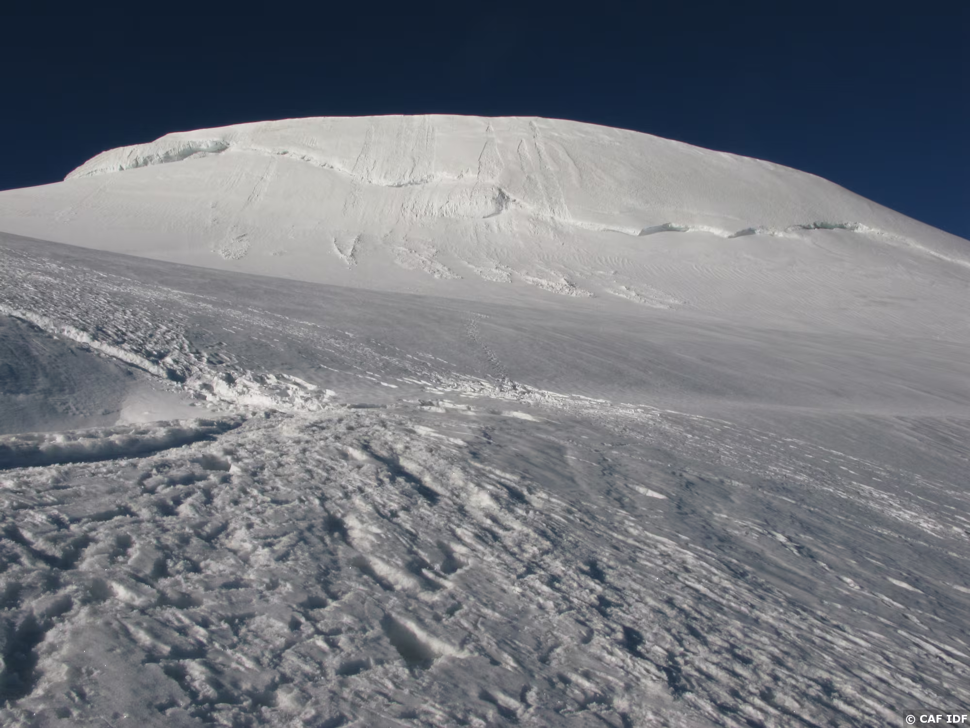 Les pentes de neige qui précédent la selle. Tout en bas les crevasses qui imposent les précautions d’usage