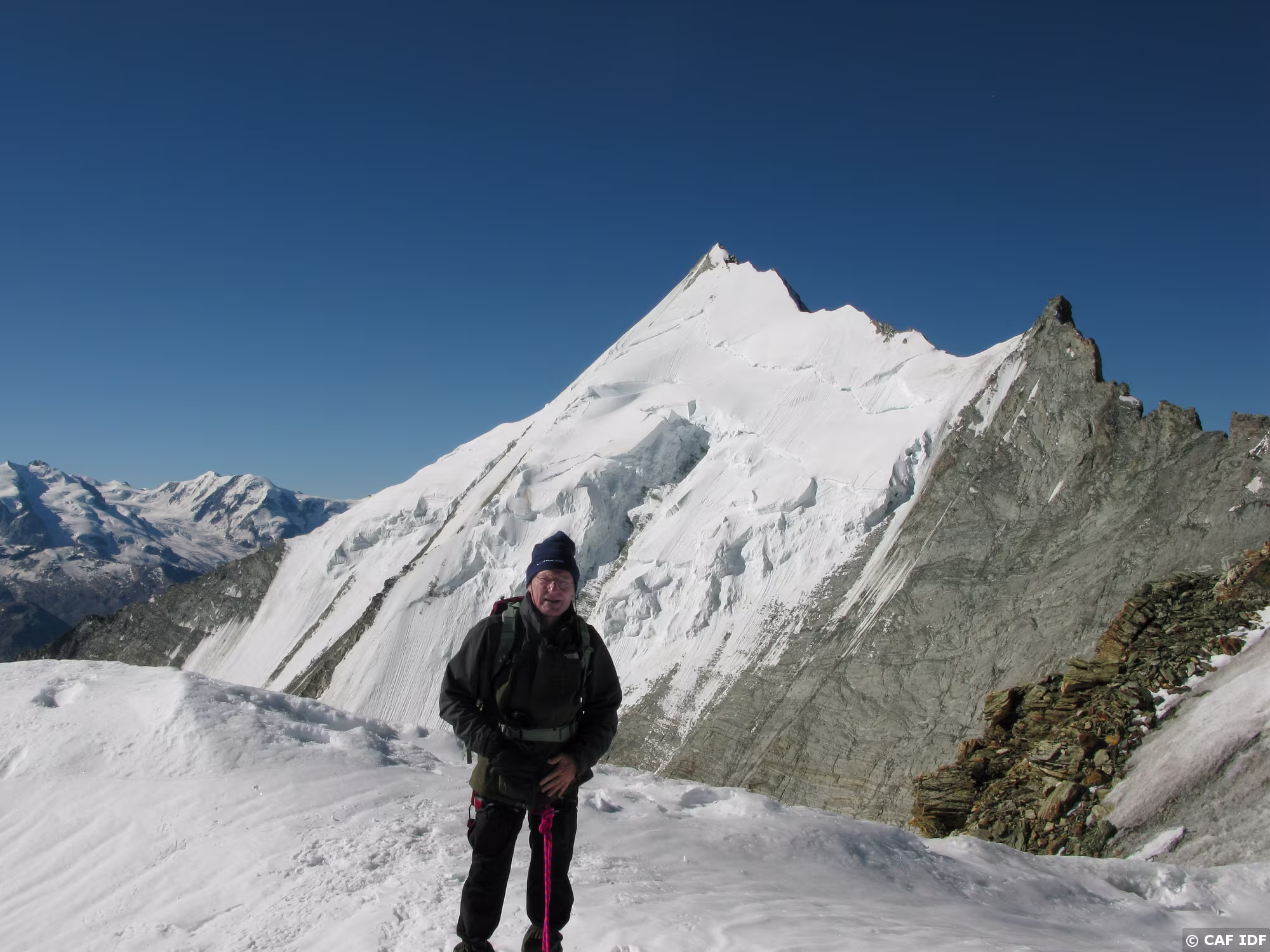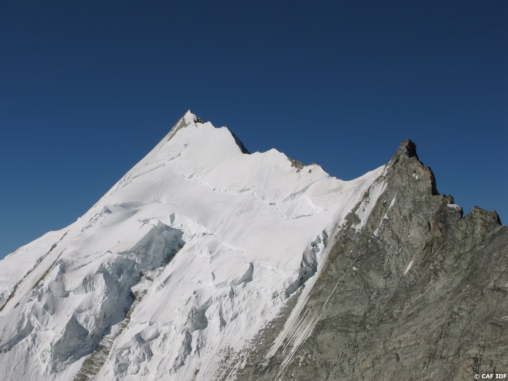 Le Zinalrothorn, 4221 mètres, avec en aval de l’épaule, l’élégante arête du Blanc qui se gagne depuis le refuge du Mountet