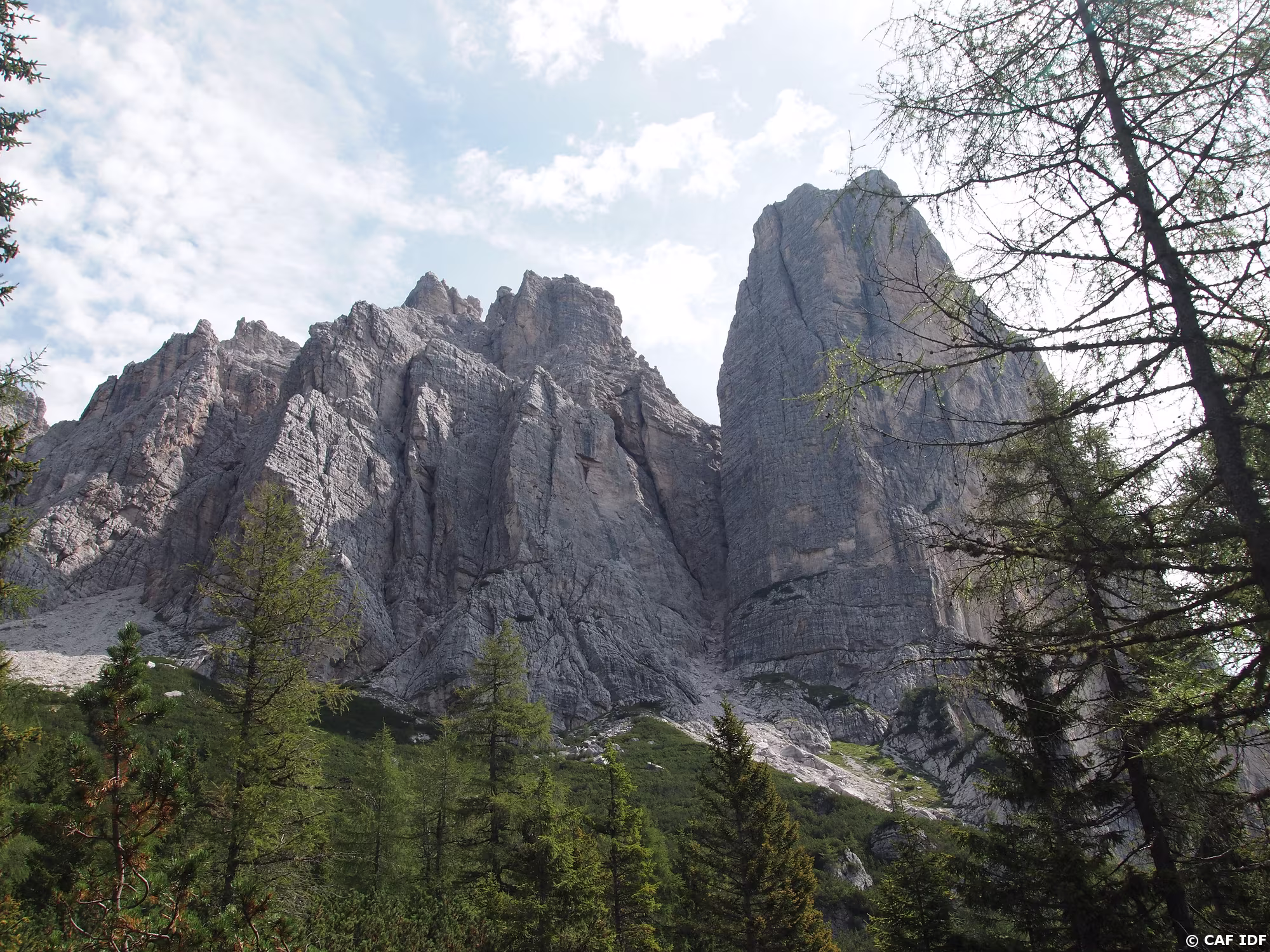 019 Le pilier vertical de la voie Cassin se détache sur l’arrière-plan de forêts et de parois calcaires.