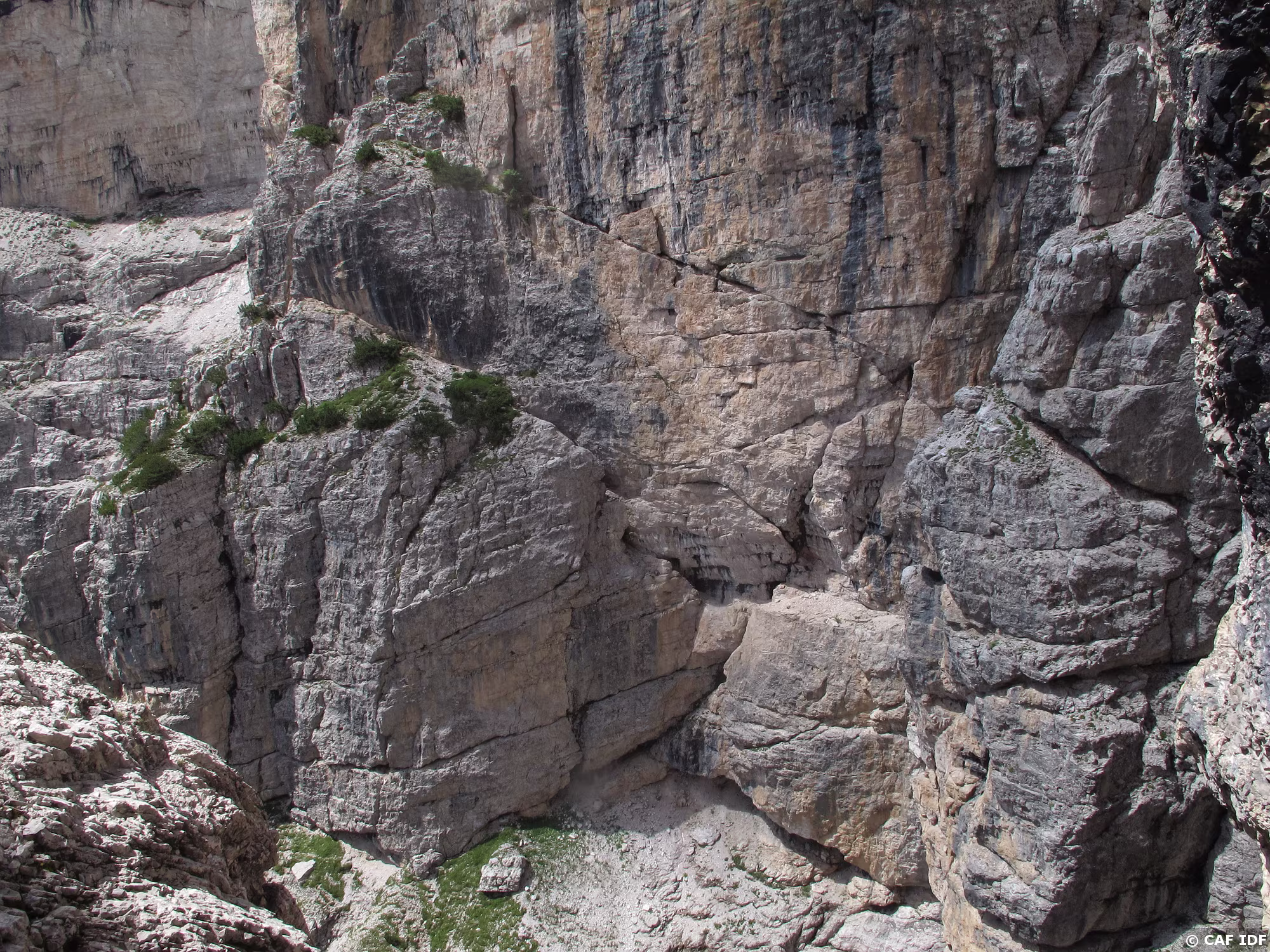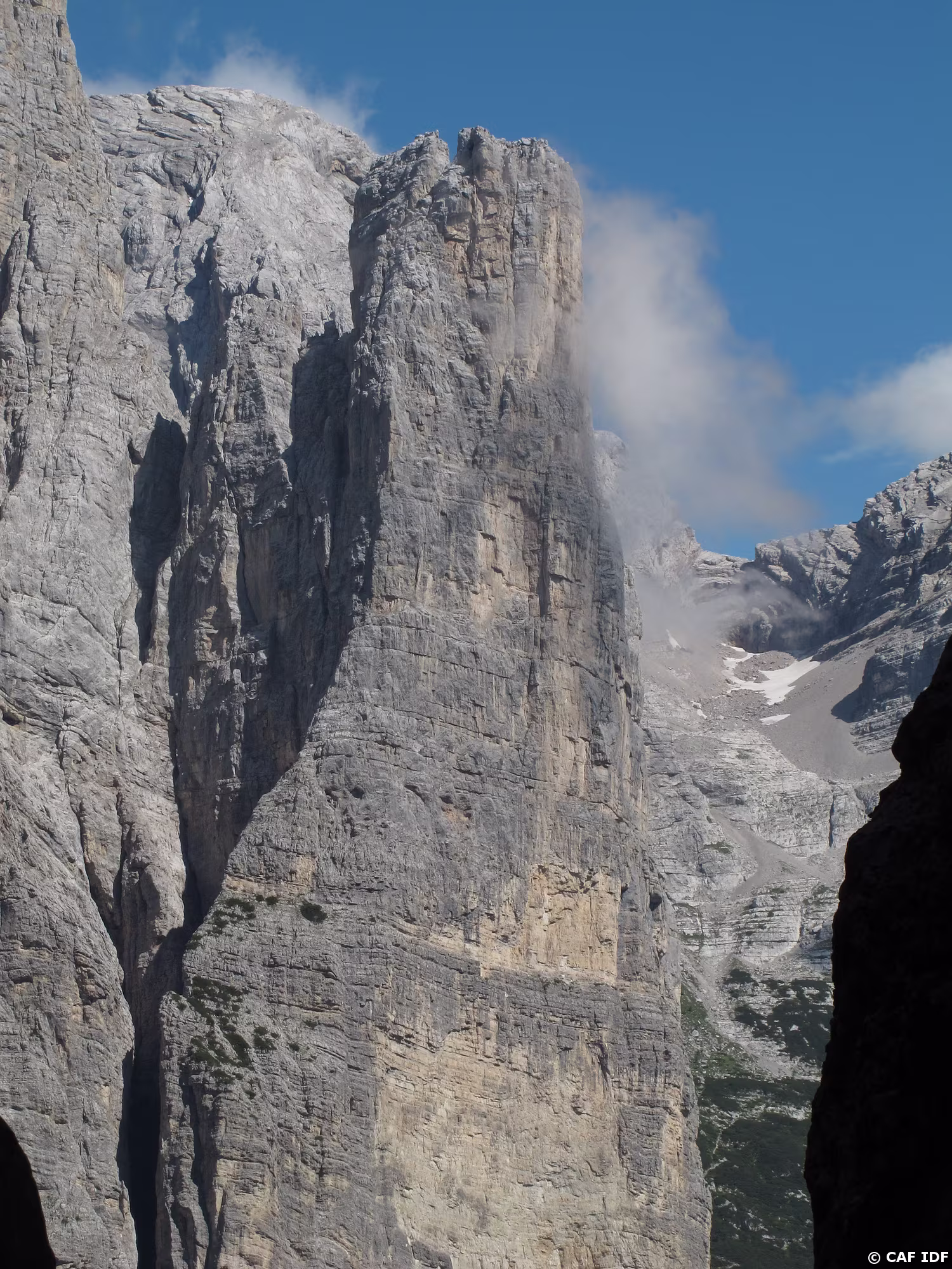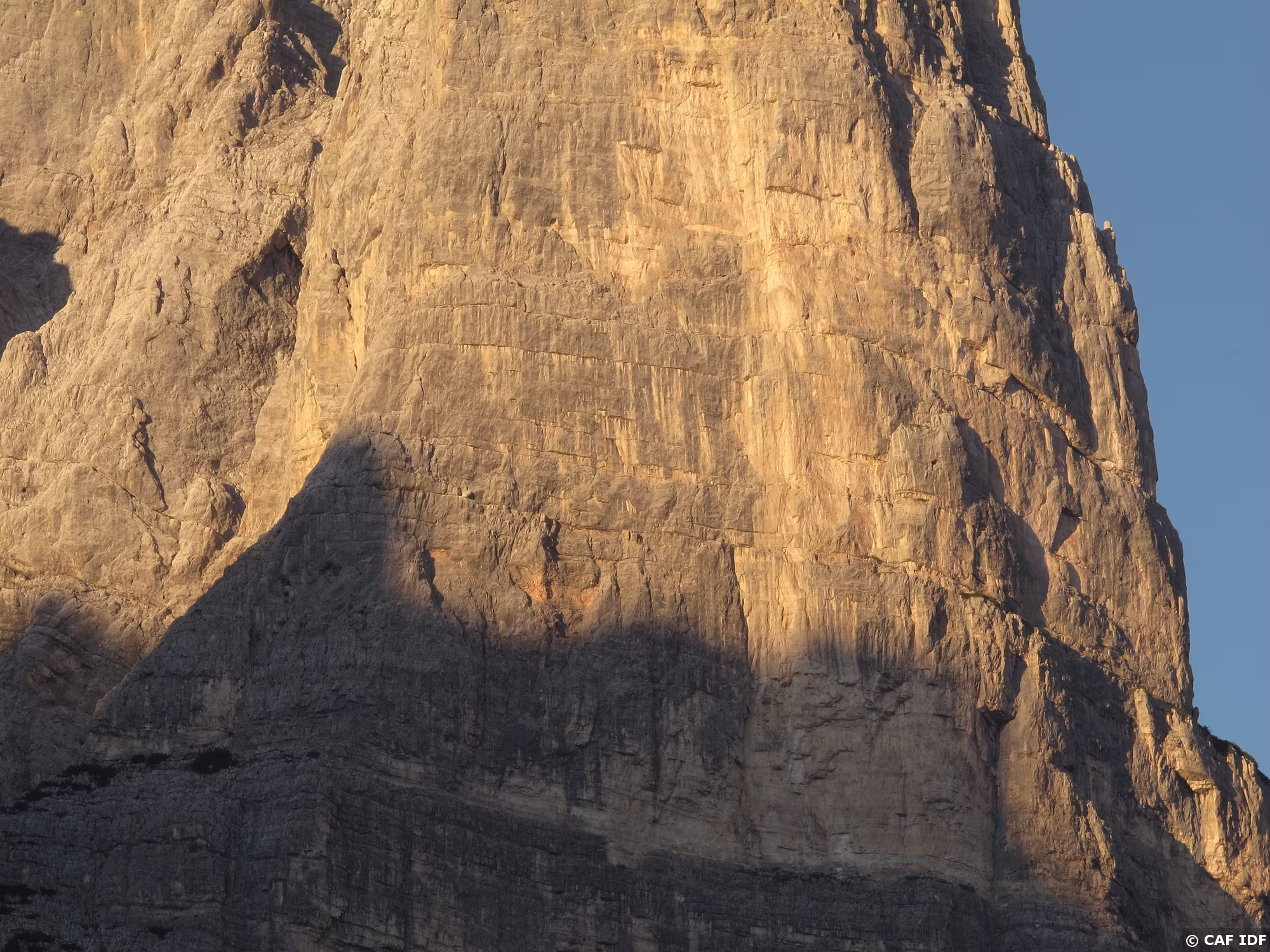 La voie Tissi chemine dans les murs gris qui jouxtent l’arête nord-ouest de la Torre Trieste.