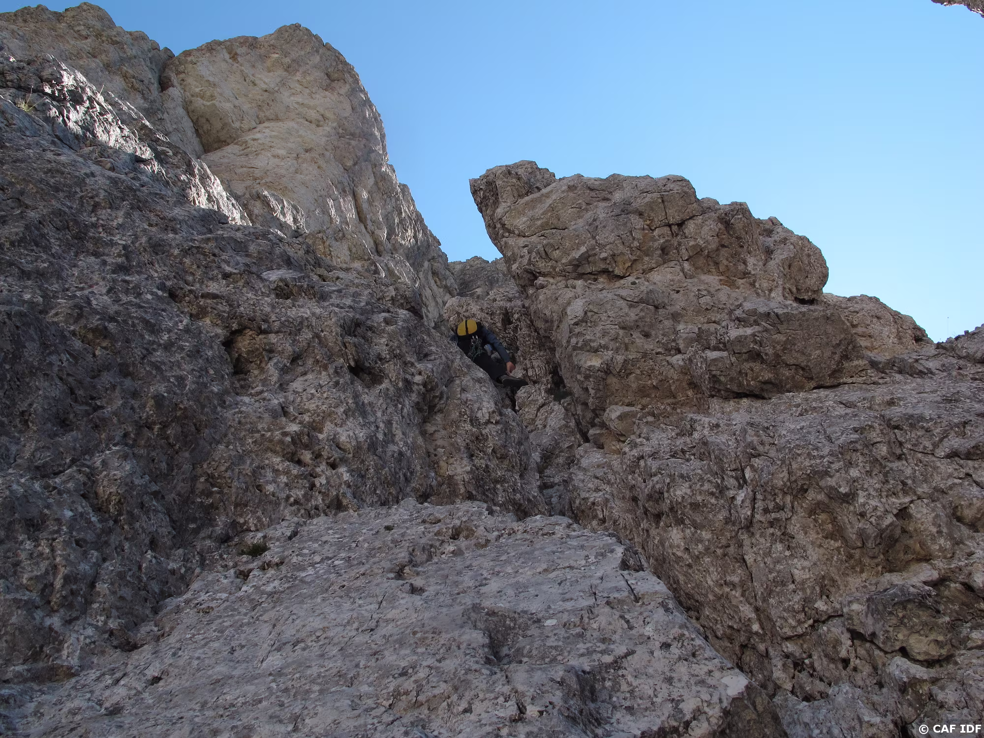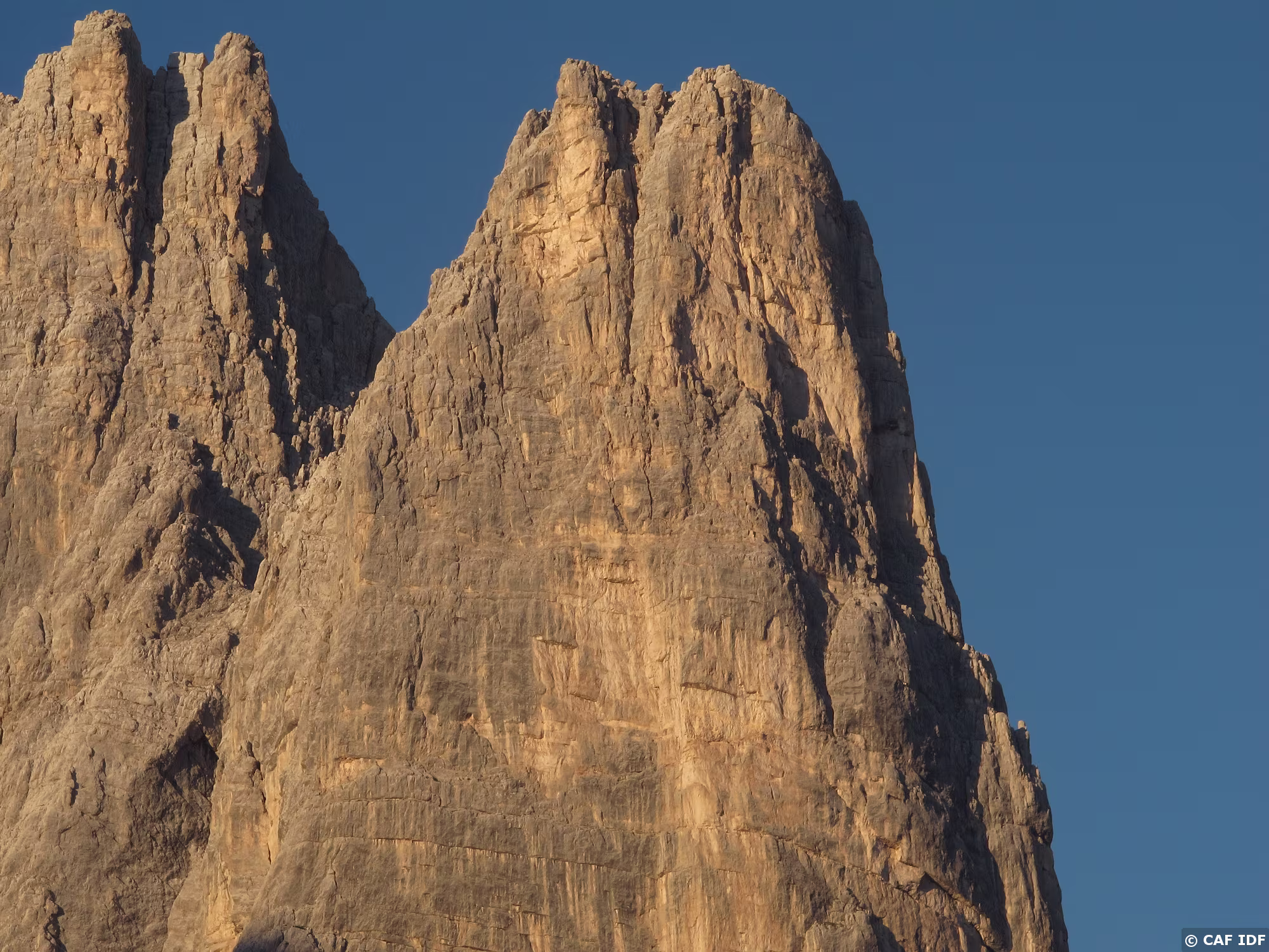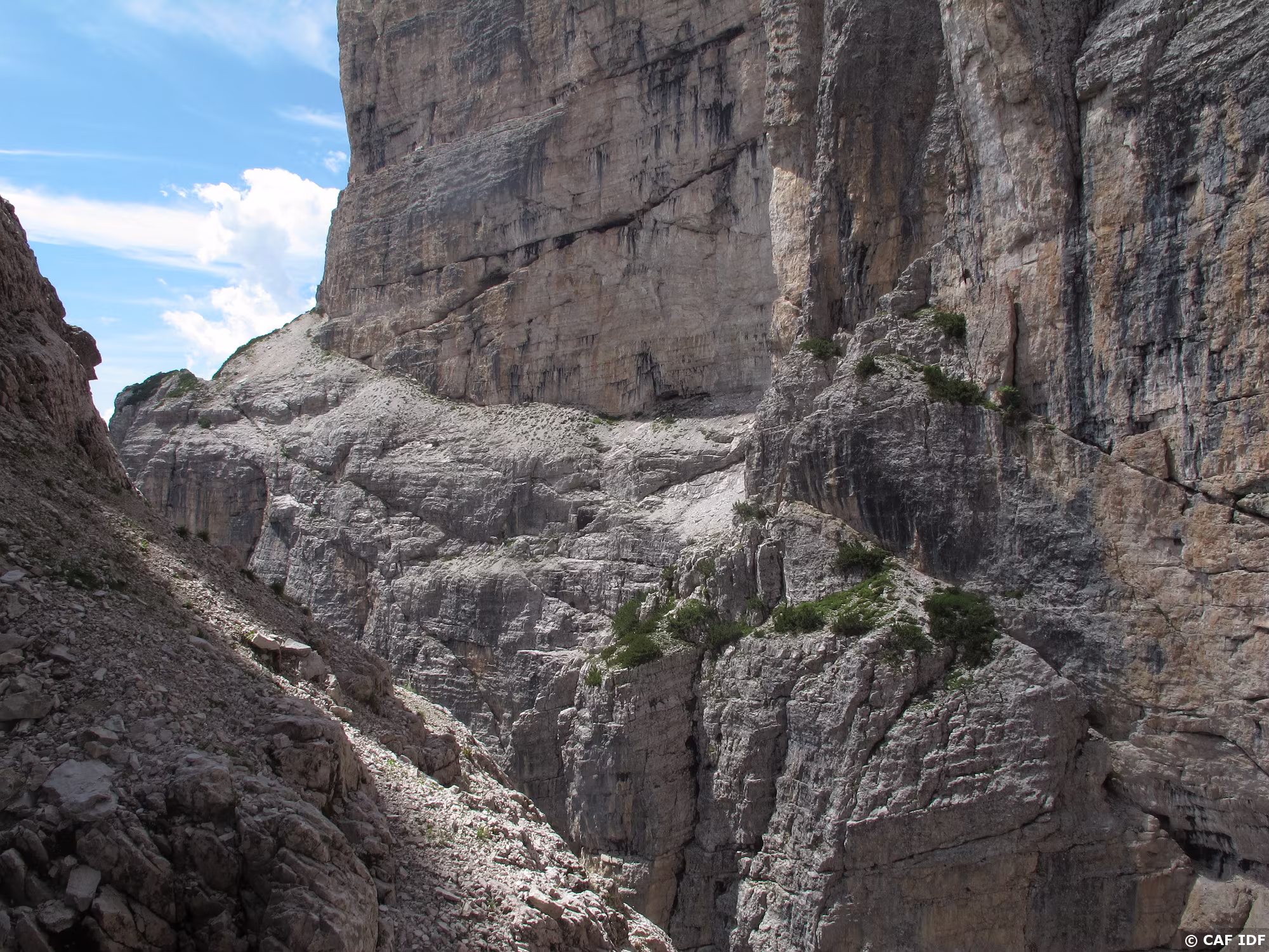 La voie Tissi chemine dans les murs gris qui jouxtent l’arête nord-ouest de la Torre Trieste.