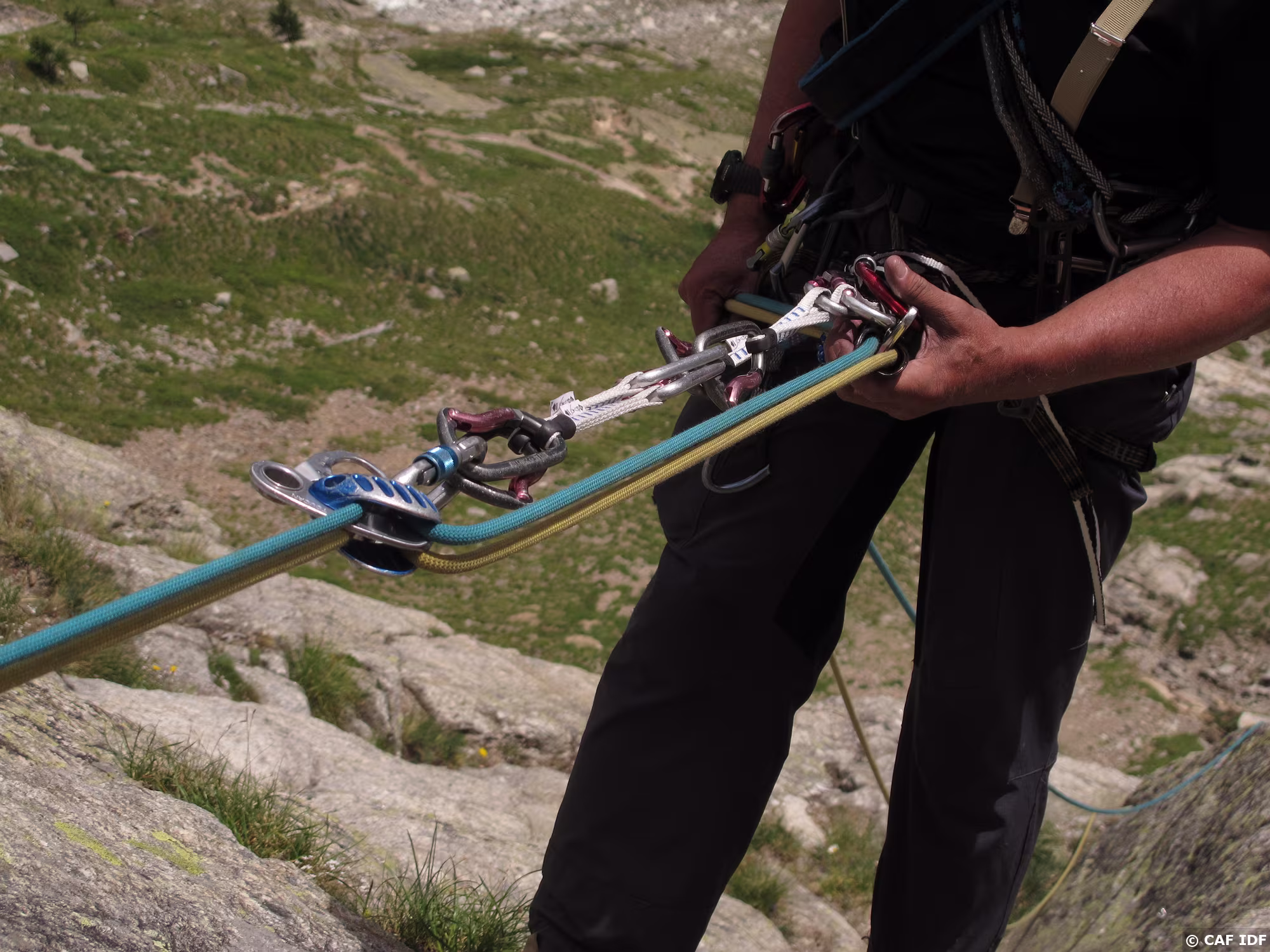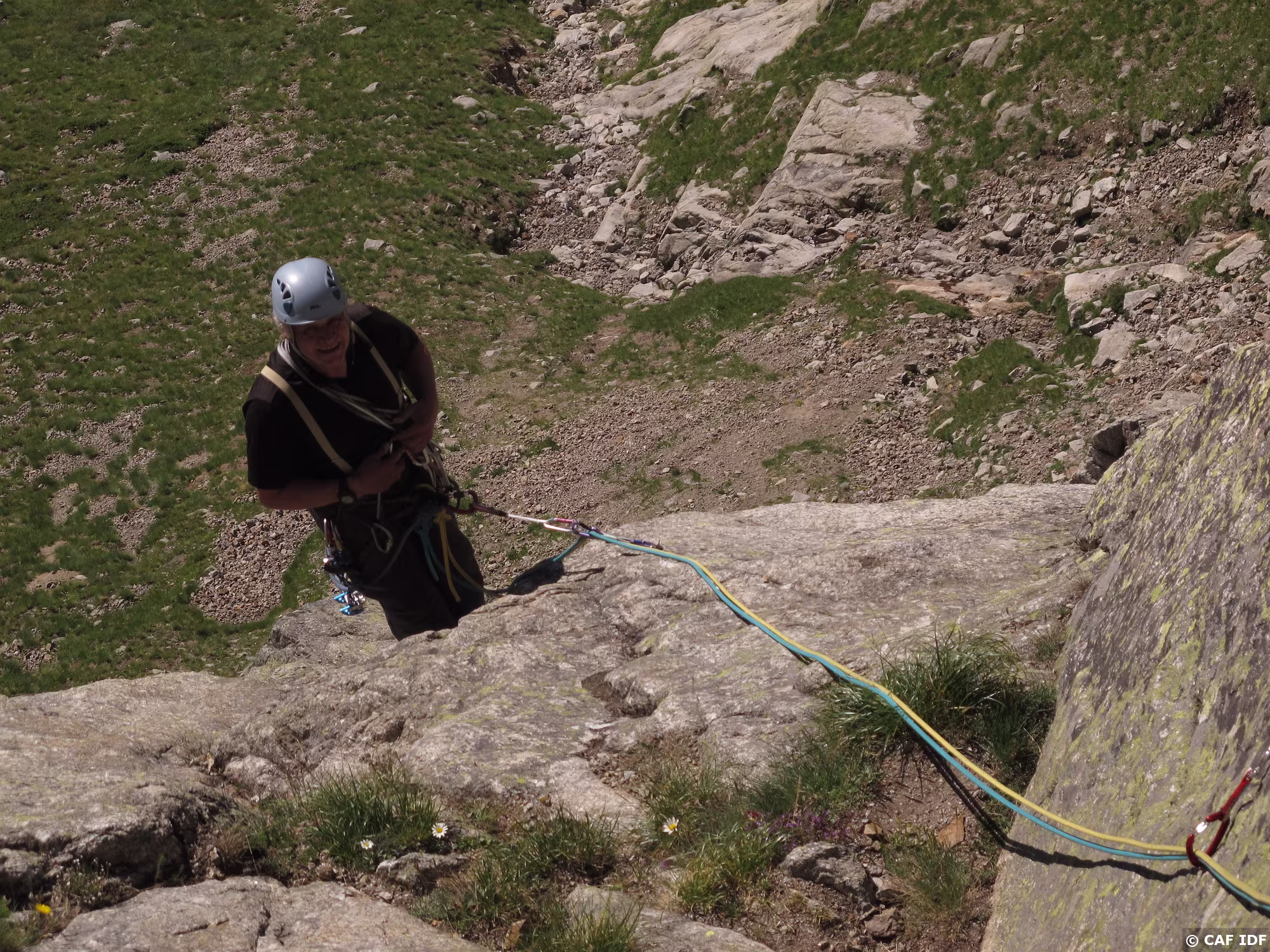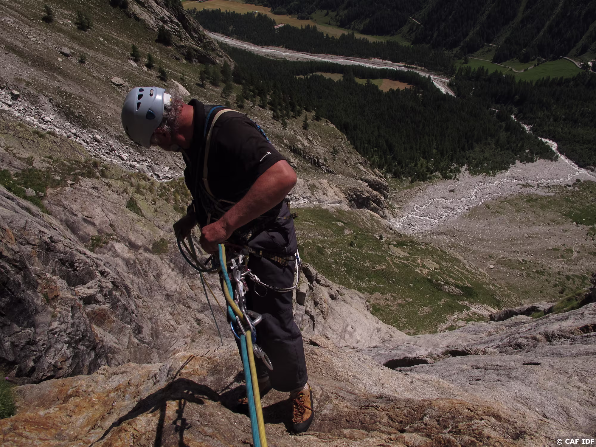 Michel s’engage dans le rappel oblique qui conduit à R5 sur l’éperon rocheux