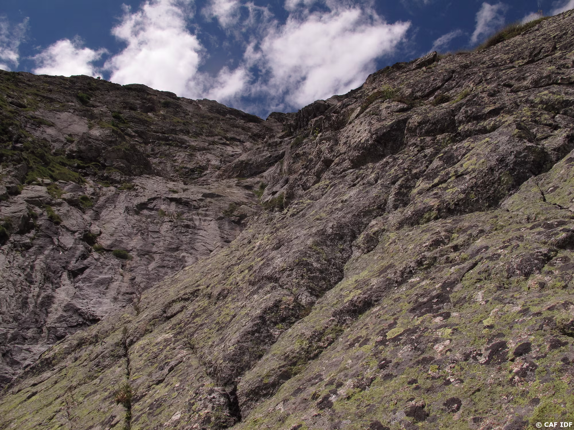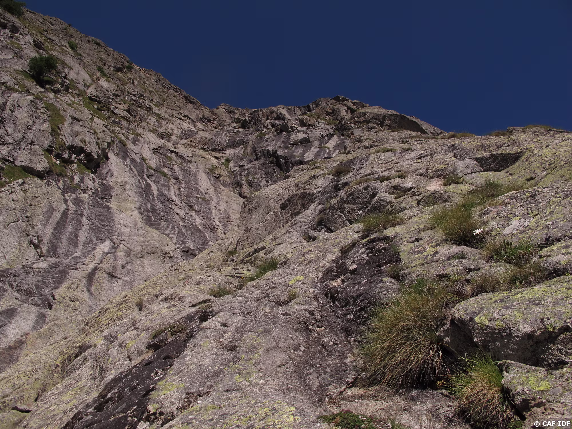 Velociraptor, D, 200m. La voie parcourt les contreforts situés à droite de l’aiguille du Châtelet