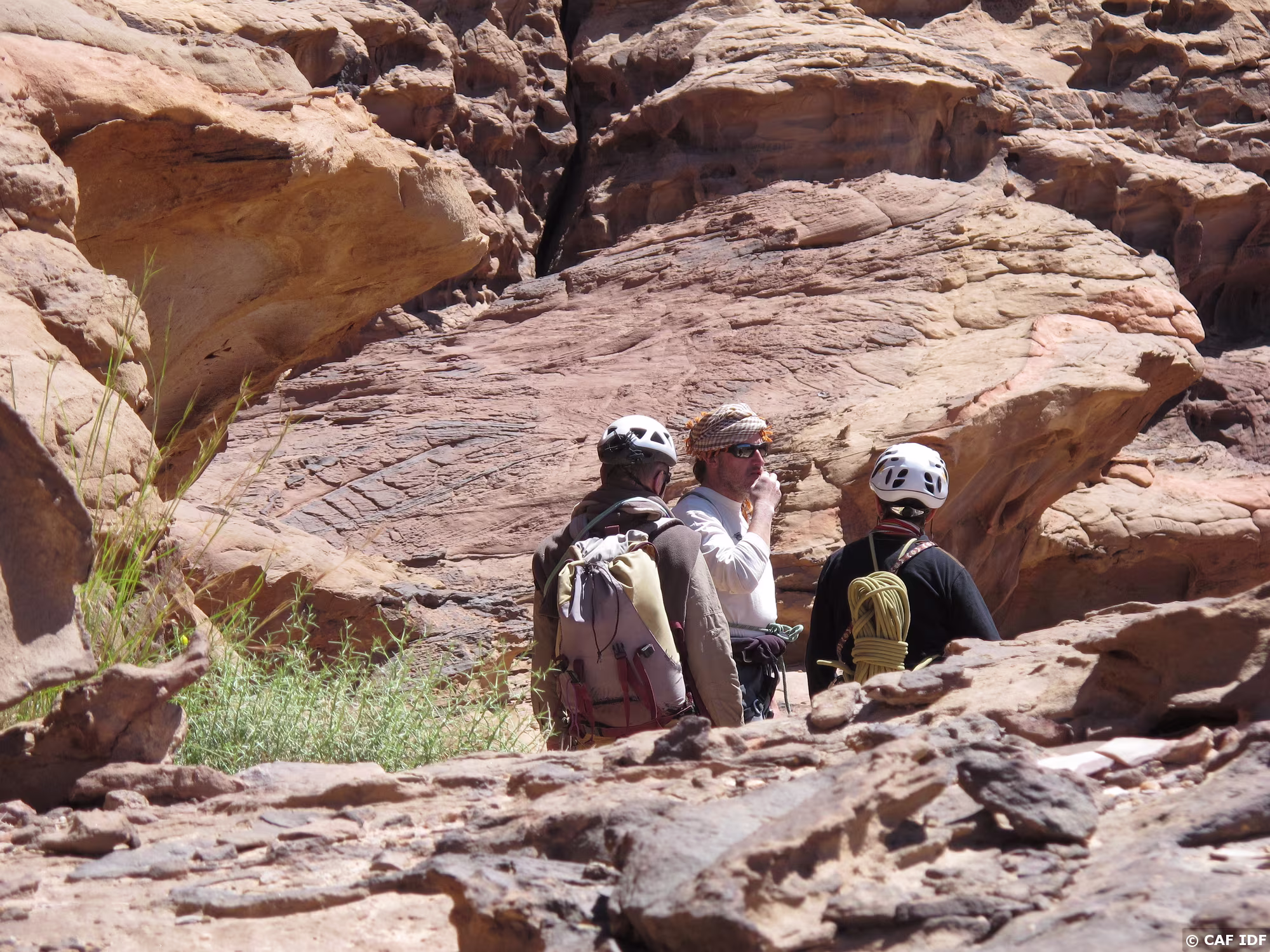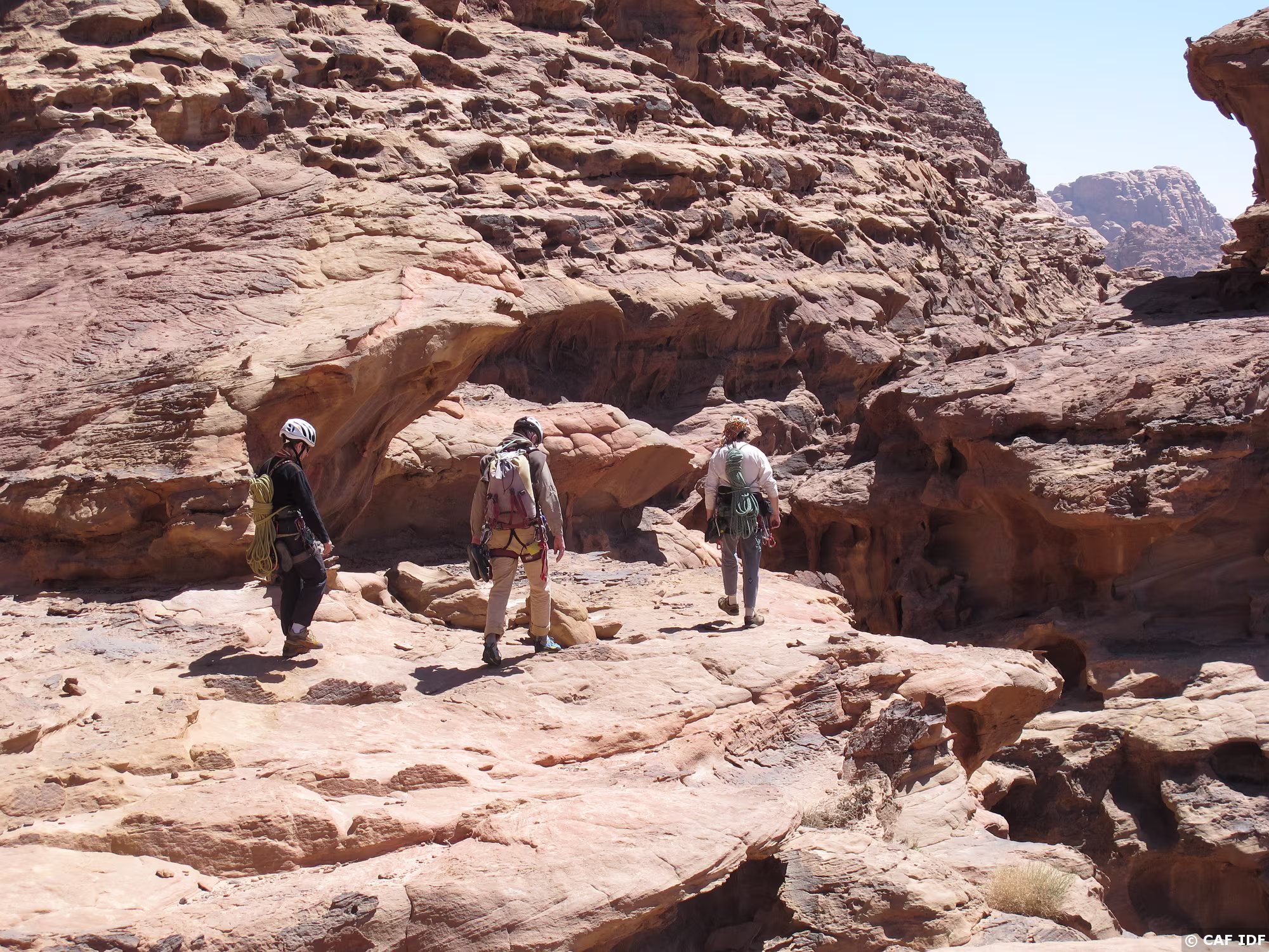 016 Cheminent le long de larges vires si spécifiques de cet étrange massif