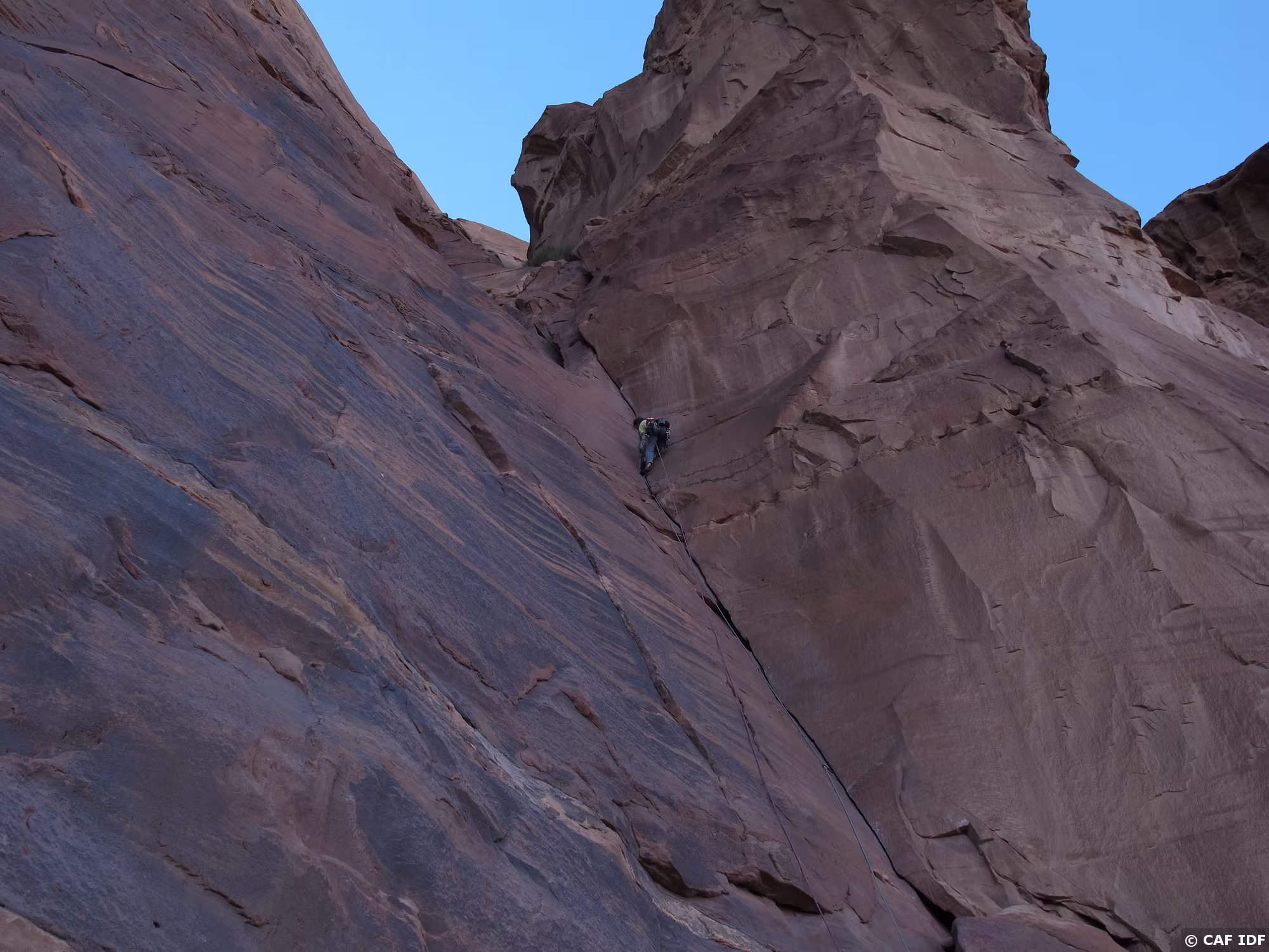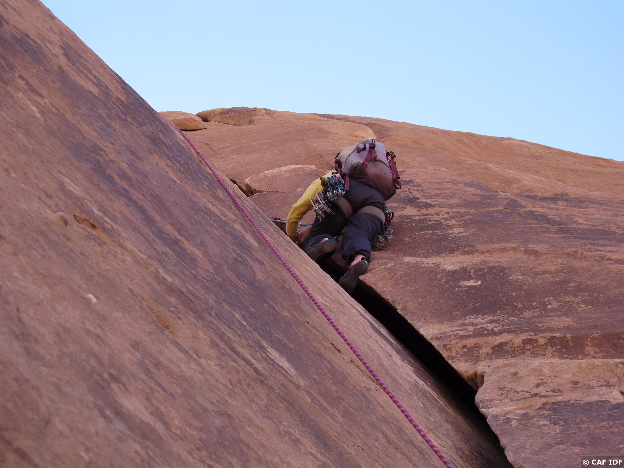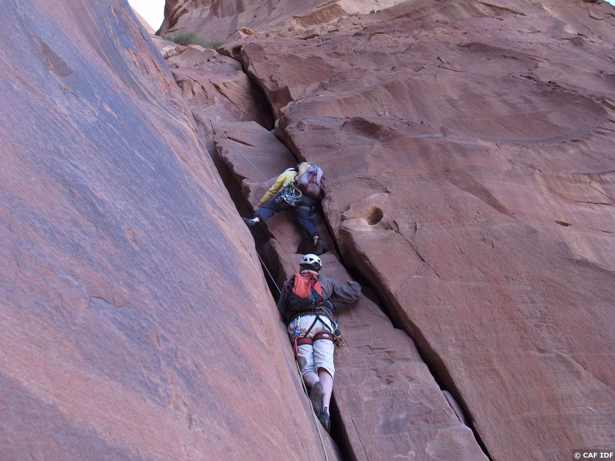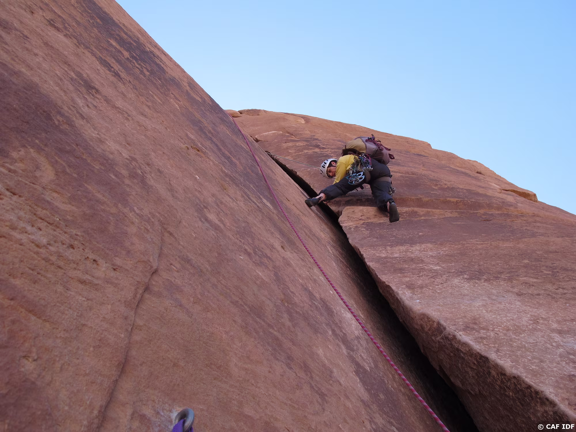 Noter le coinceur placé dans la fissure à droite et au-dessus de la large vire de sortie