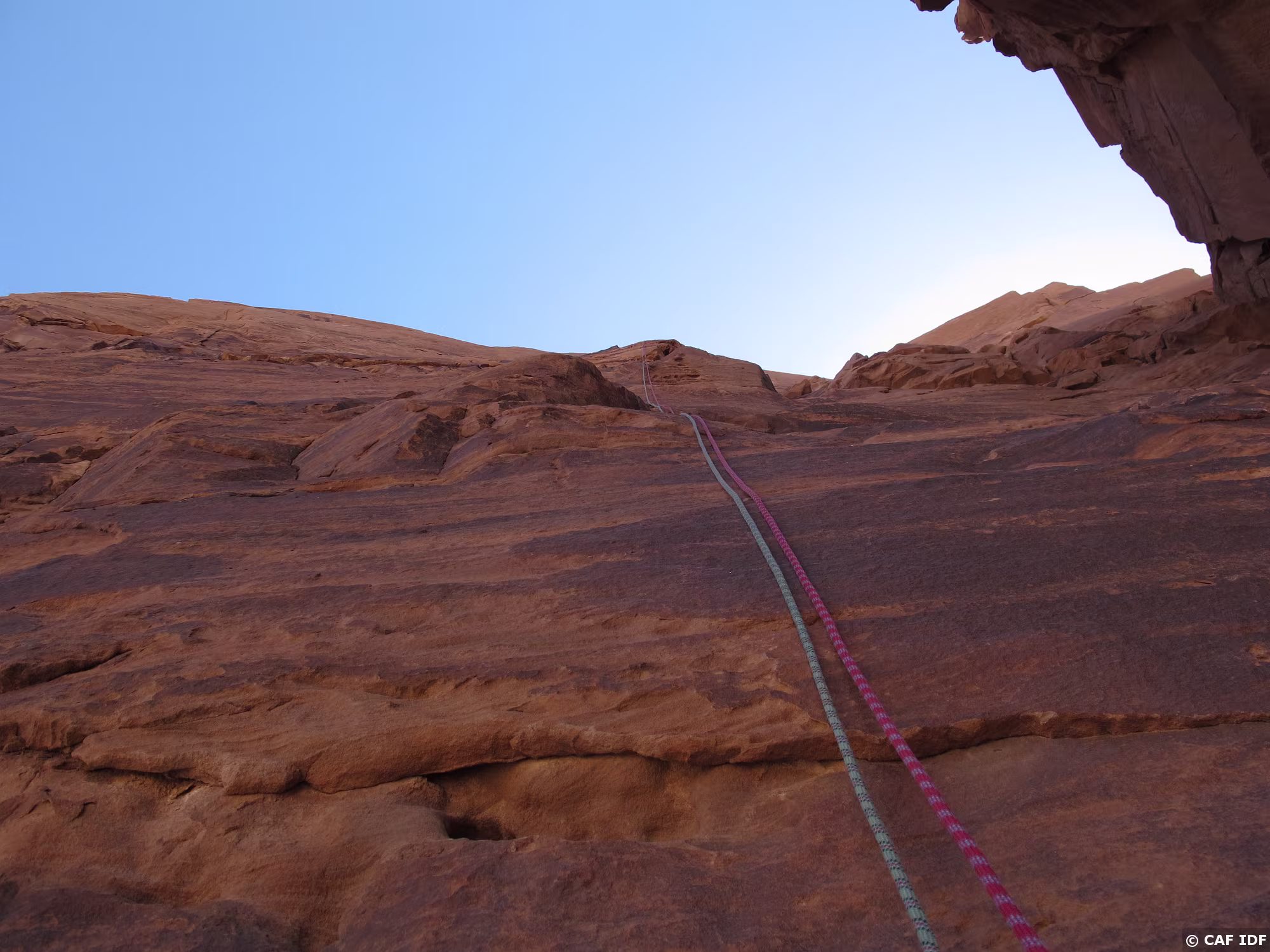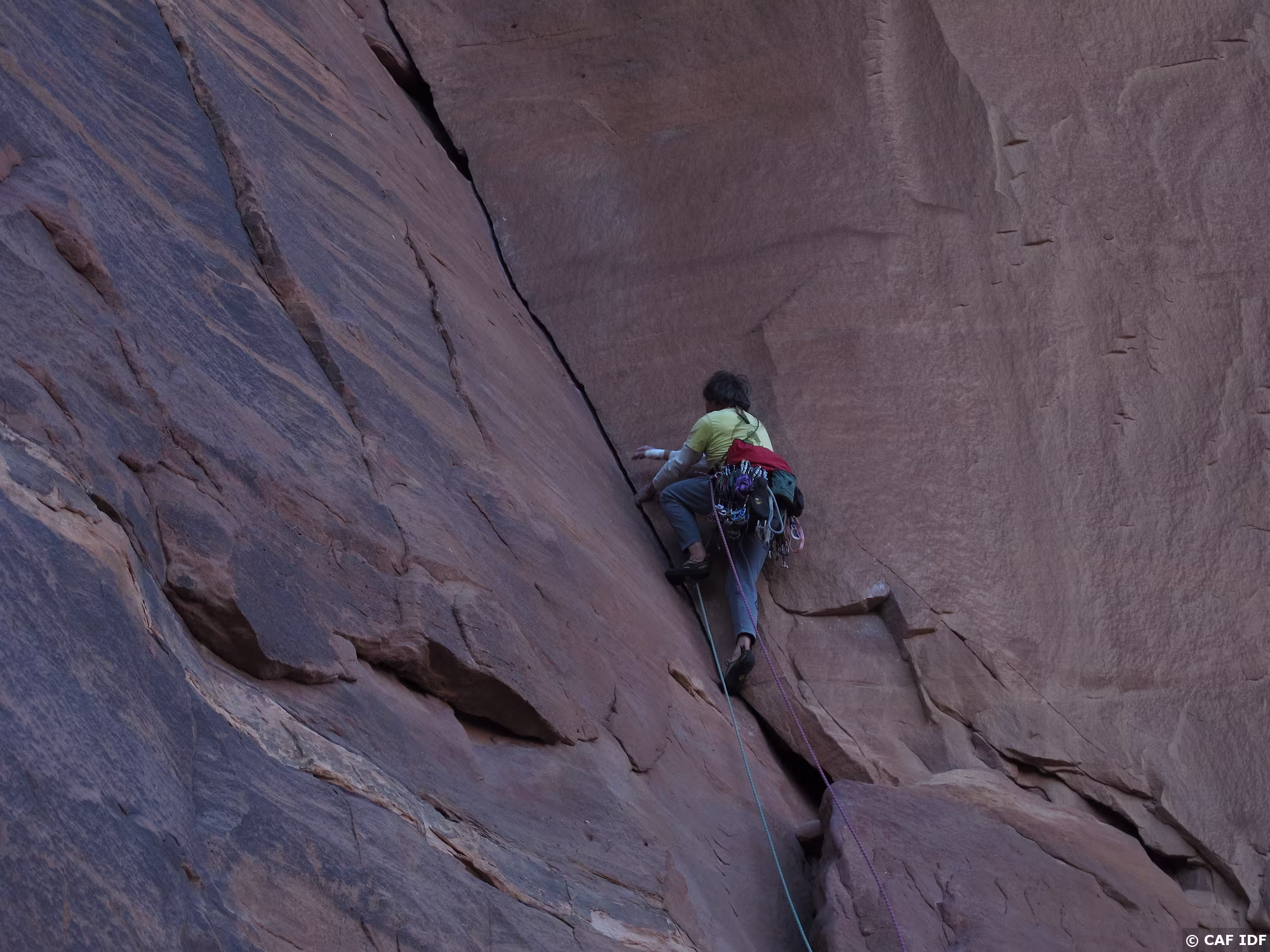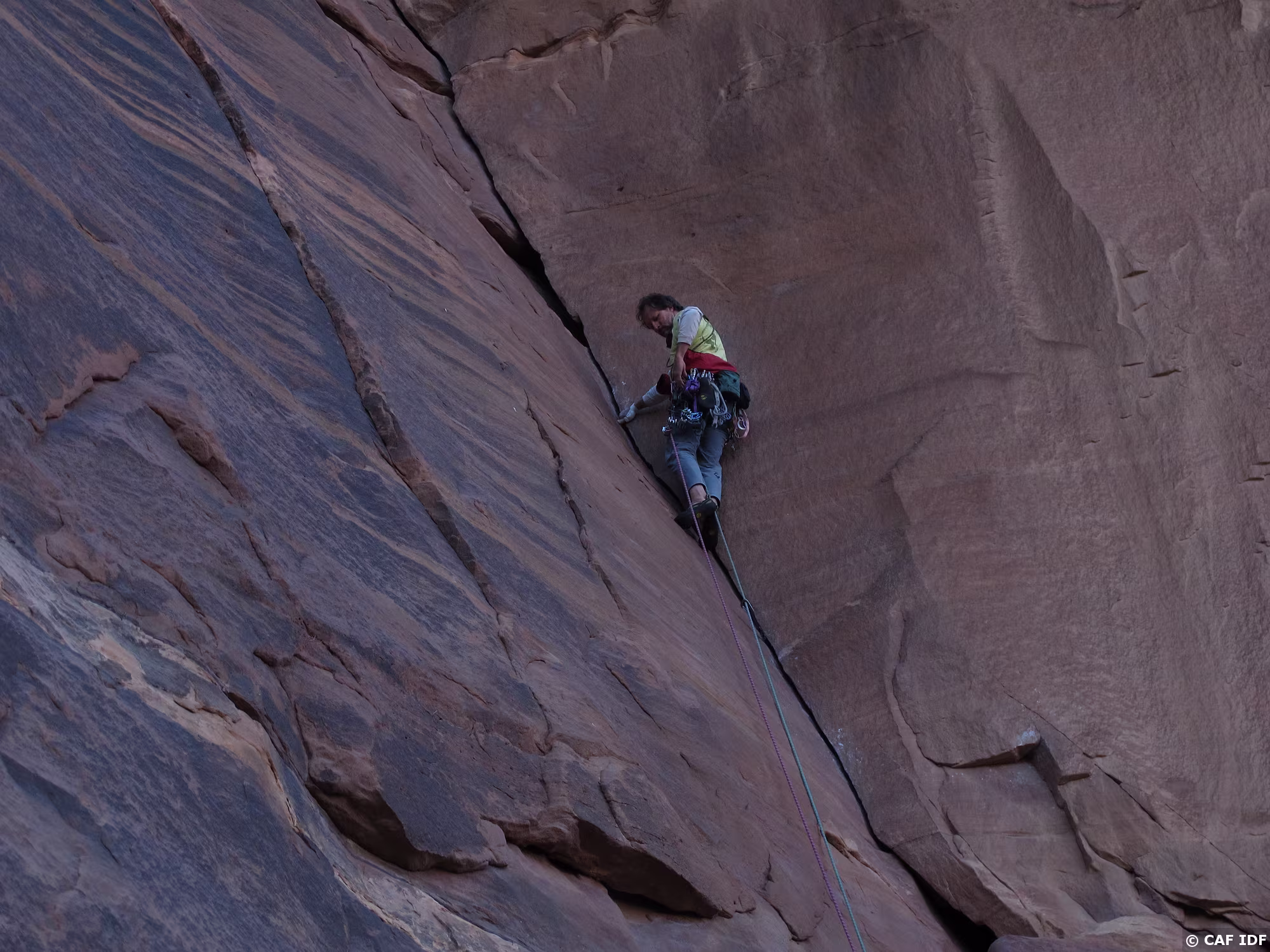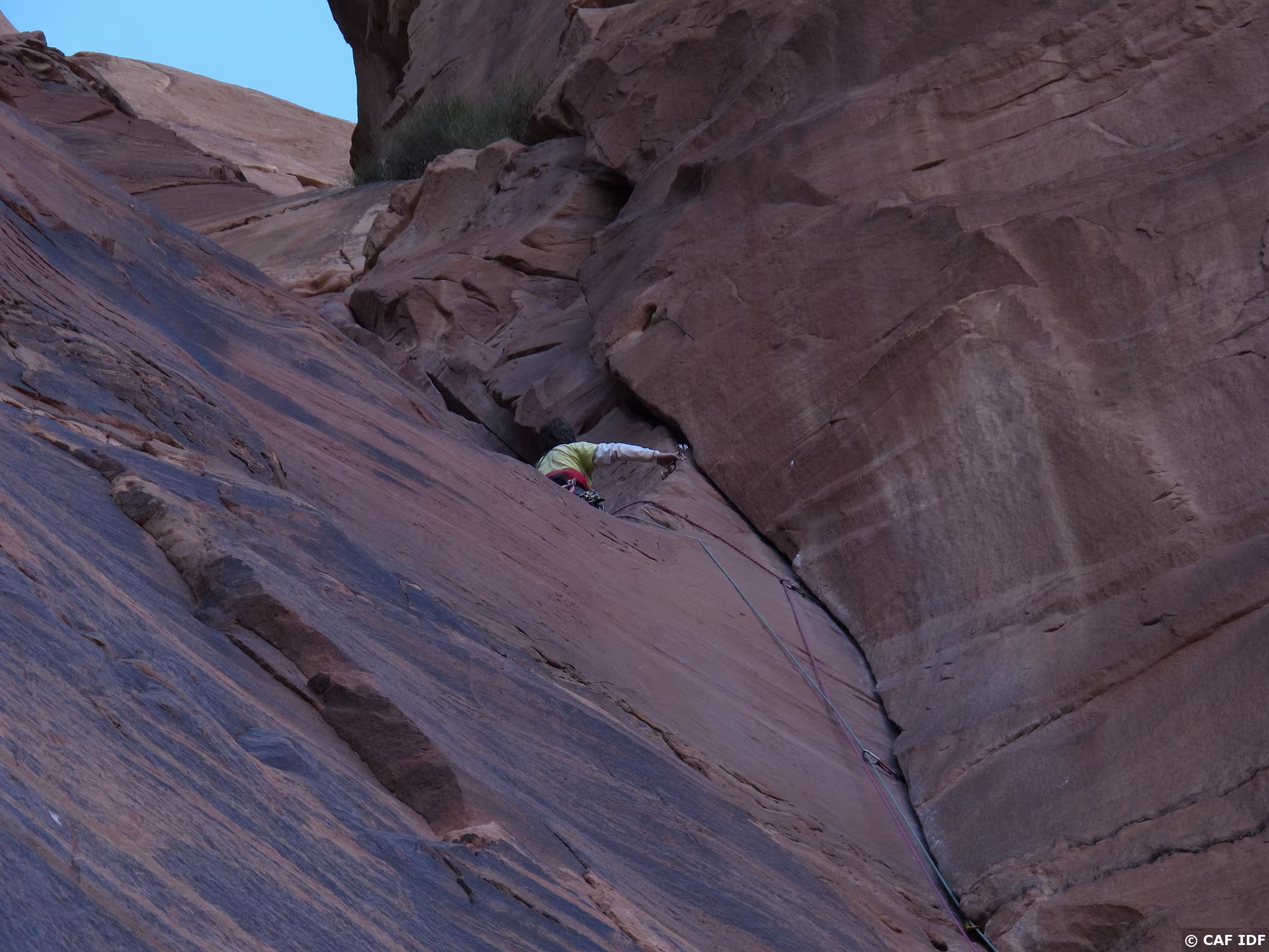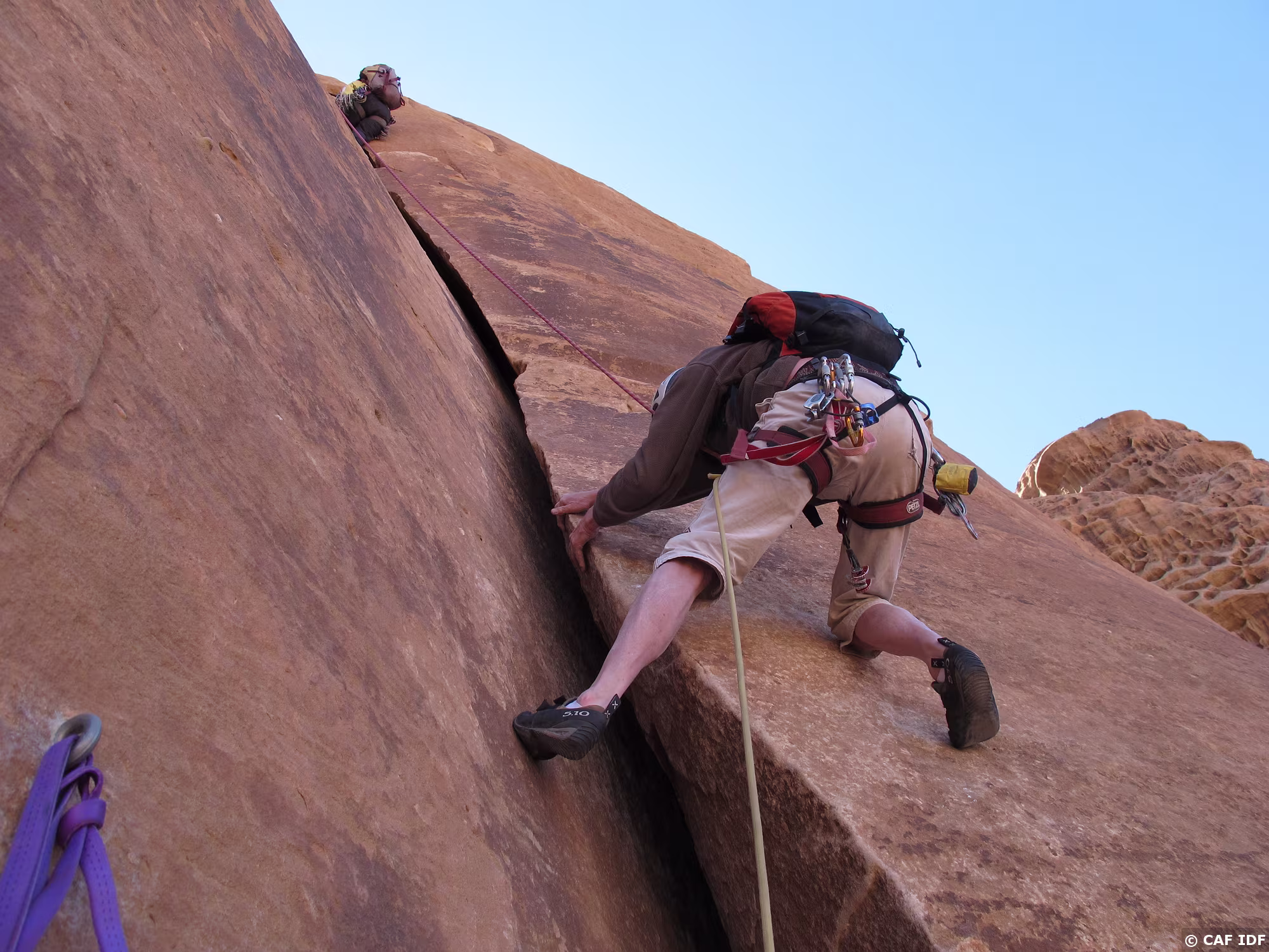 Noter le coinceur placé dans la fissure à droite et au-dessus de la large vire de sortie