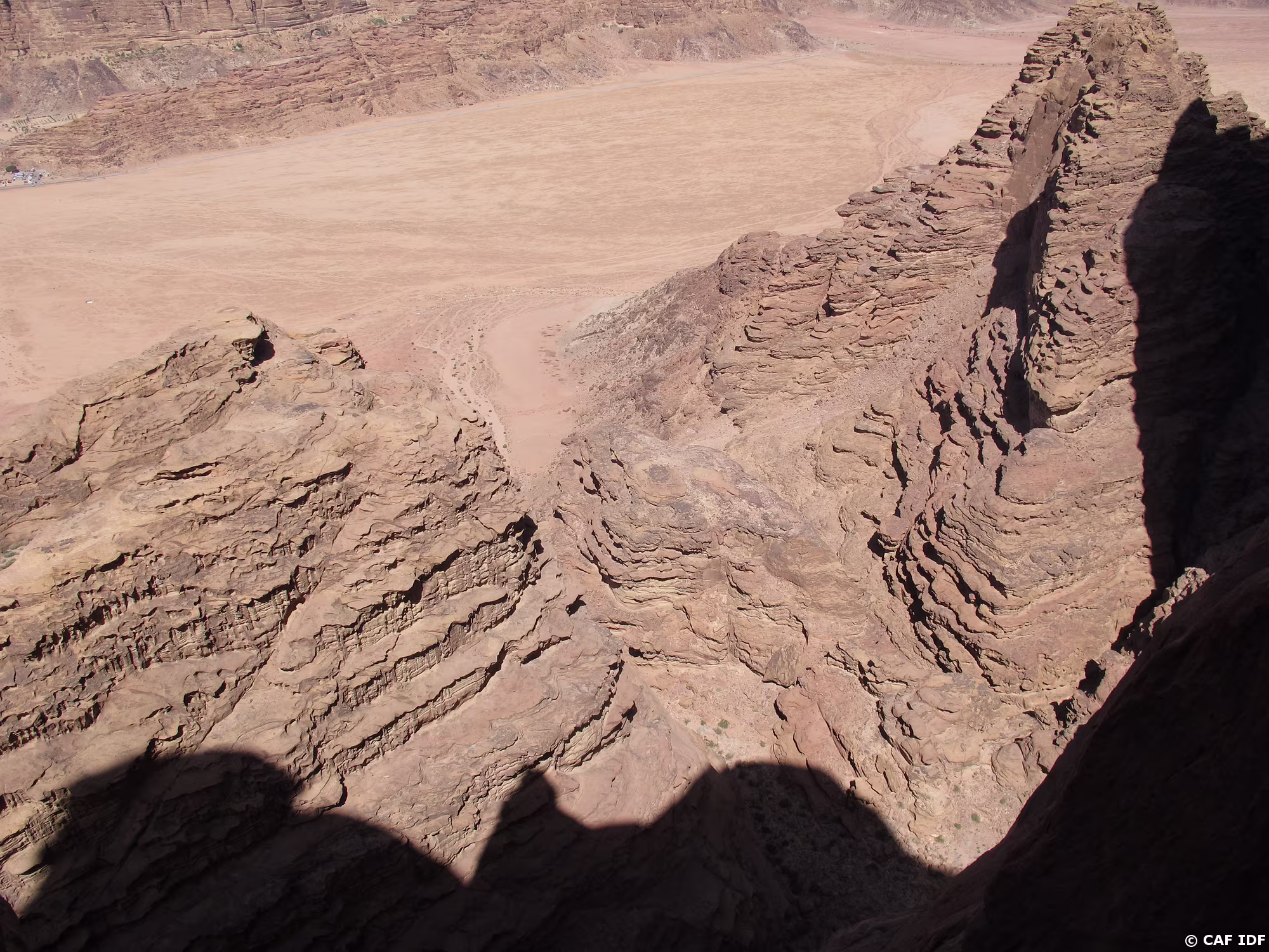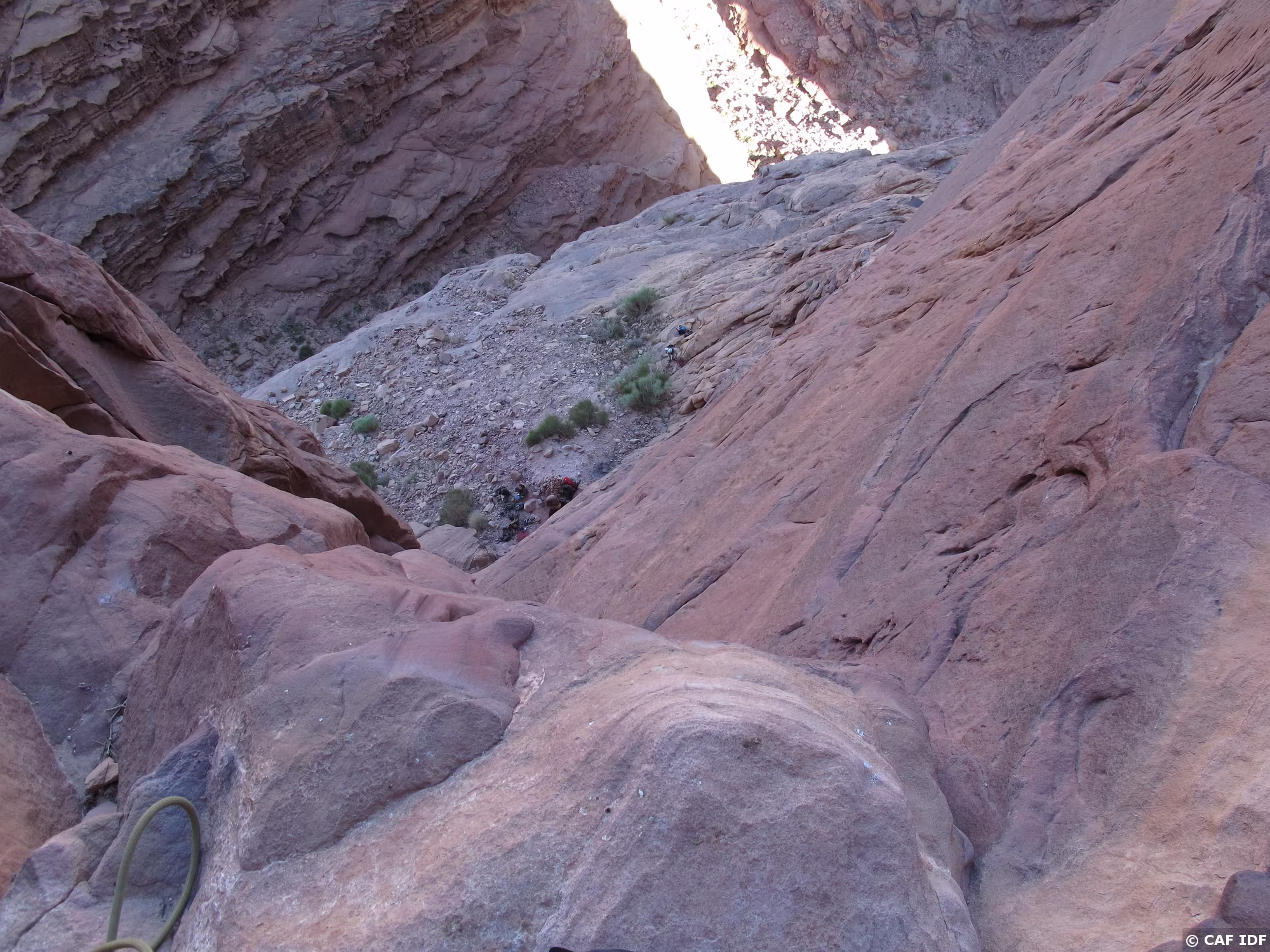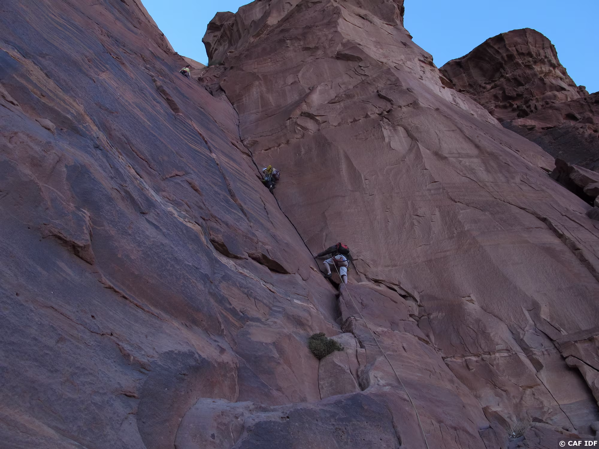 De R2, vue sur la vire où s’équipe une cordée de jeunes grimpeuses israéliennes