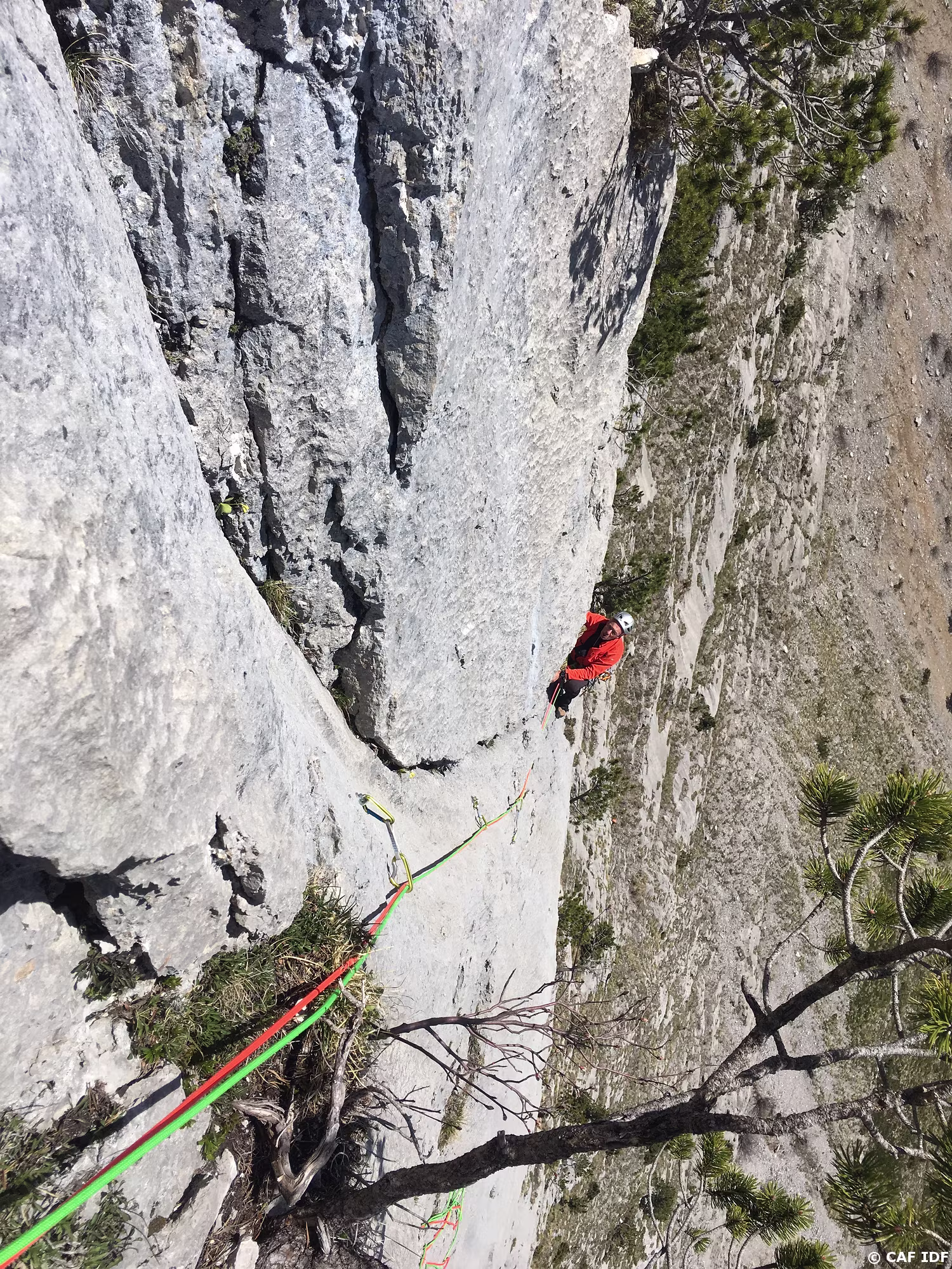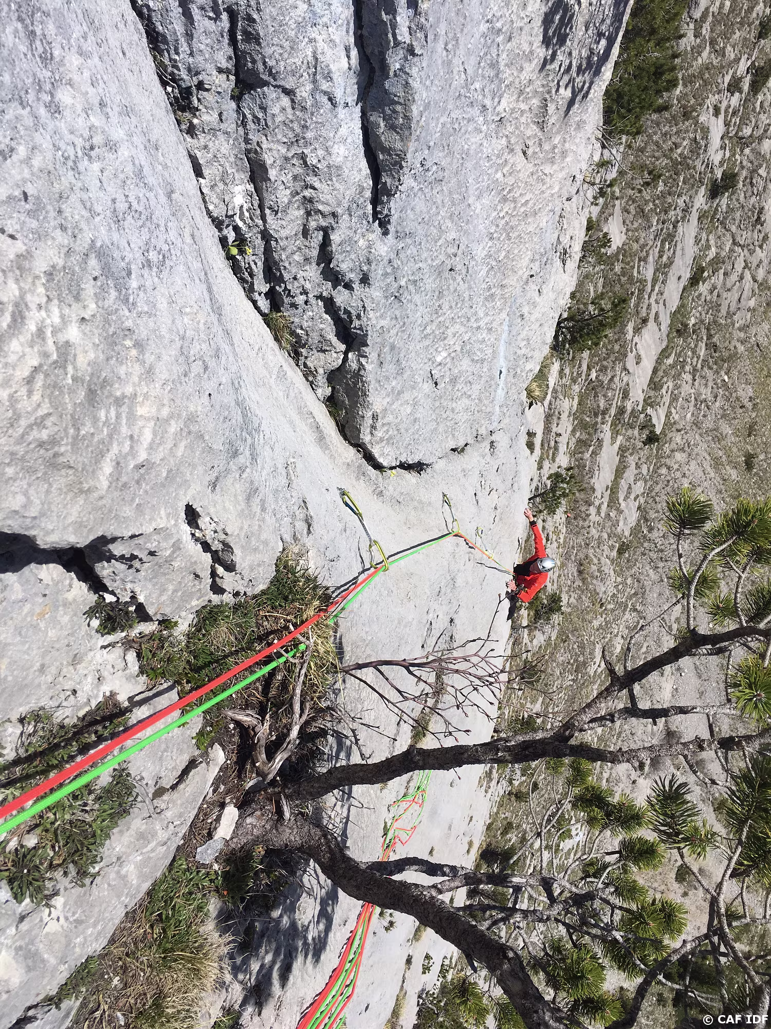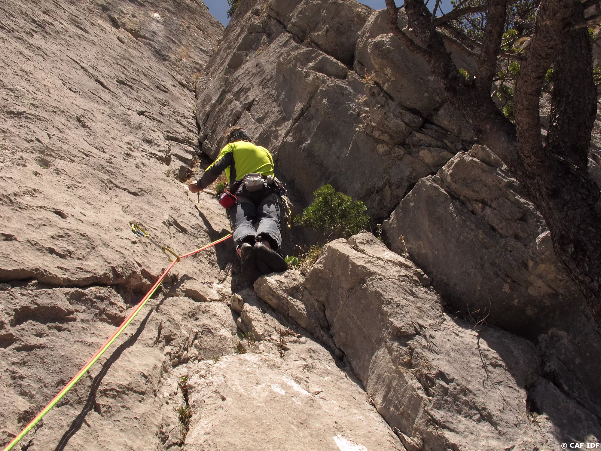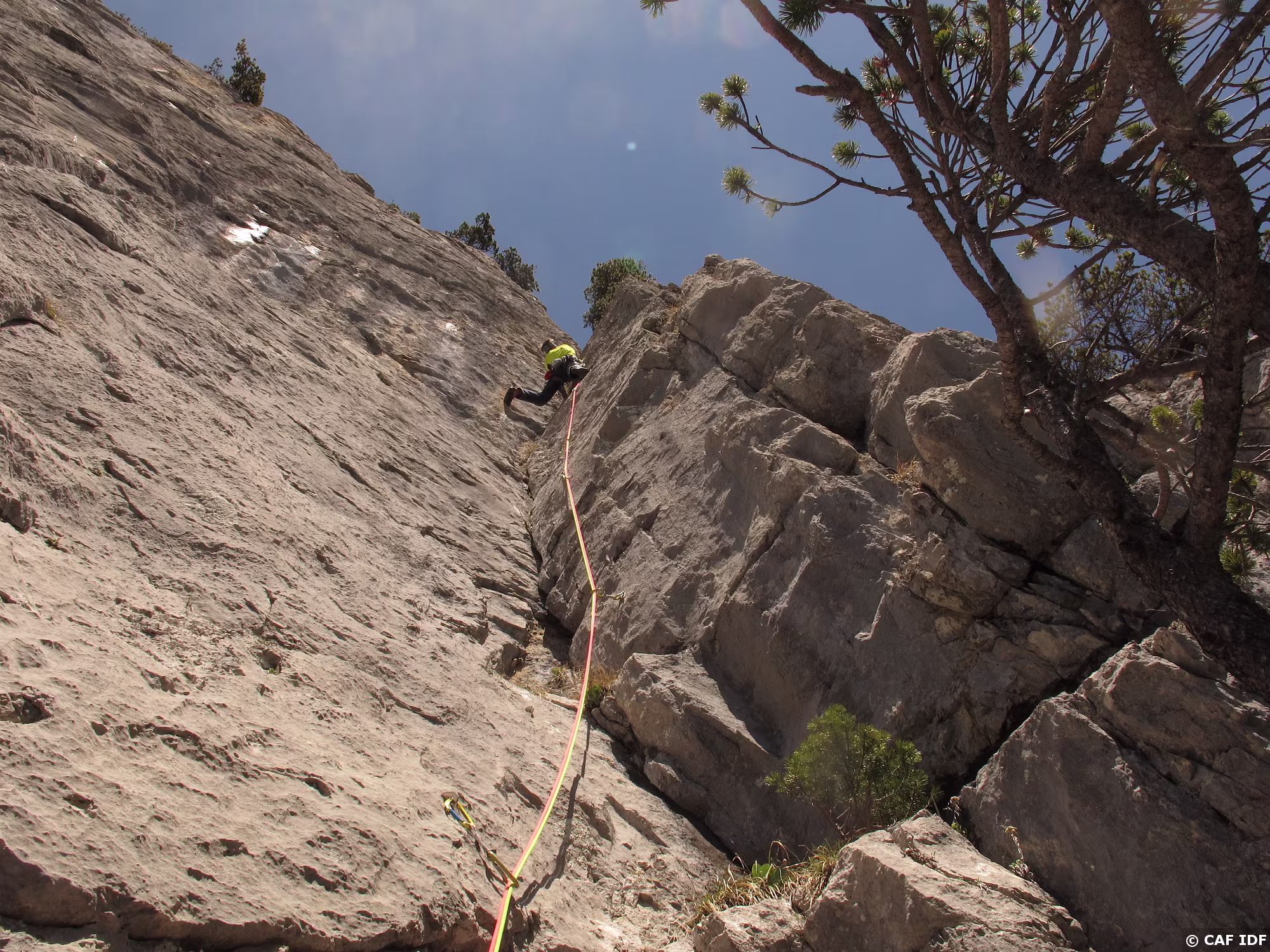 A la sortie du dièdre, l’arbre où certains s’aventurent à installer un relais non obligatoire