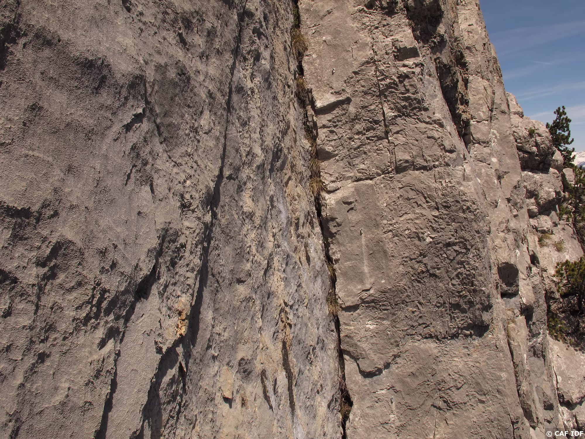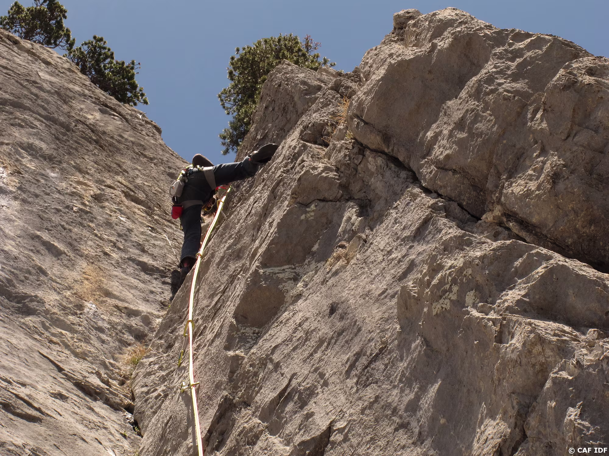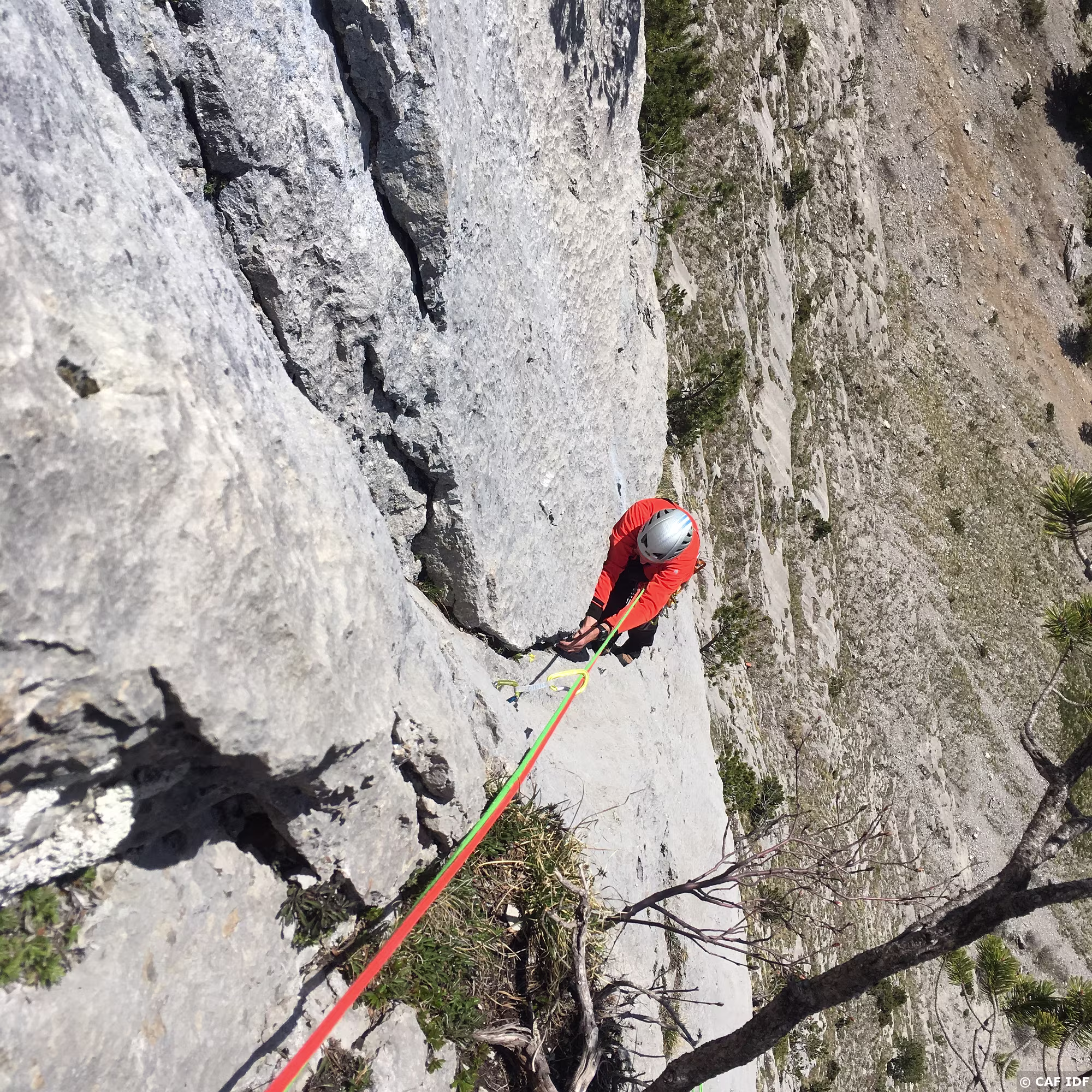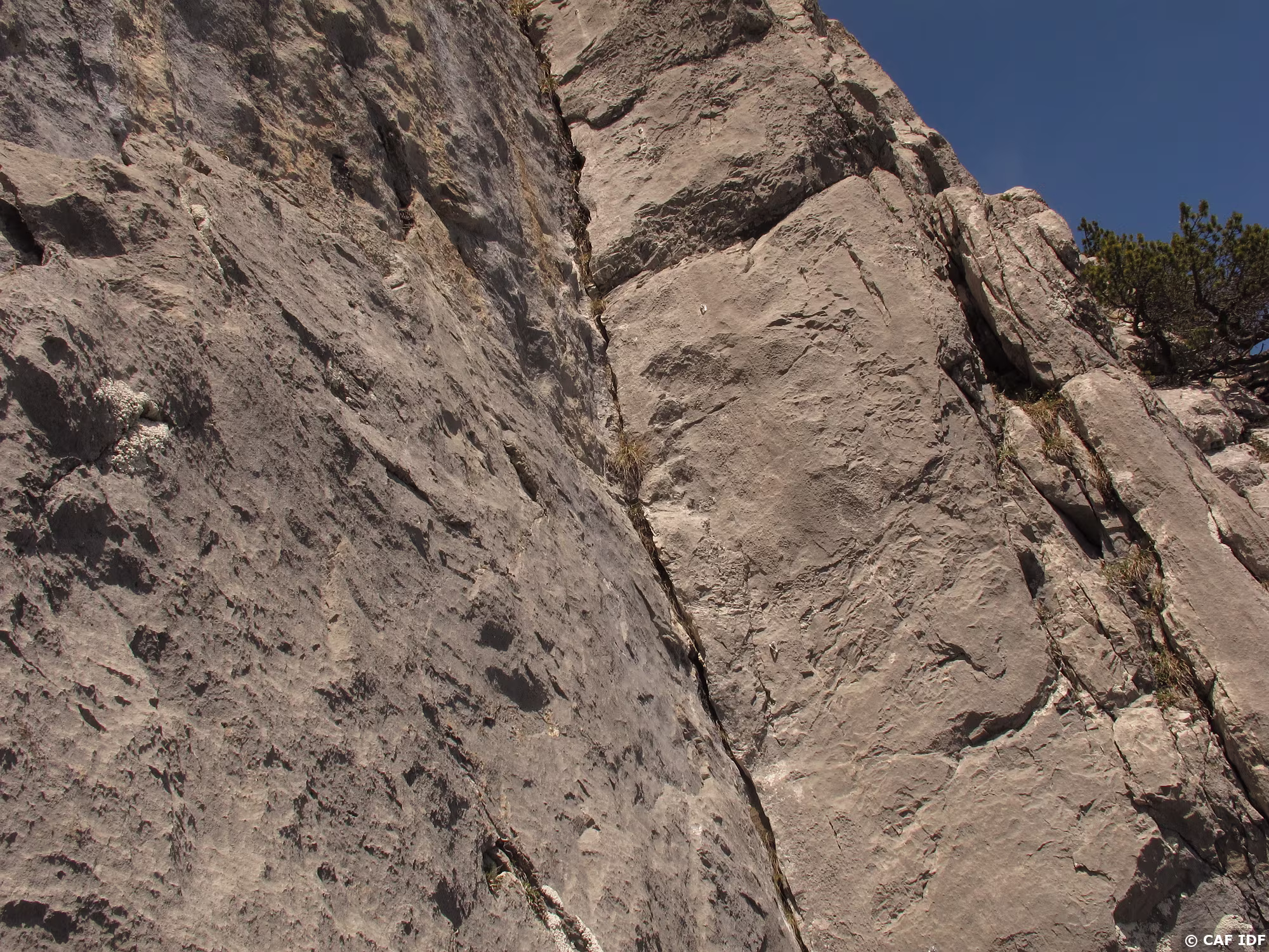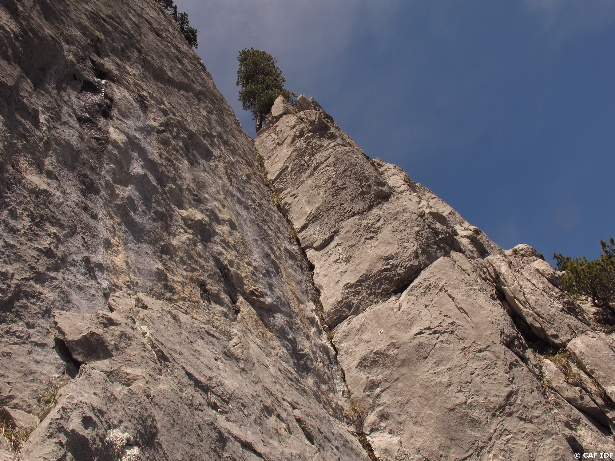 A la sortie du dièdre, l’arbre où certains s’aventurent à installer un relais non obligatoire