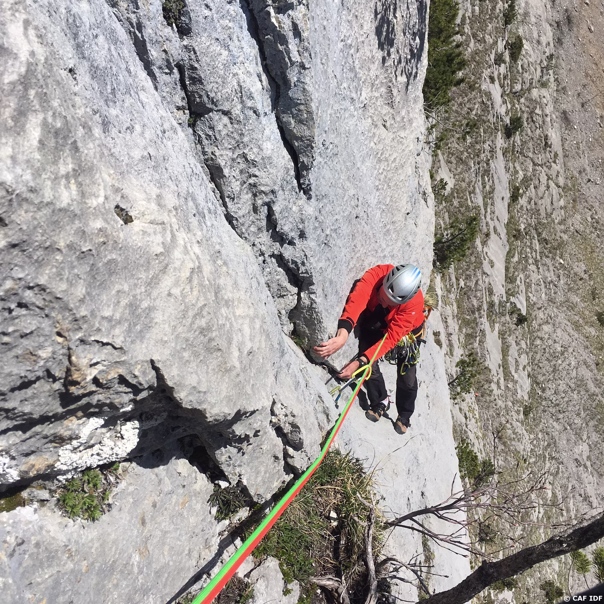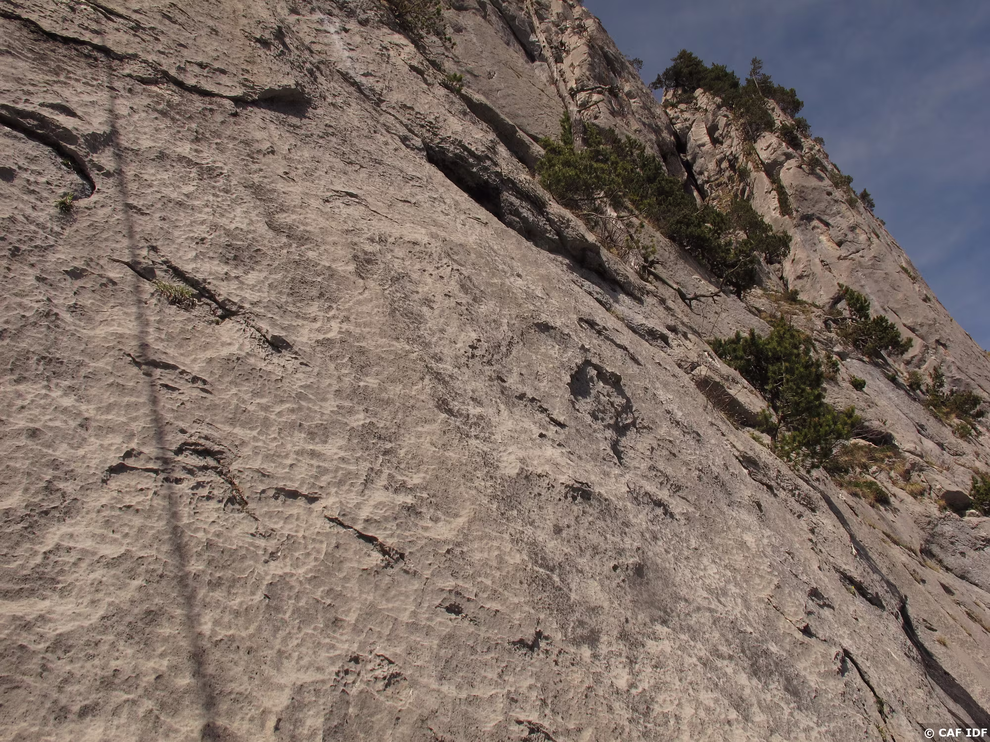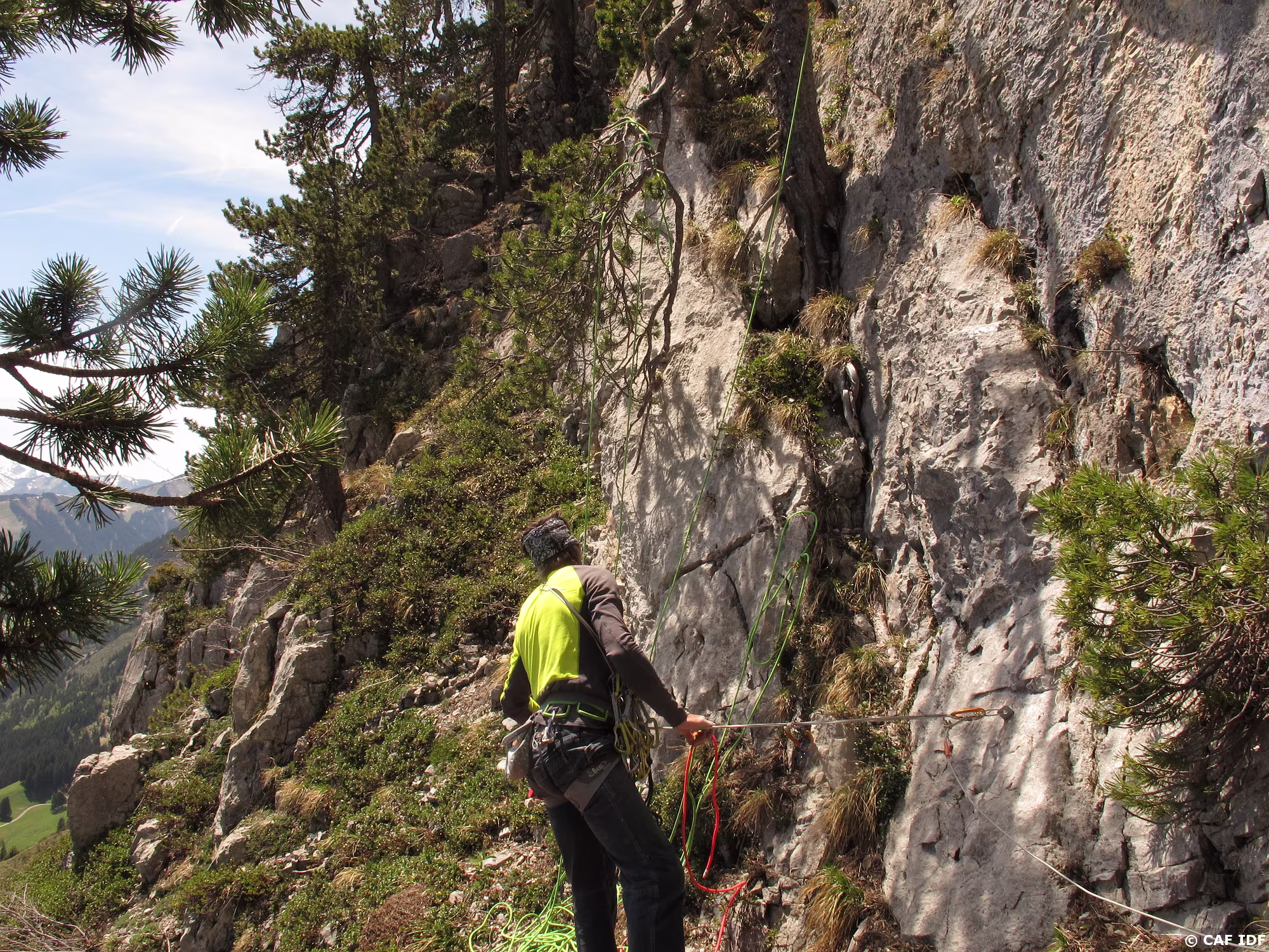 Suivre la vire protégée par une corde fixe sur 20m à gauche pour gagner le jardin arboré de R5