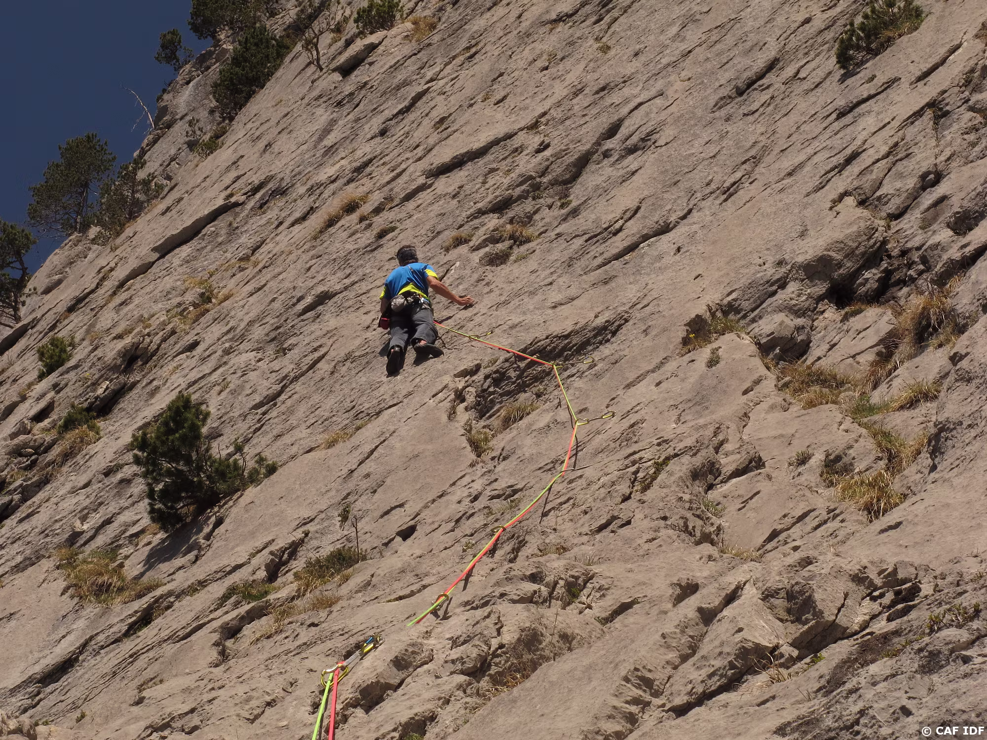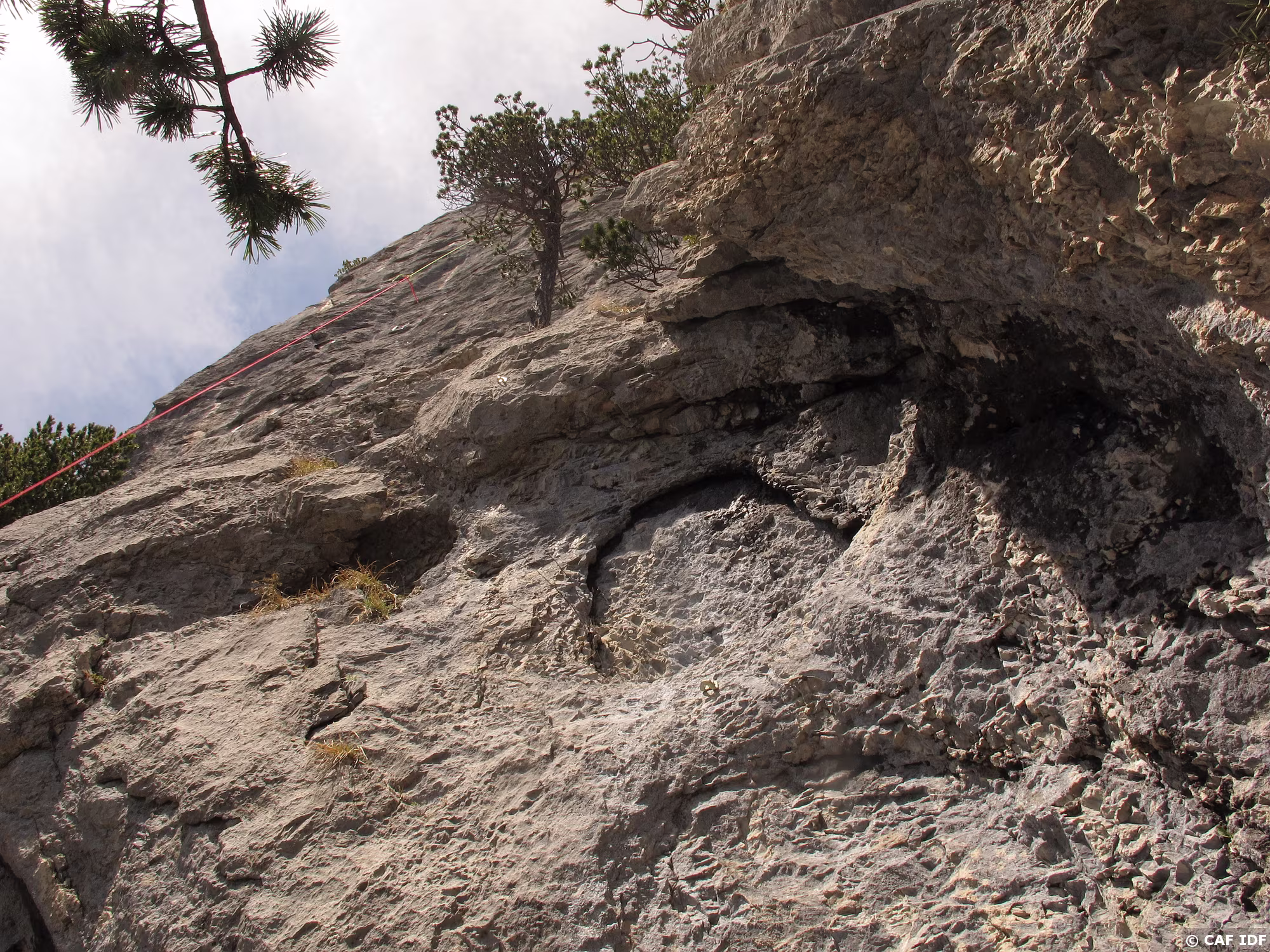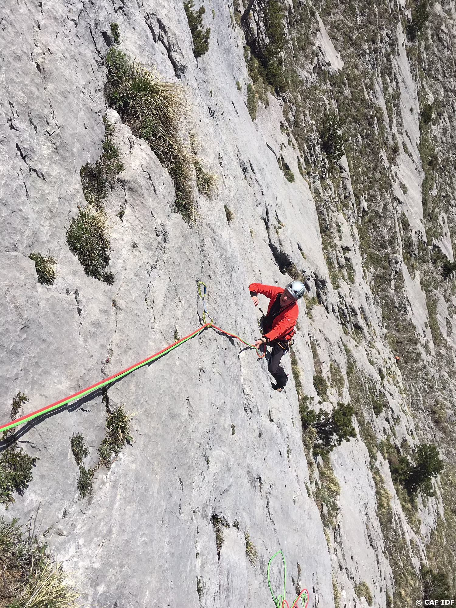 Suivre la vire protégée par une corde fixe sur 20m à gauche pour gagner le jardin arboré de R5