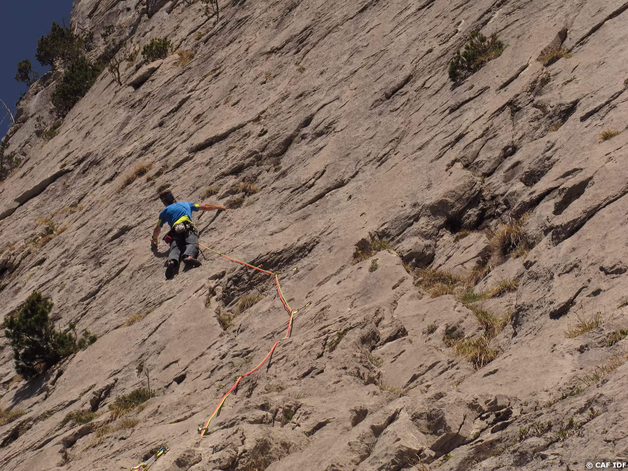 009 Pierre engagé dans L2, le crux en 6b de Bison Futé. Très beau mur bien raide