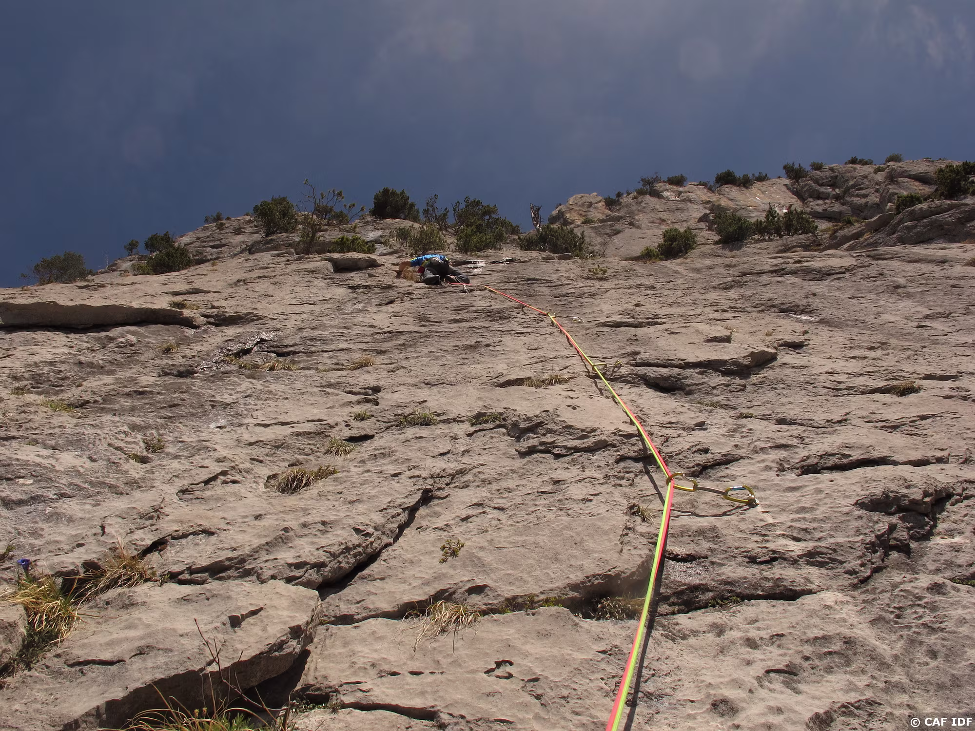L’arête terminale encombrée d’arbustes qui amène aux 2 spits chainés de R7