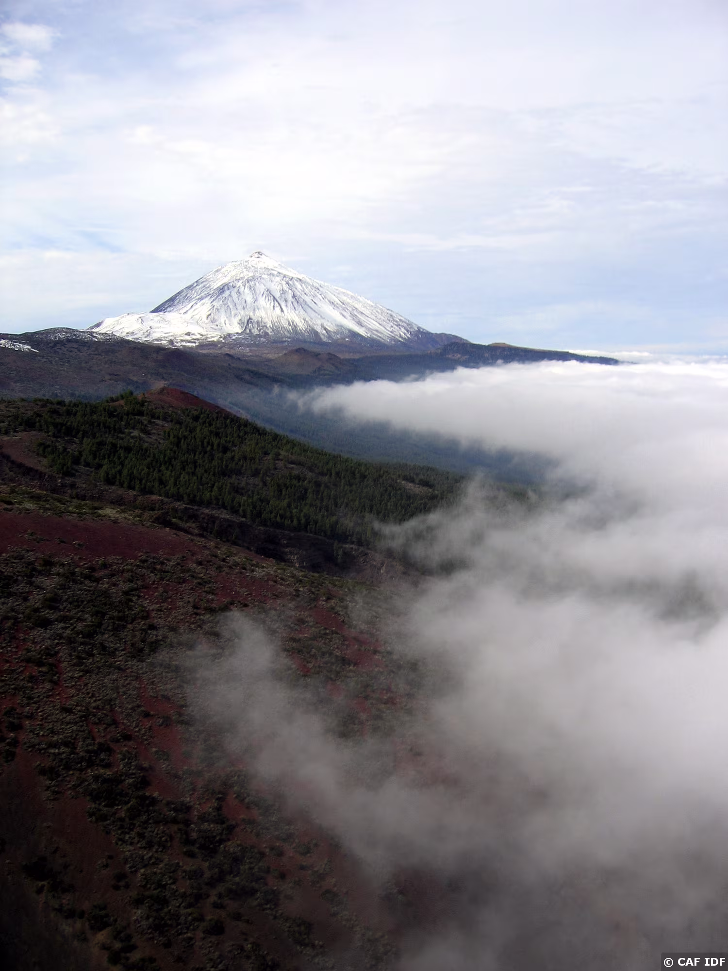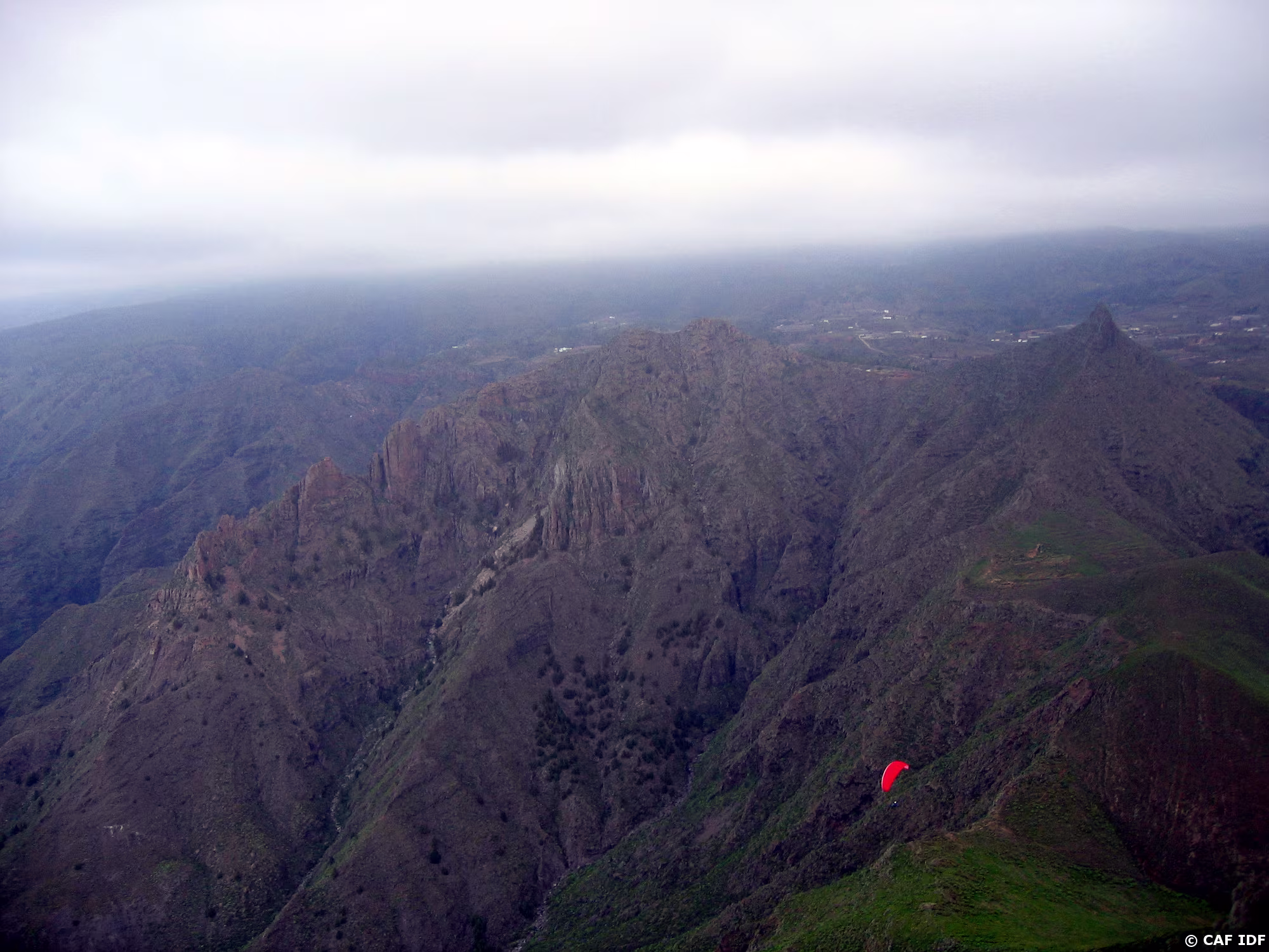 Depuis le Conde, au ras du nuage, vue sur le déco d'Ifonche et la crête de los Dedos.
