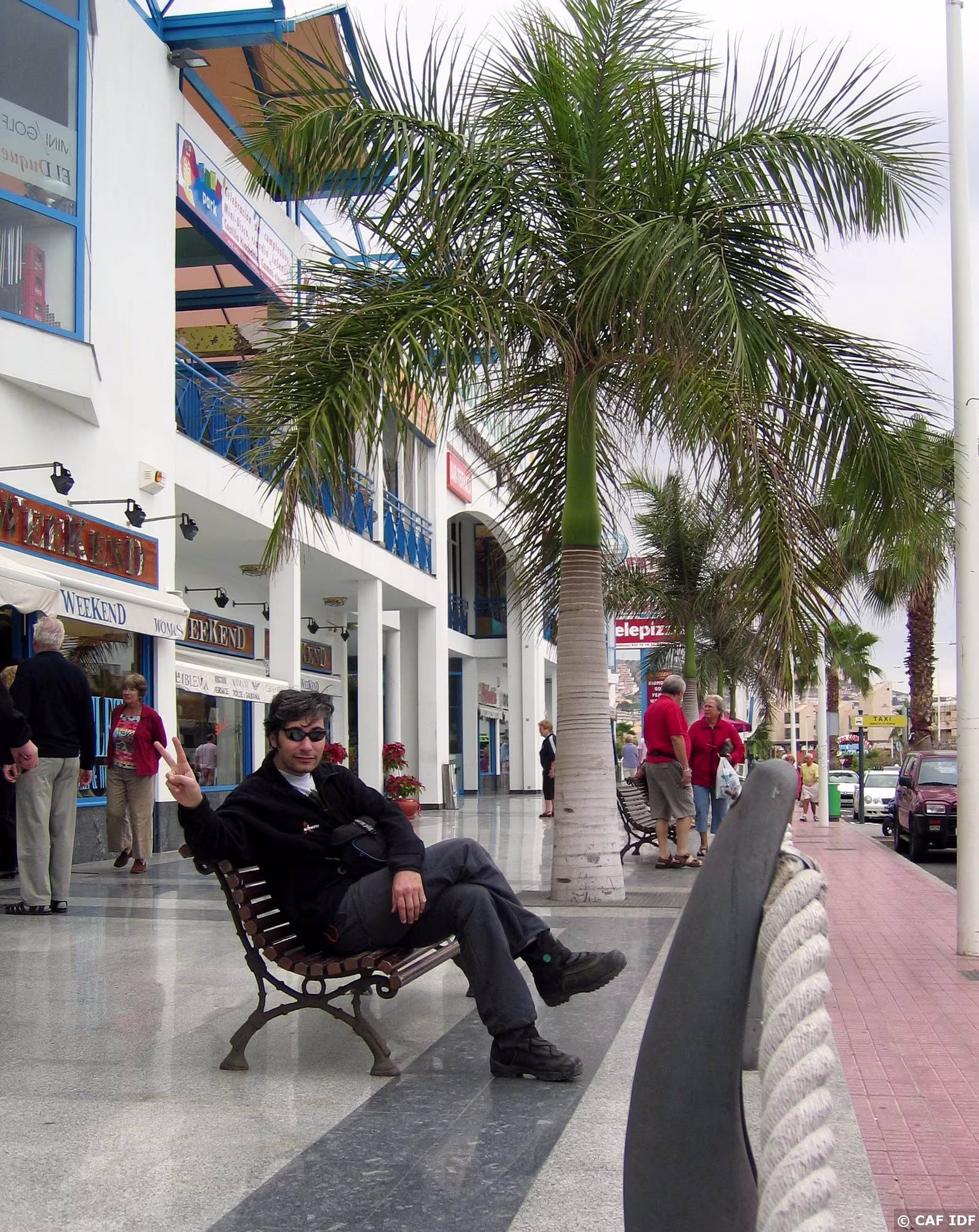 Pierre sur un banc, à "Las Americas", cité balnéaire très touristique.