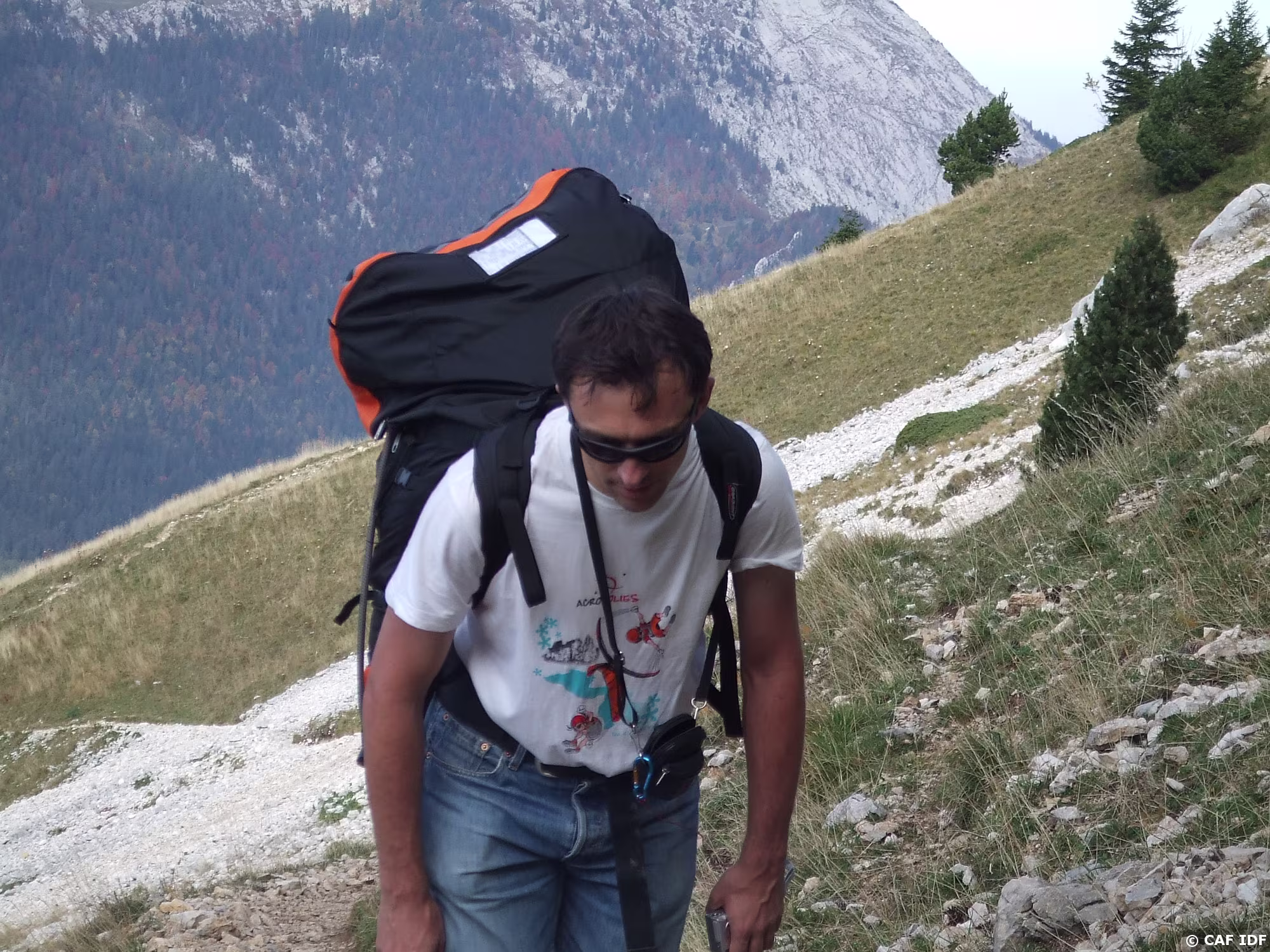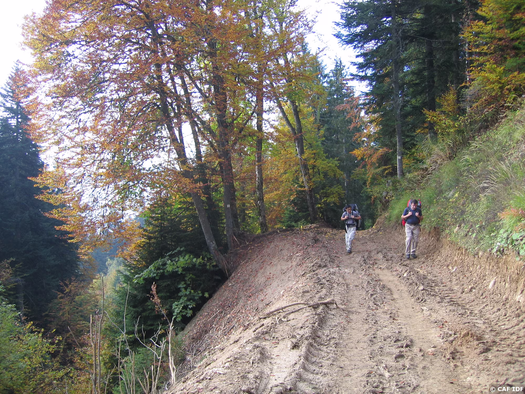 Marc et Henri sur une piste forestière, le samedi matin, parapente au dos.