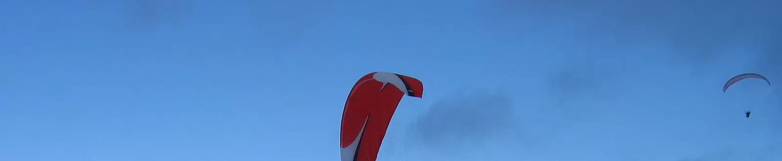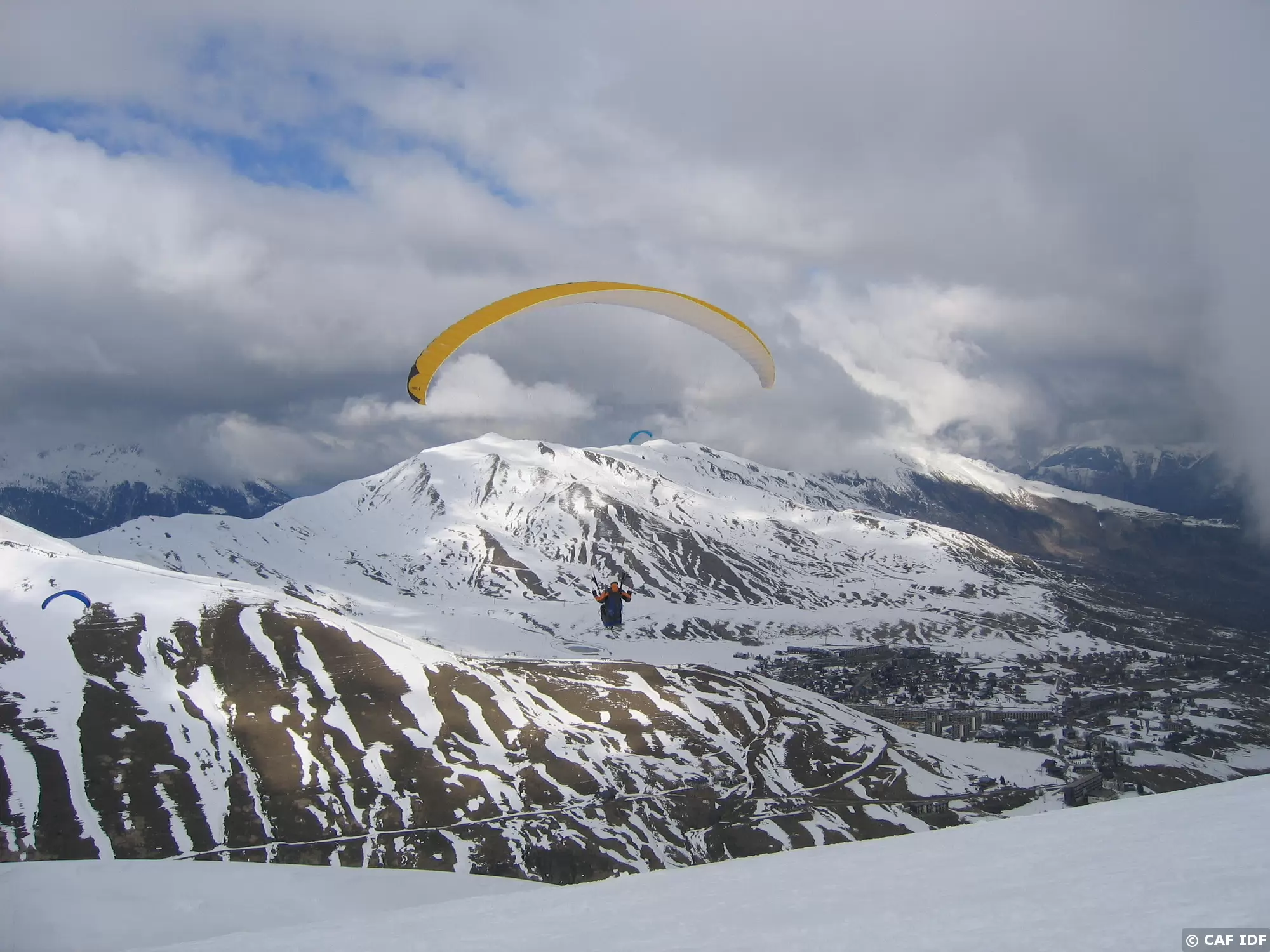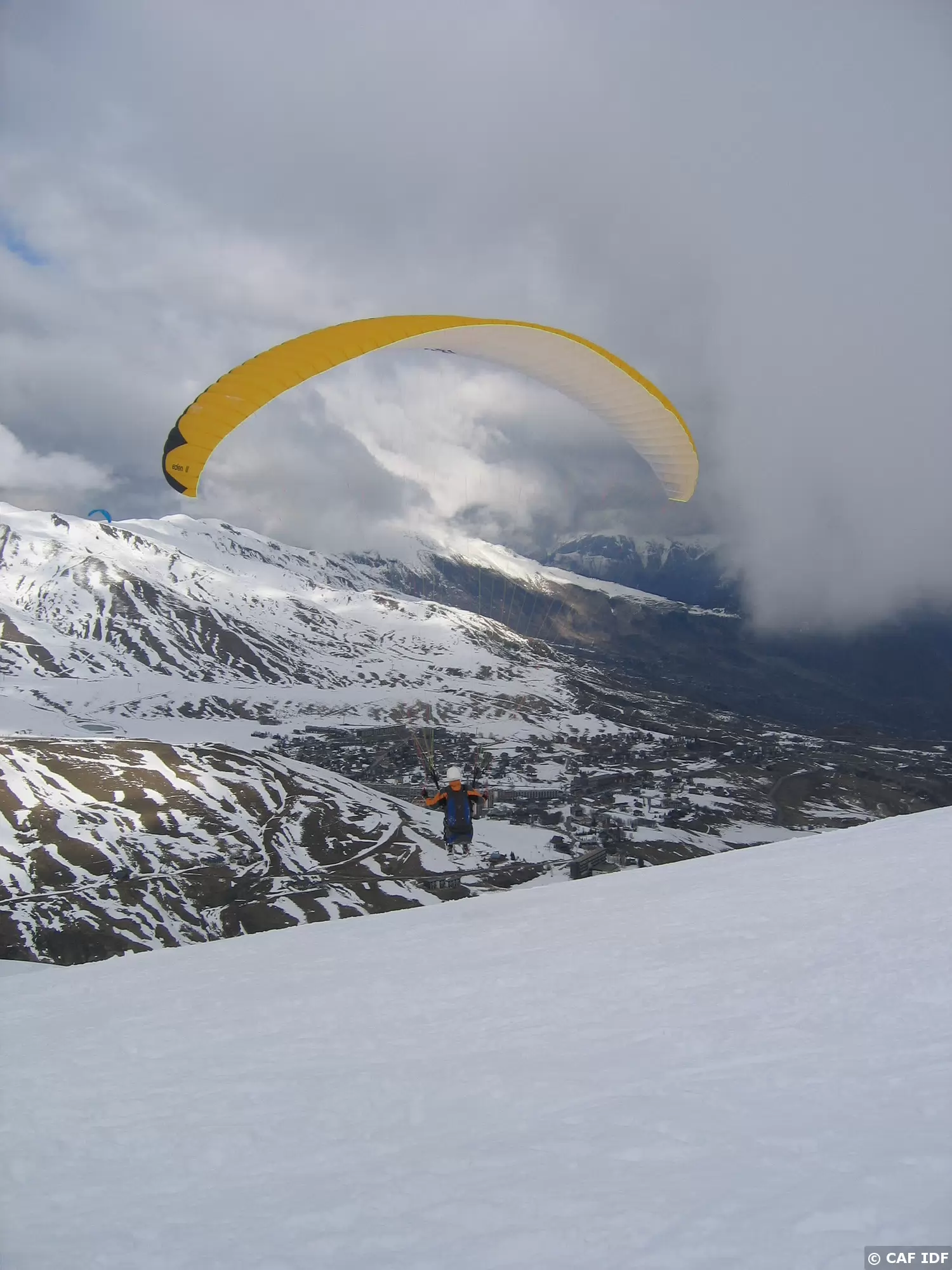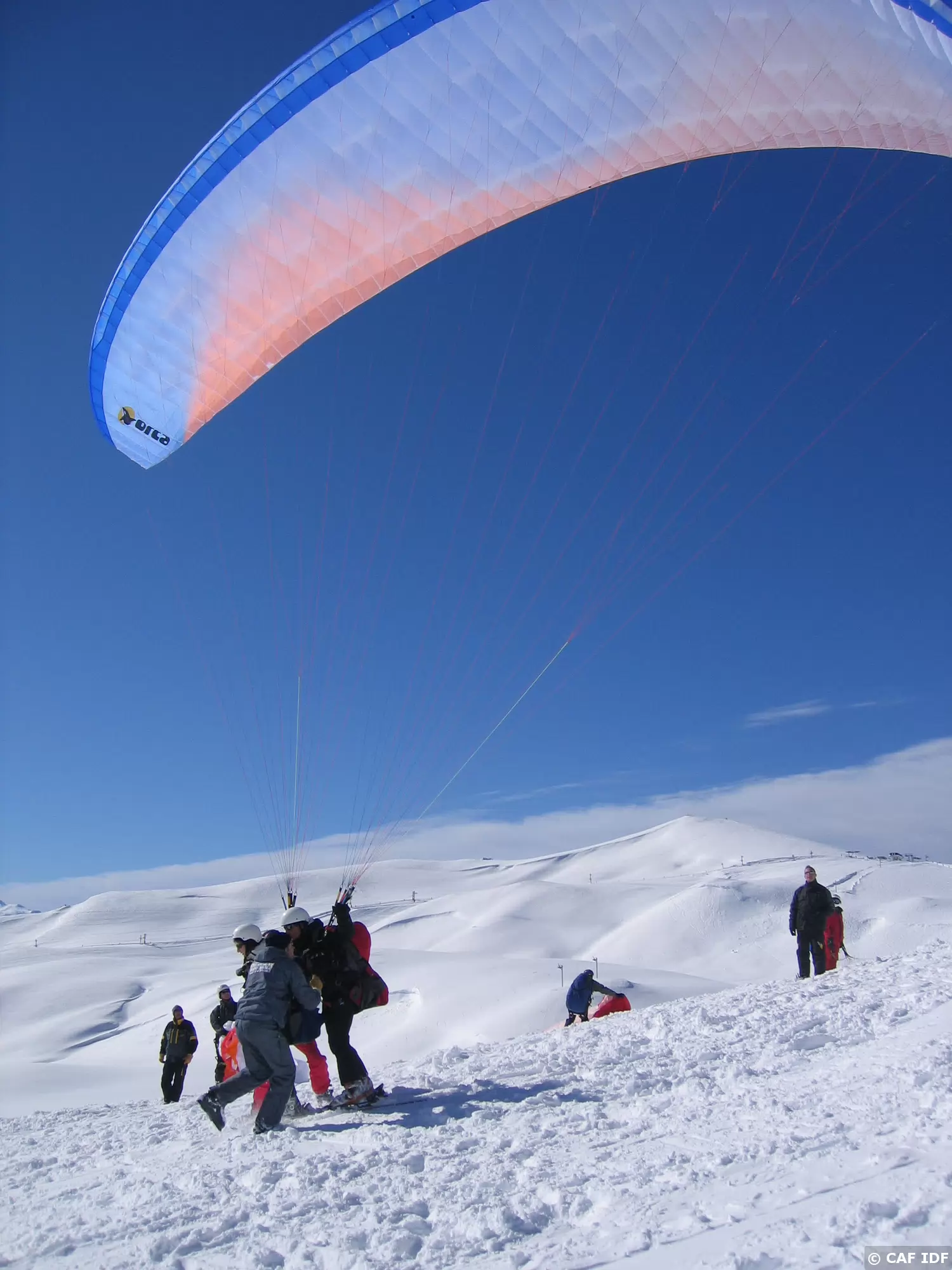 Décollage à ski d'un parapente biplace...