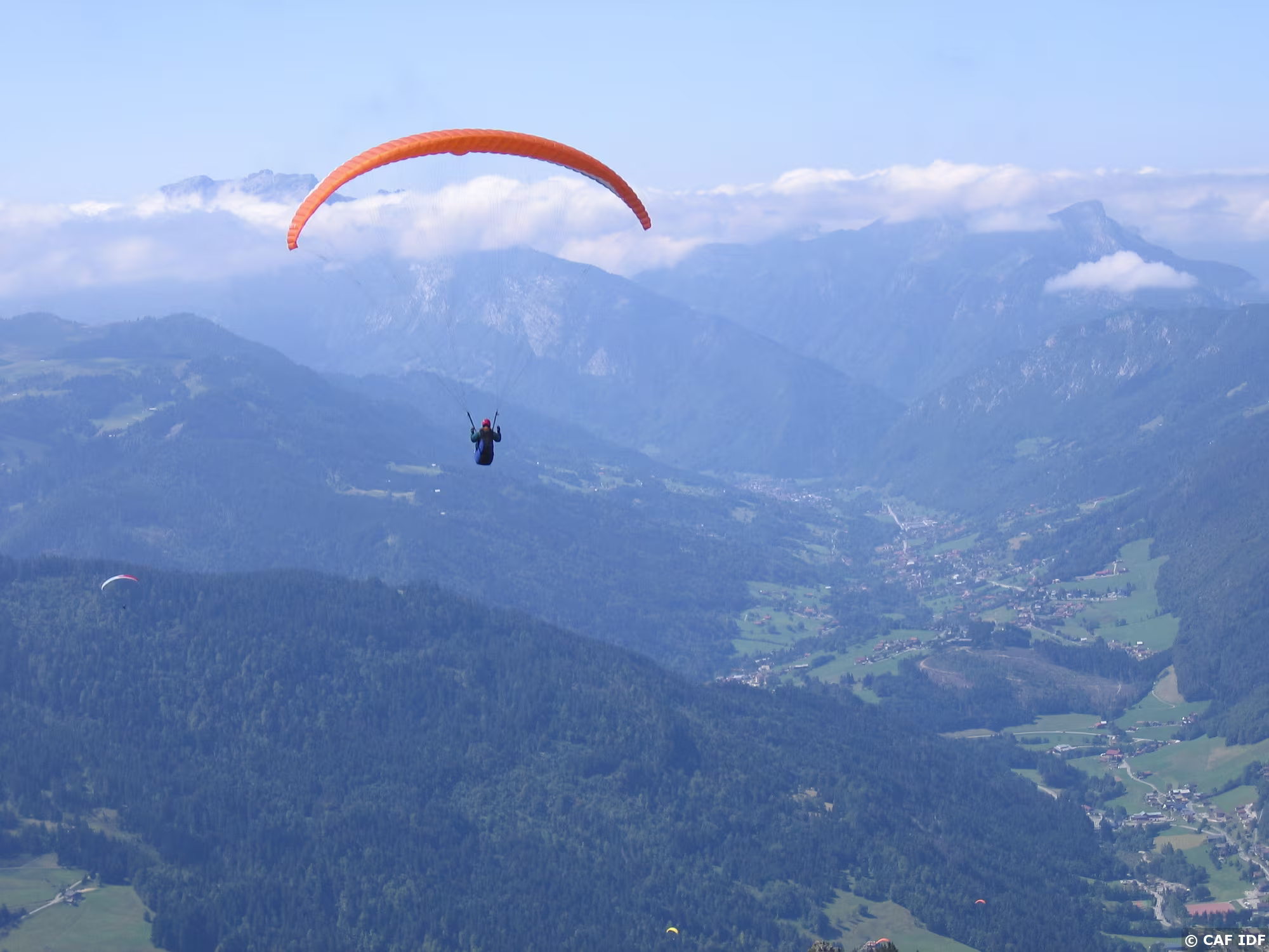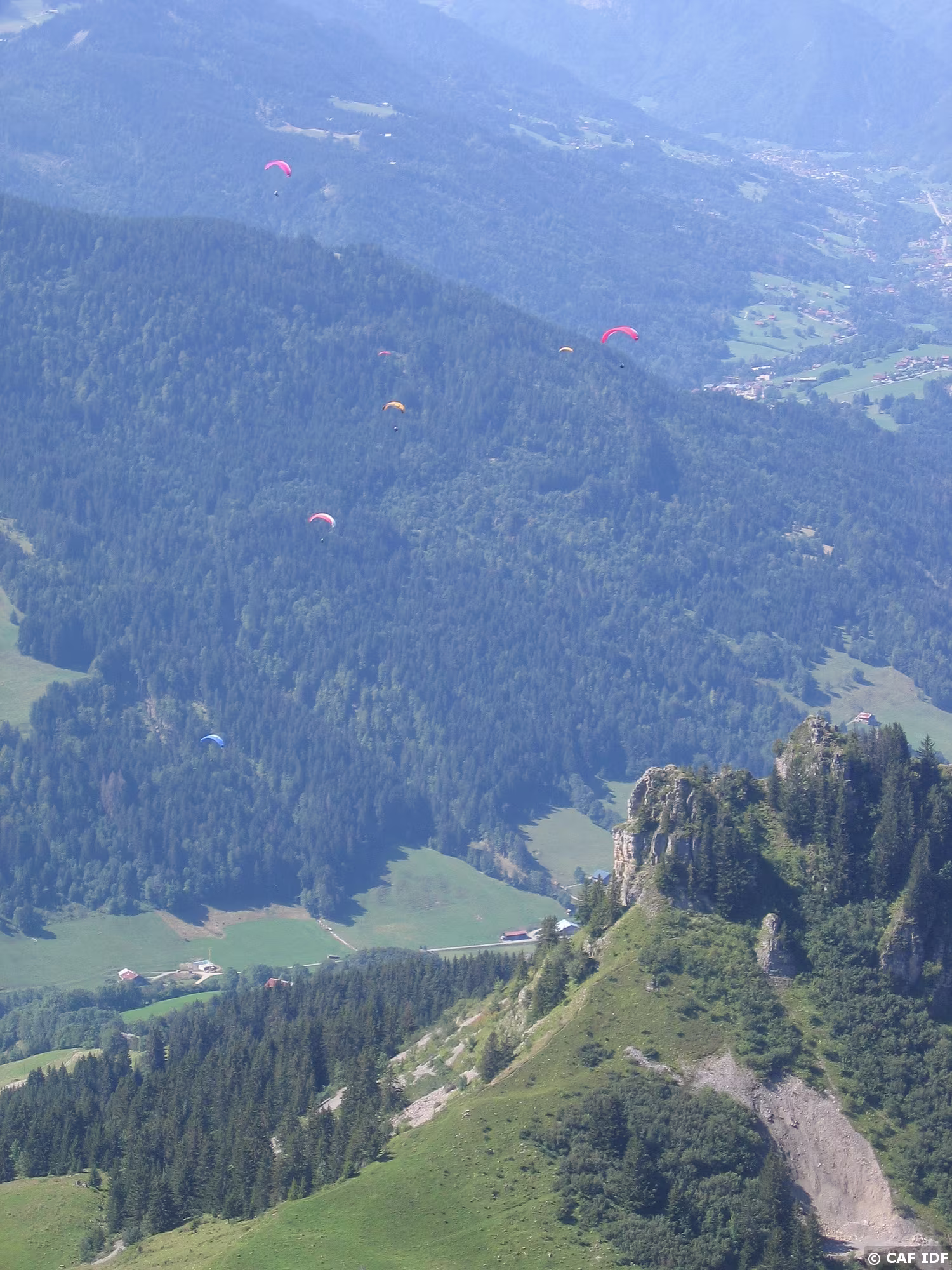Jean s'éloigne au-dessus du village du Grand-Bornand, vers la vallée de Thônes.