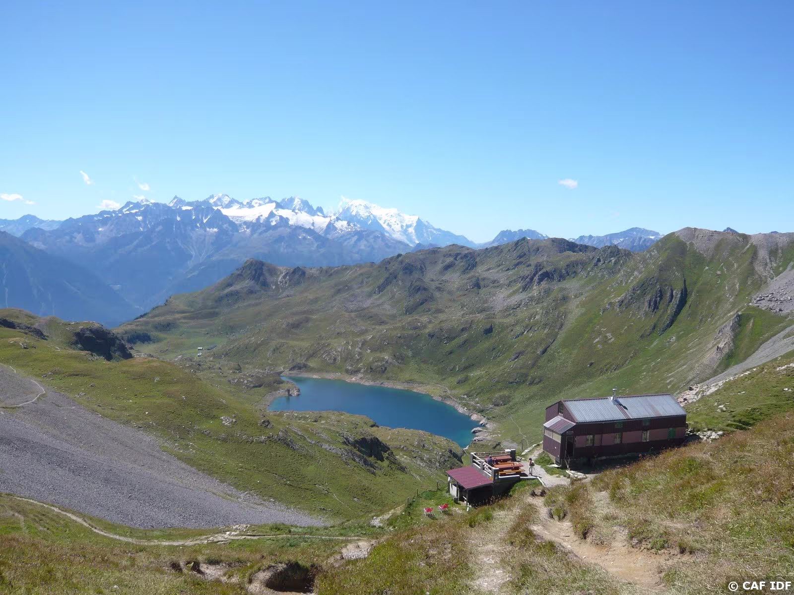 Cabane de Fenestral, lac de Fully et massif du Mont-Blanc.