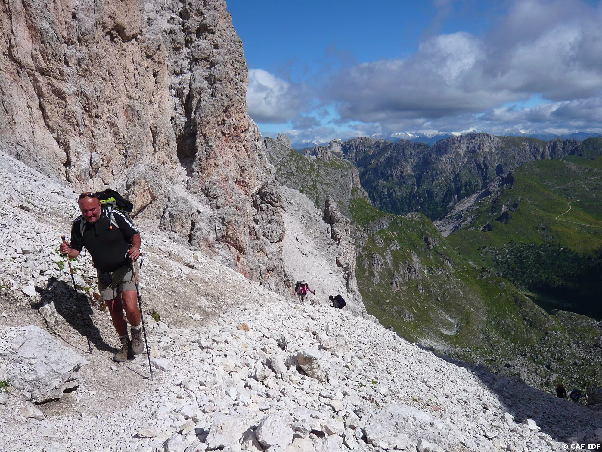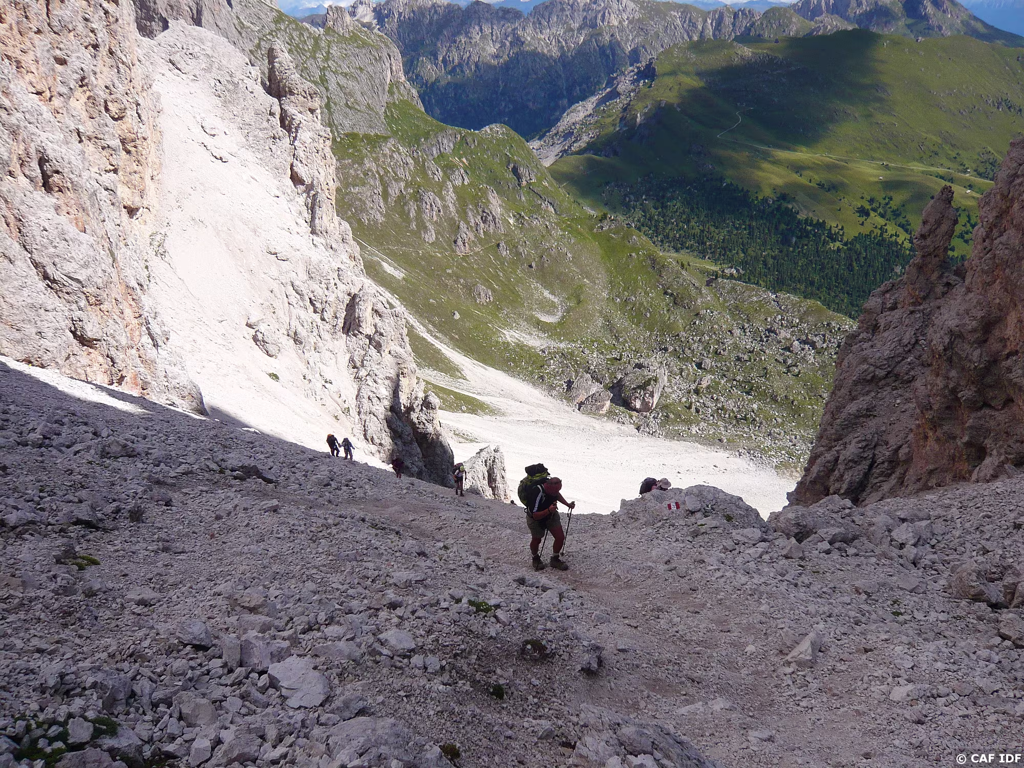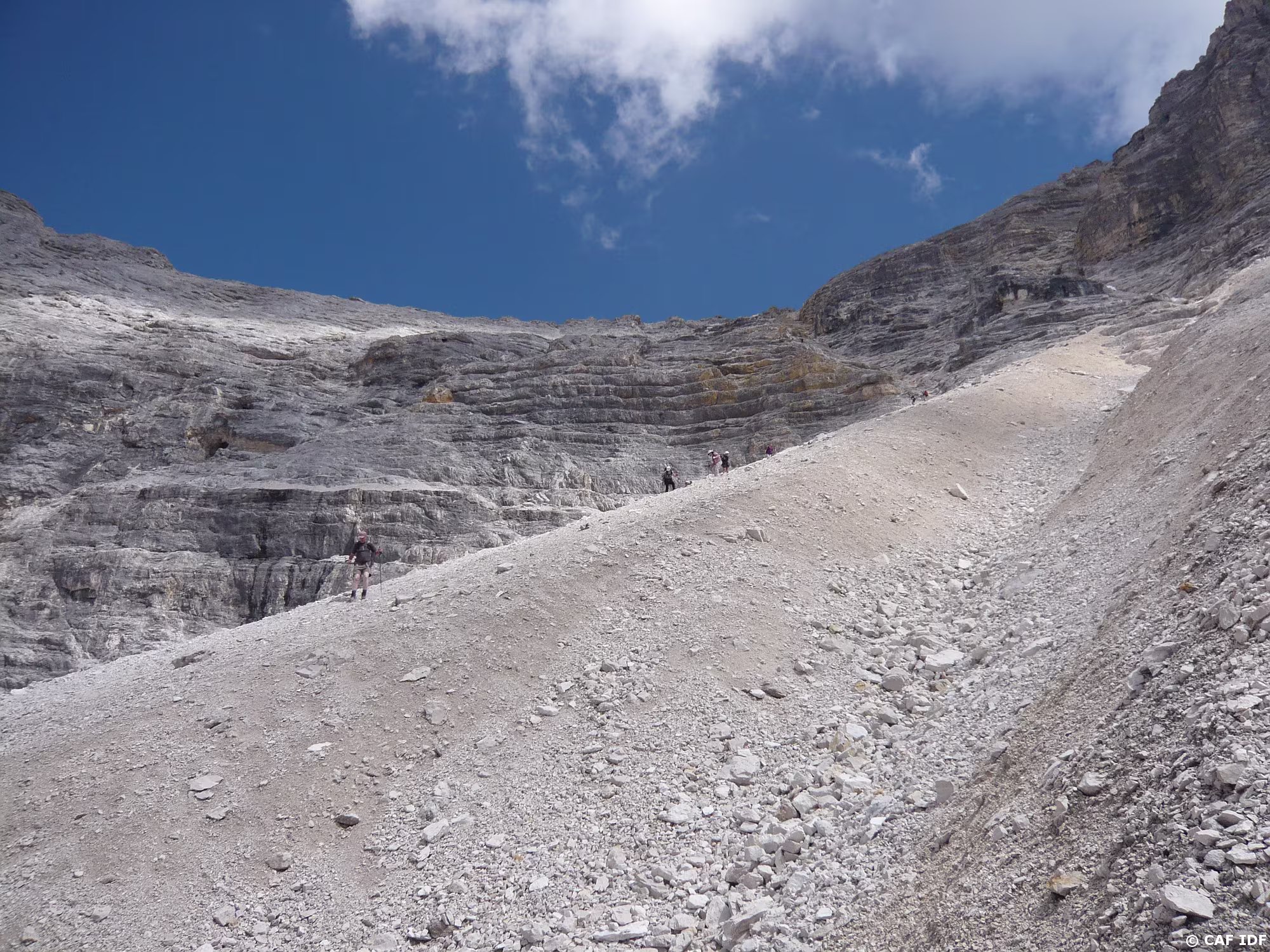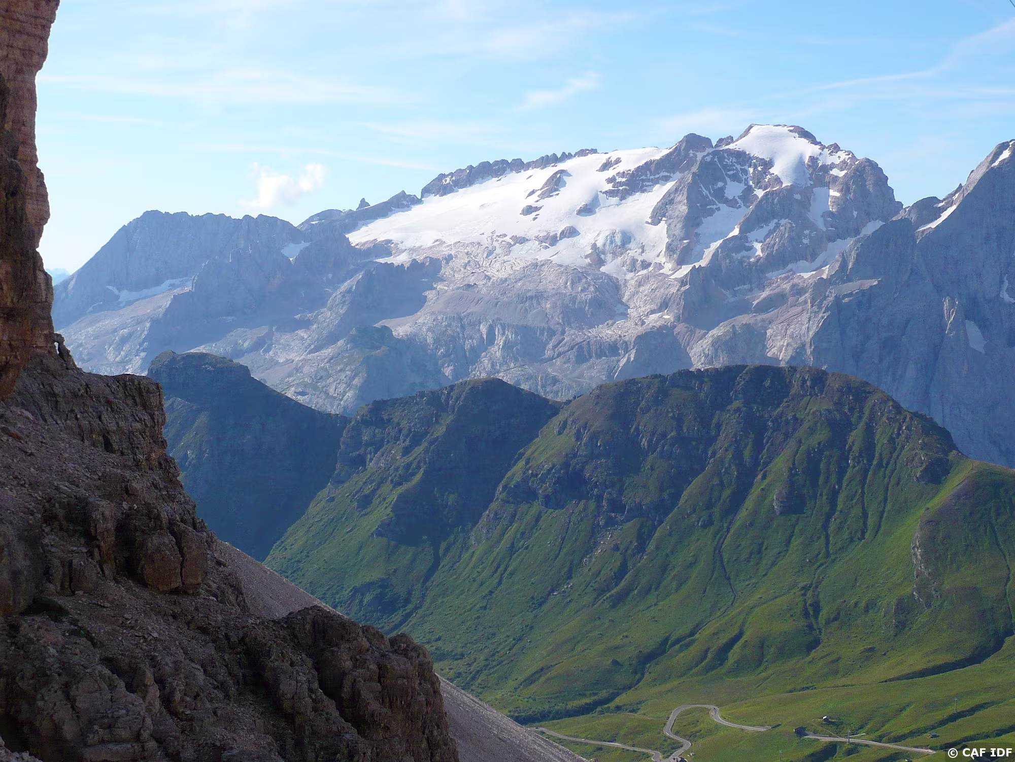 Montée au Piz Boé, la Marmolada derrière.