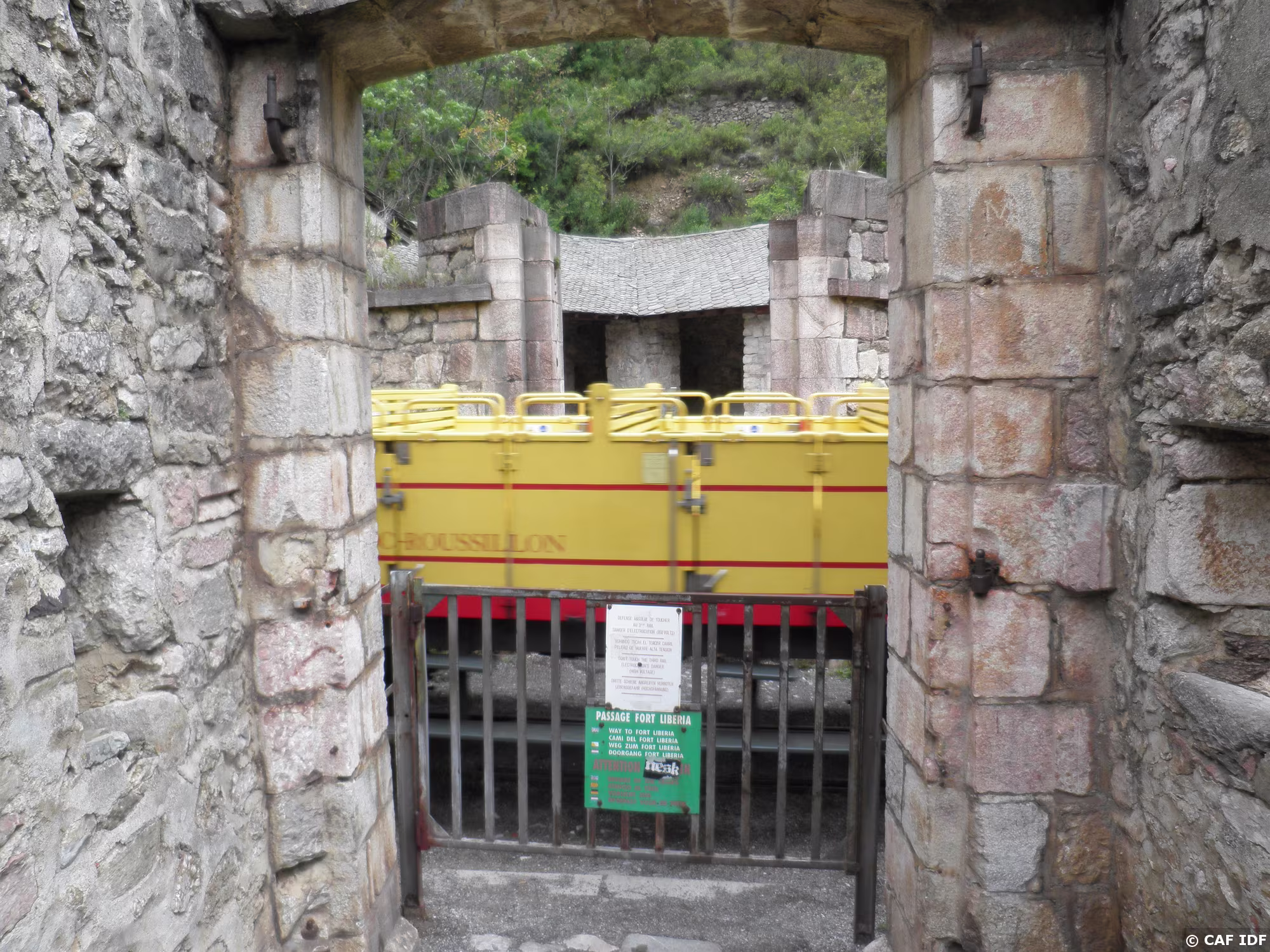une entrée de Villefranche de Conflent, et passage à niveau du train jaune