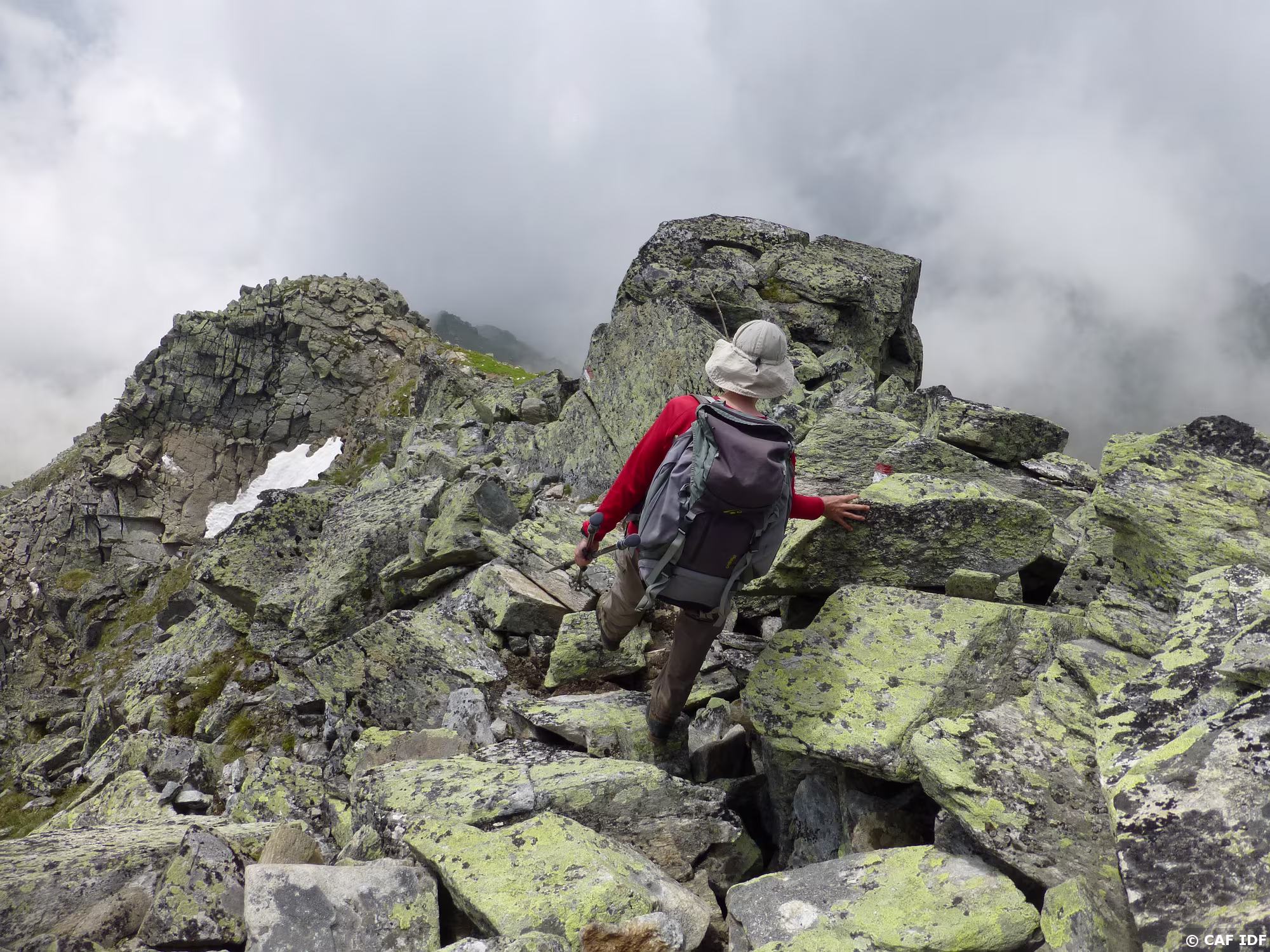 Une arête de pierres de plus en plus grosses pour rejoindre le sommet en arrière plan.
