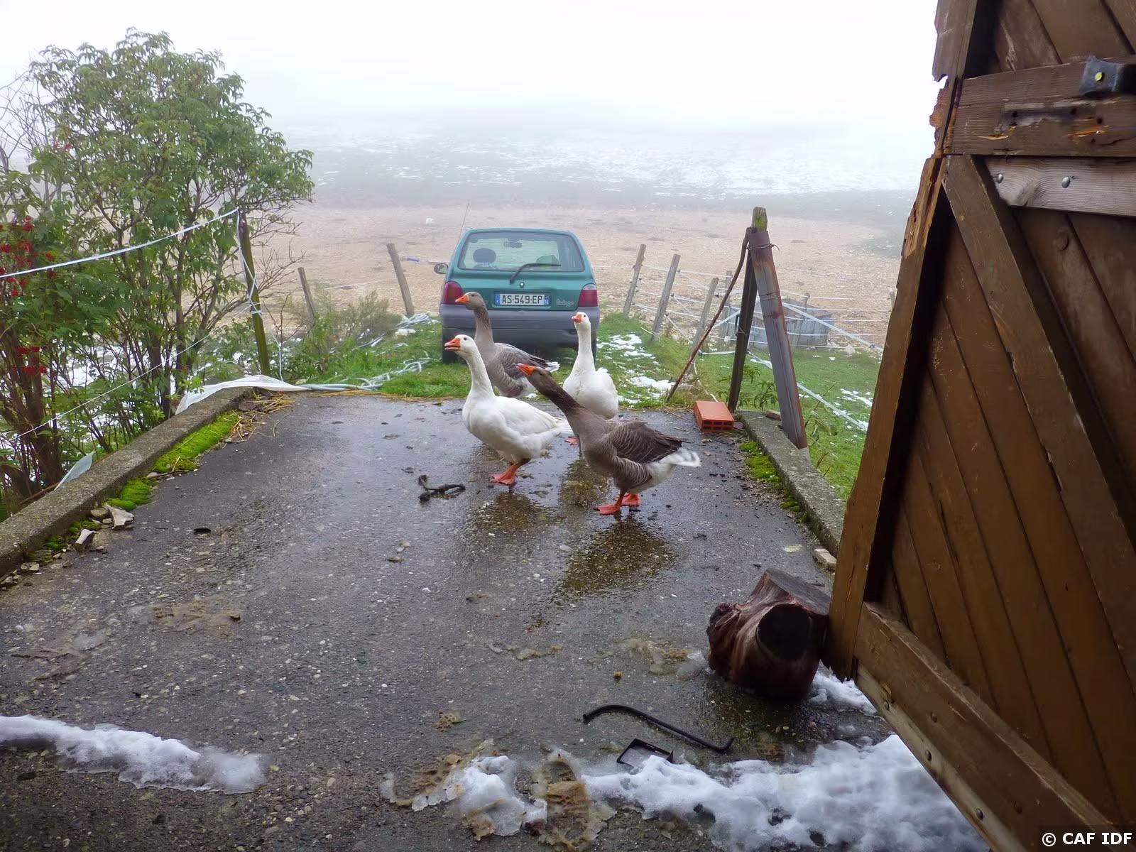 PXL030 Très bon accueil pour un pique-nique à l'abri à Planvanel : les oies nous font la fête