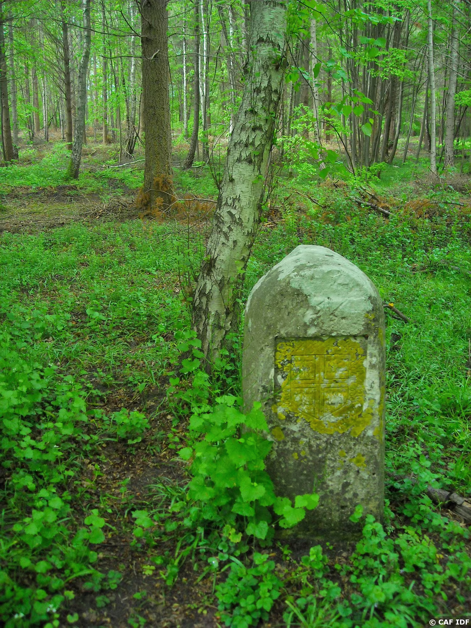 Une des bornes qui jalonnent l'allée Brunehaut. 1573. Armoiries des Condé ou des Montmenrency