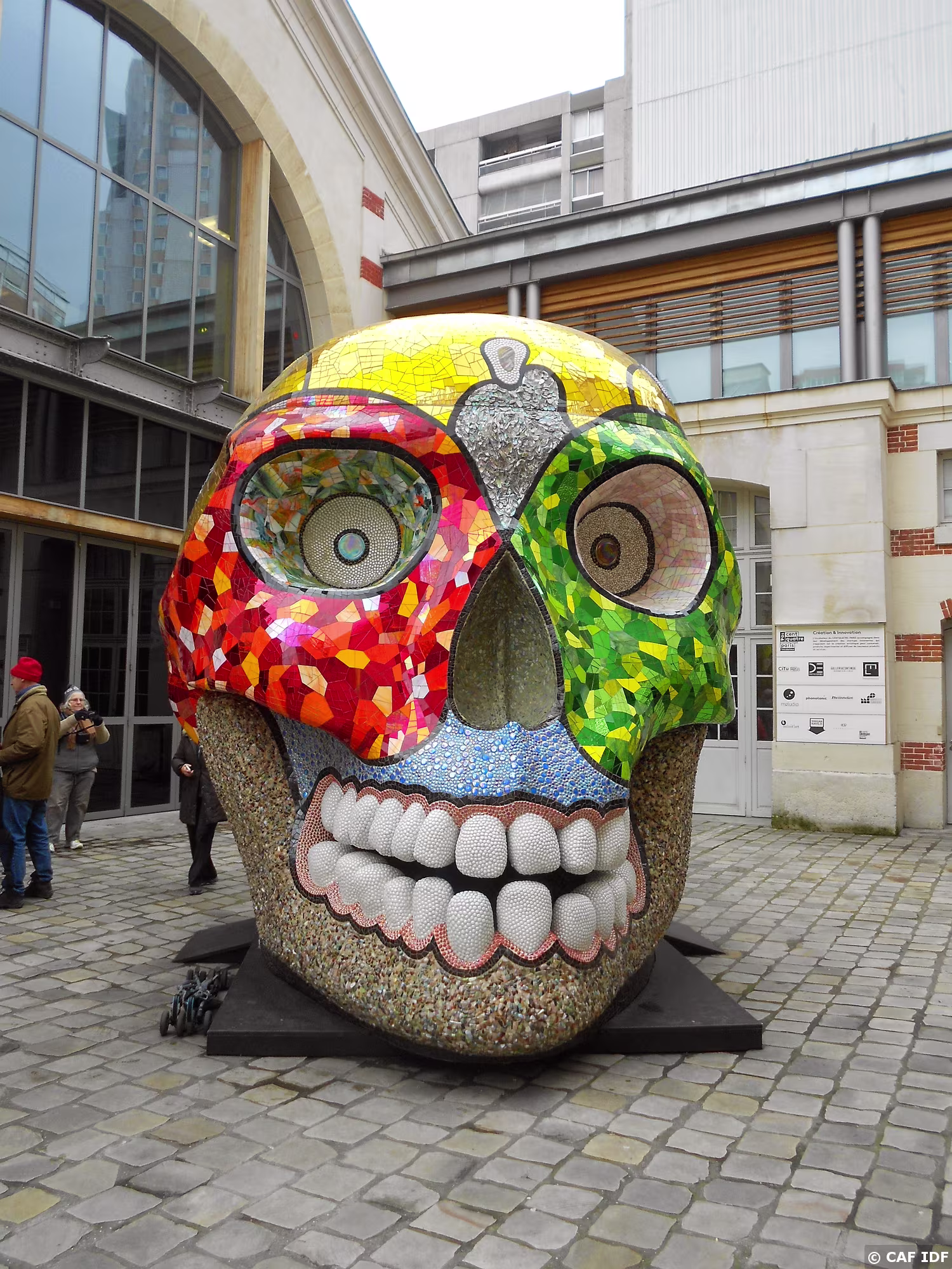 La Cabeza ou Tête de mort de Nikki de Saint-Phalle (1930-2002), revêtue de miroirs et de pierres colorées.