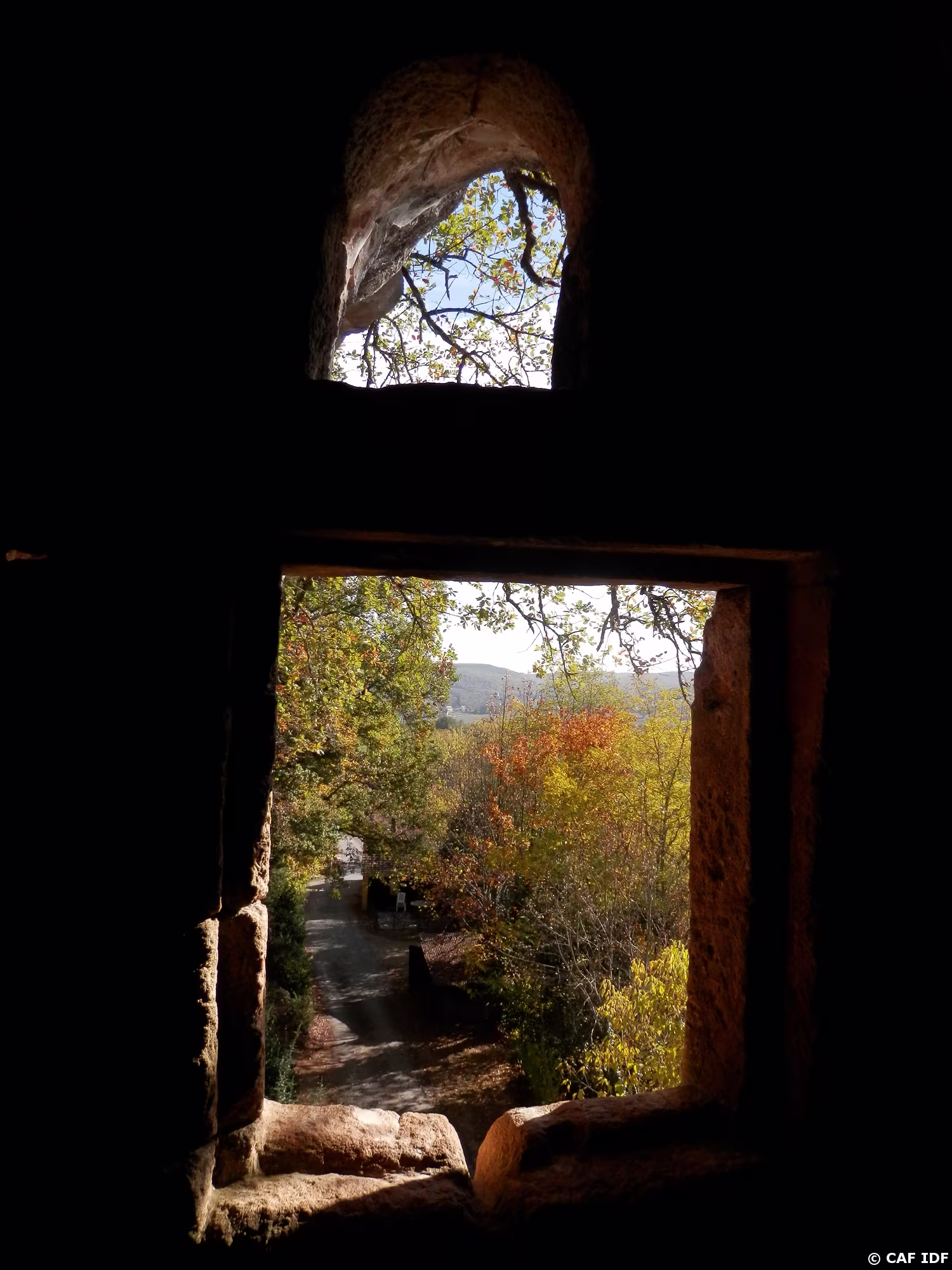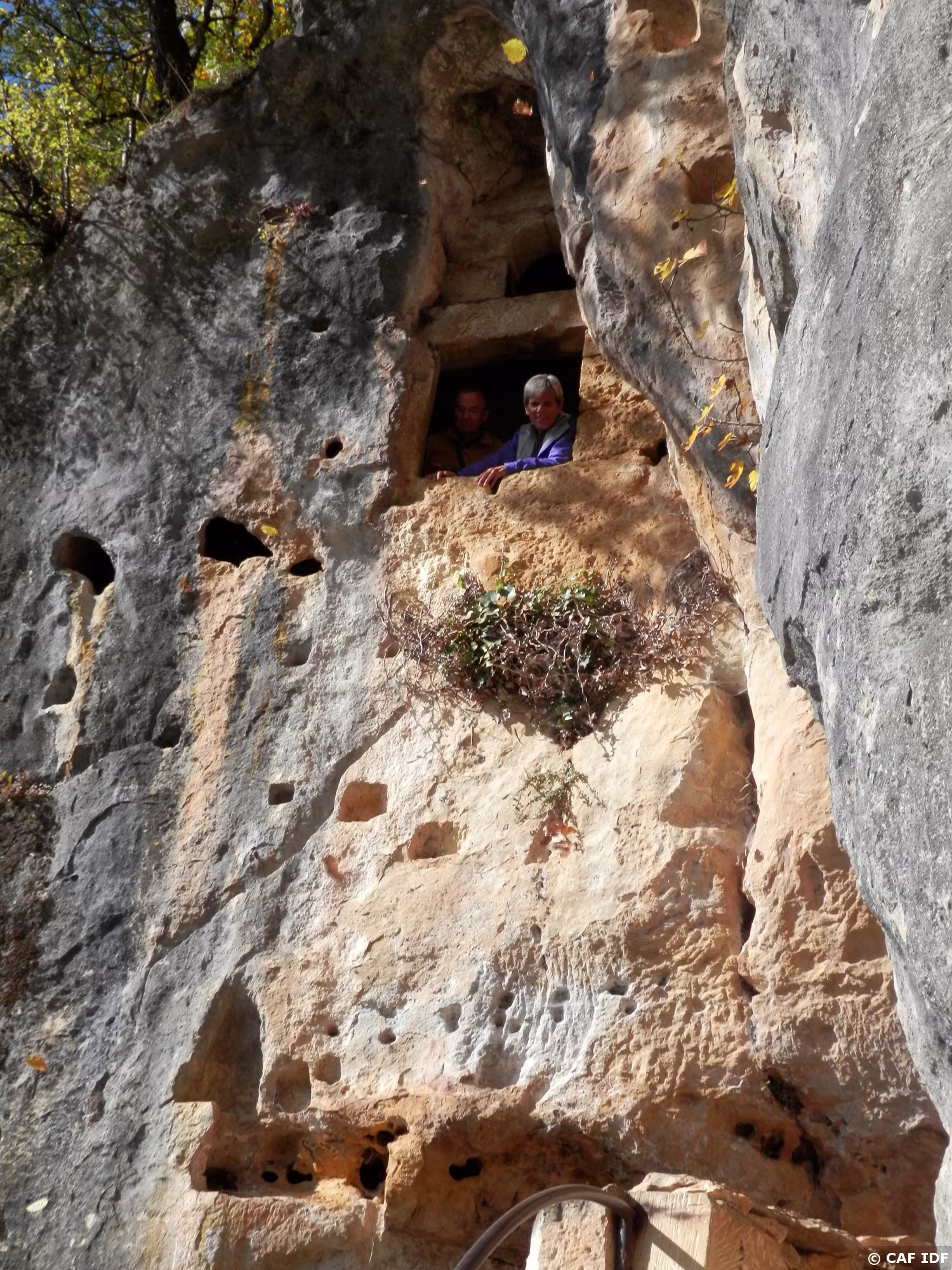 vu d'en bas, des abris moyen-âgeux dans la falaise