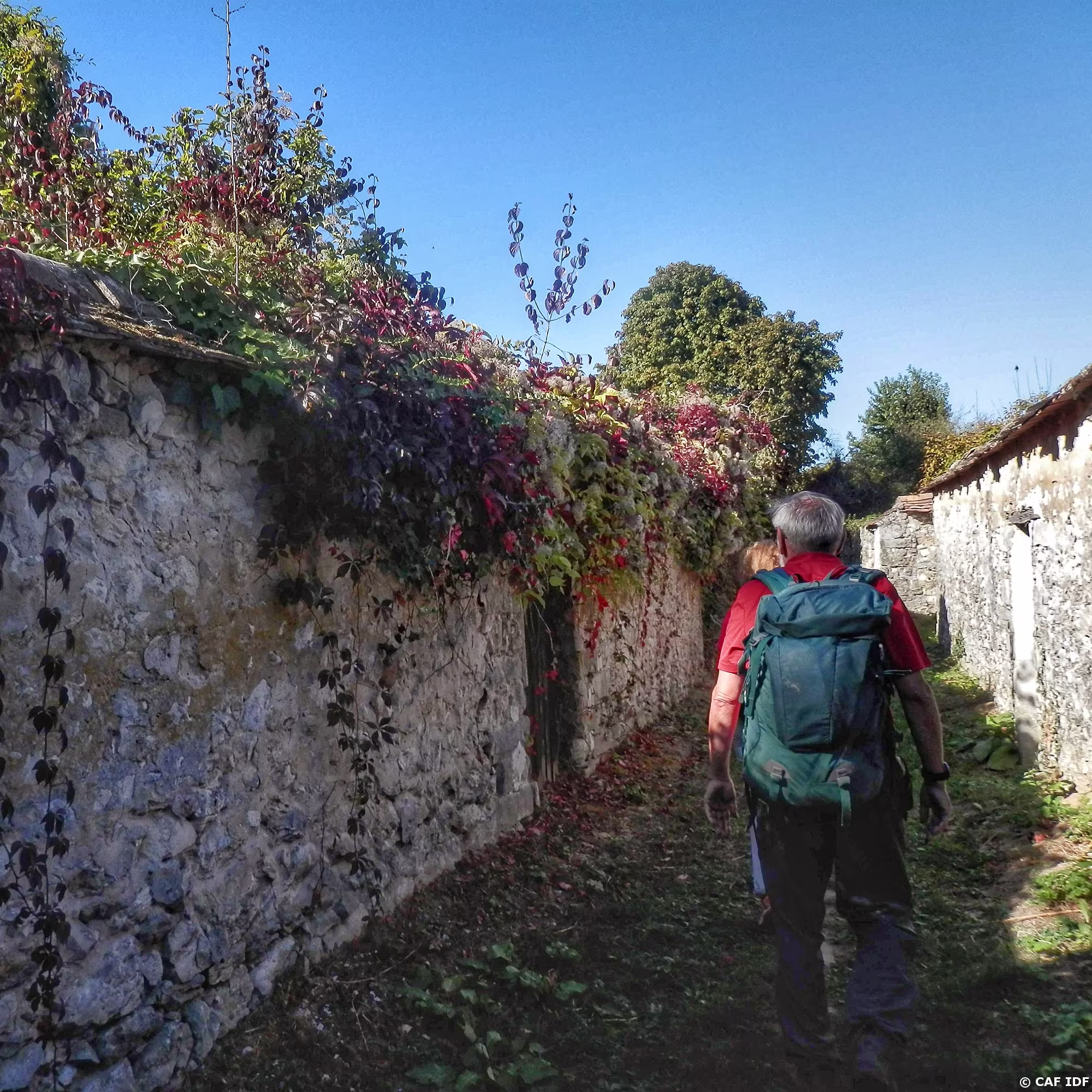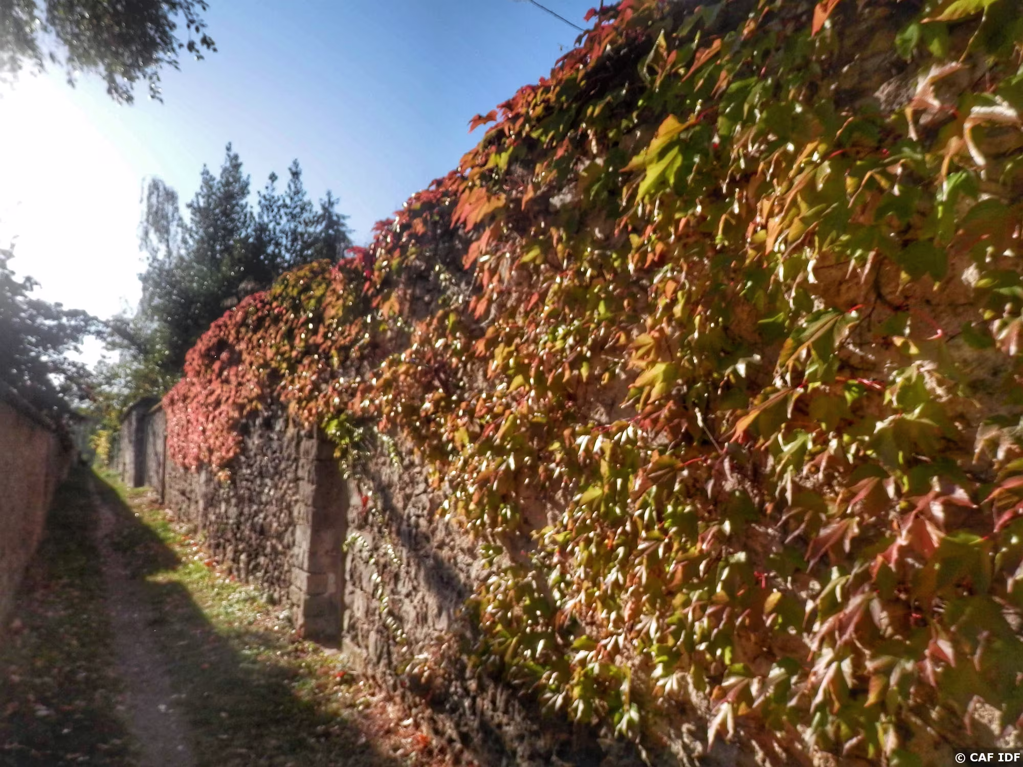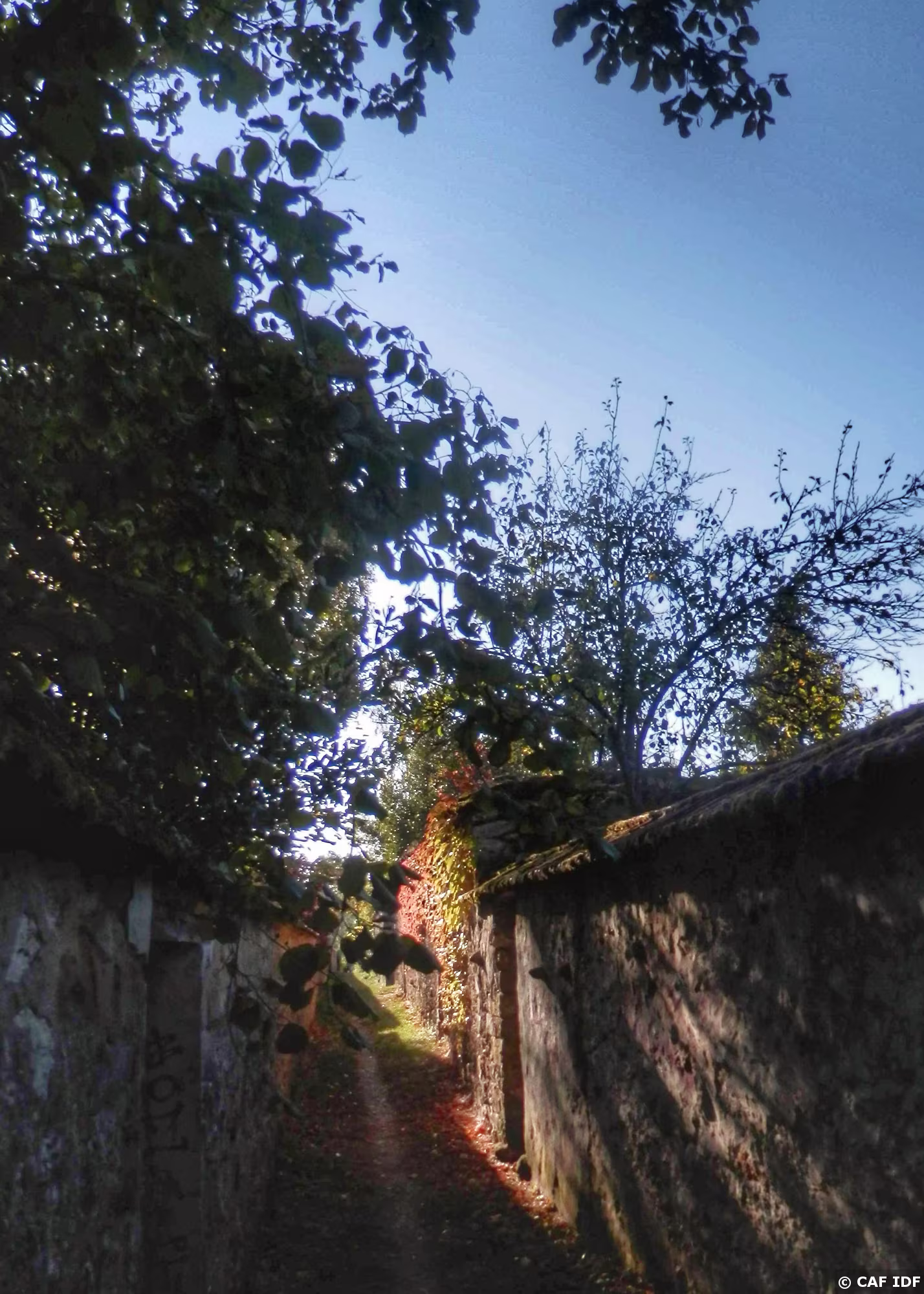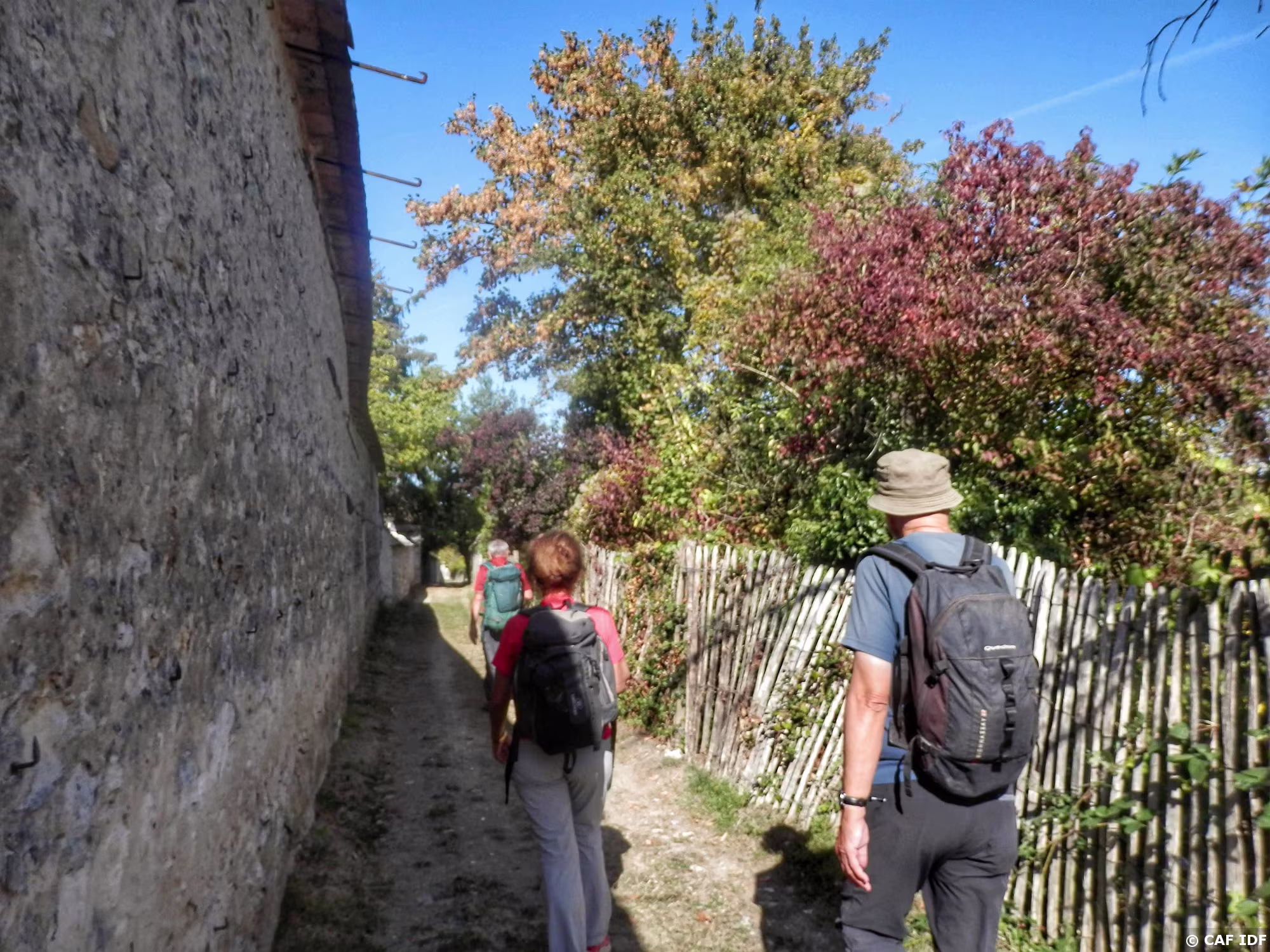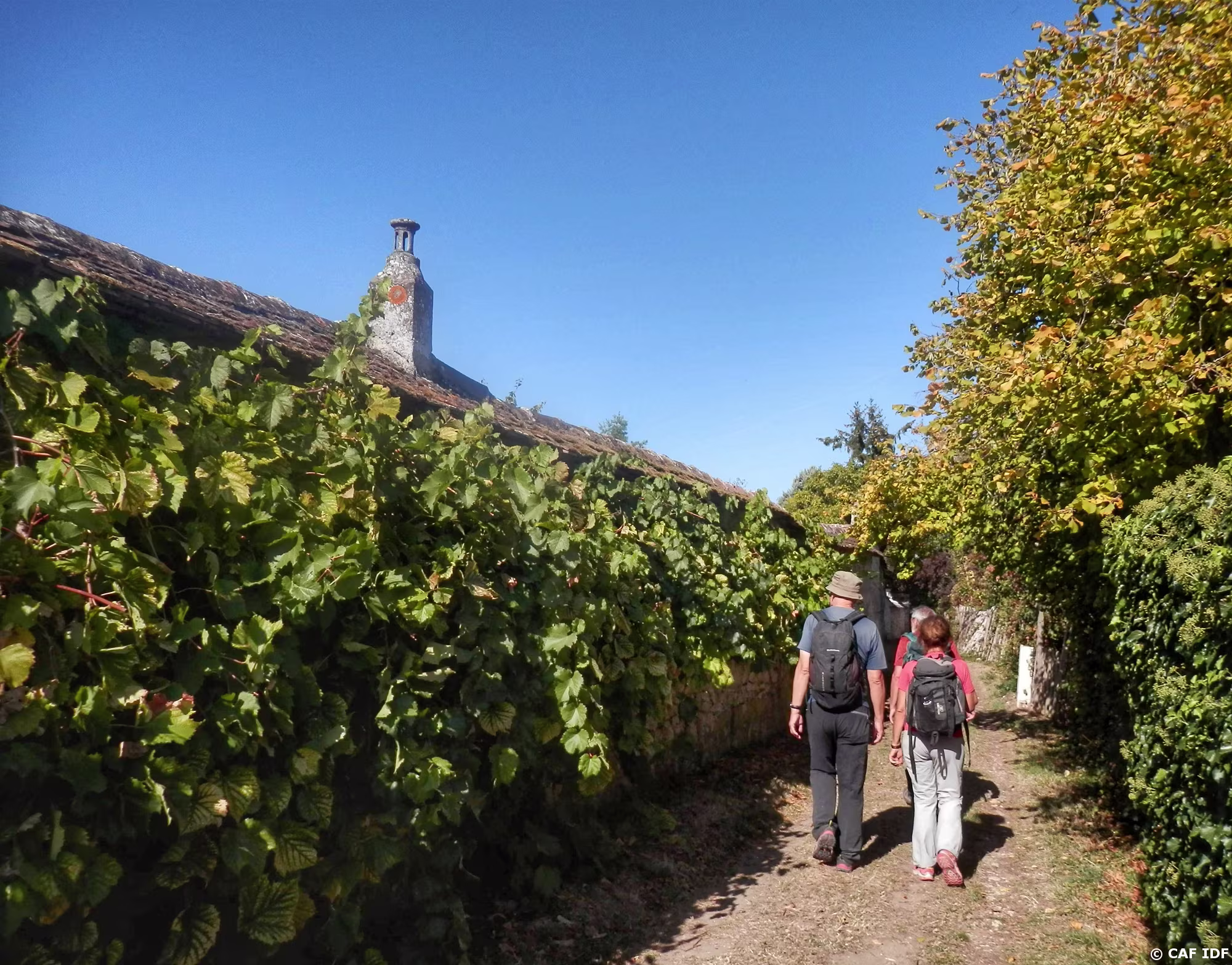 Thomery. Le chemin des Longs Sillons qui serpente entre les murs à raisin et les jardins à vignes.