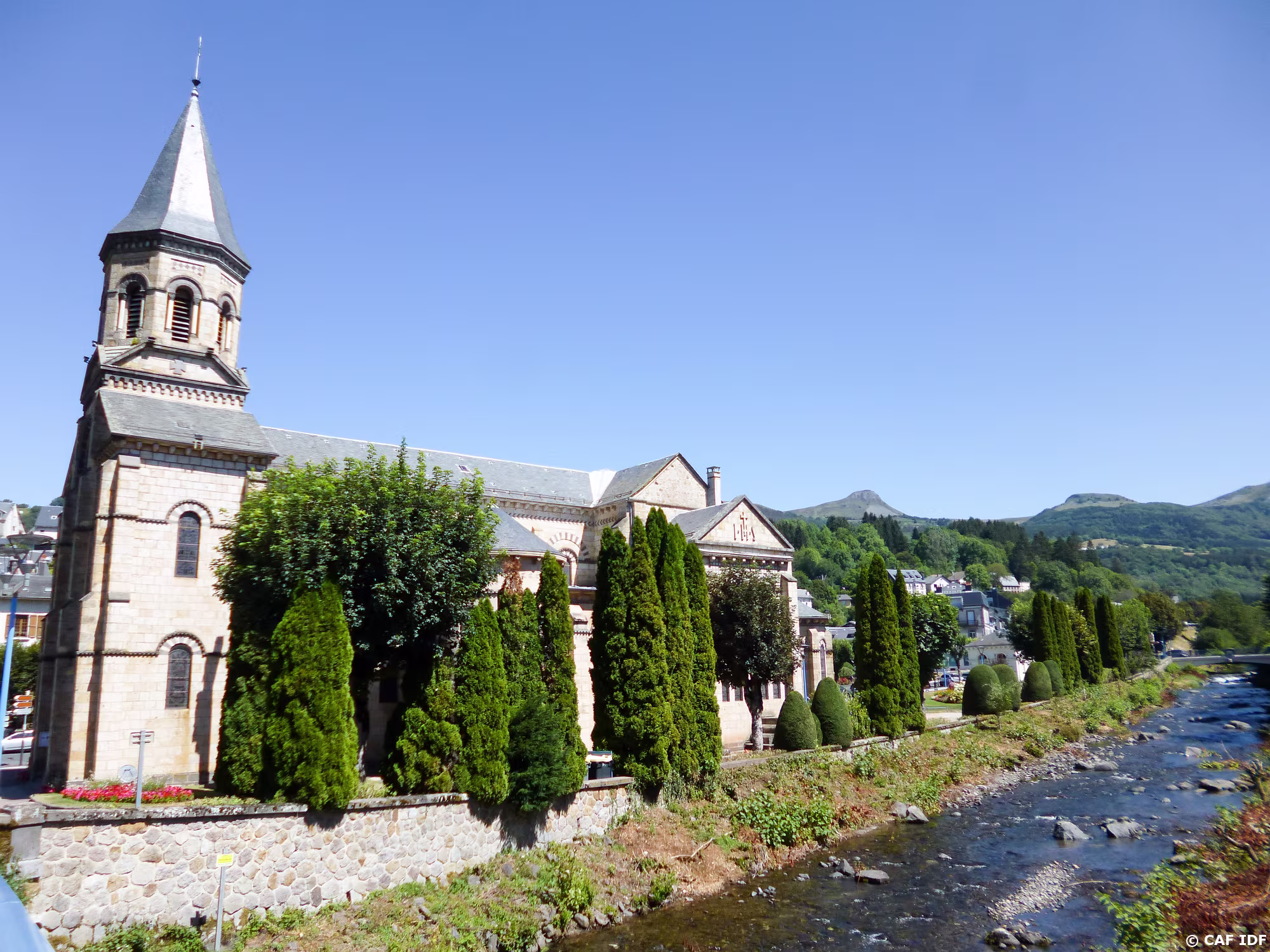 20200806-15h51m27s-P1120944-V3 La Bourboule, église Saint-Joseph, style néo-roman, édifiée en 1888, la Dordogne et la banne d'Ordanche (1512 m.)