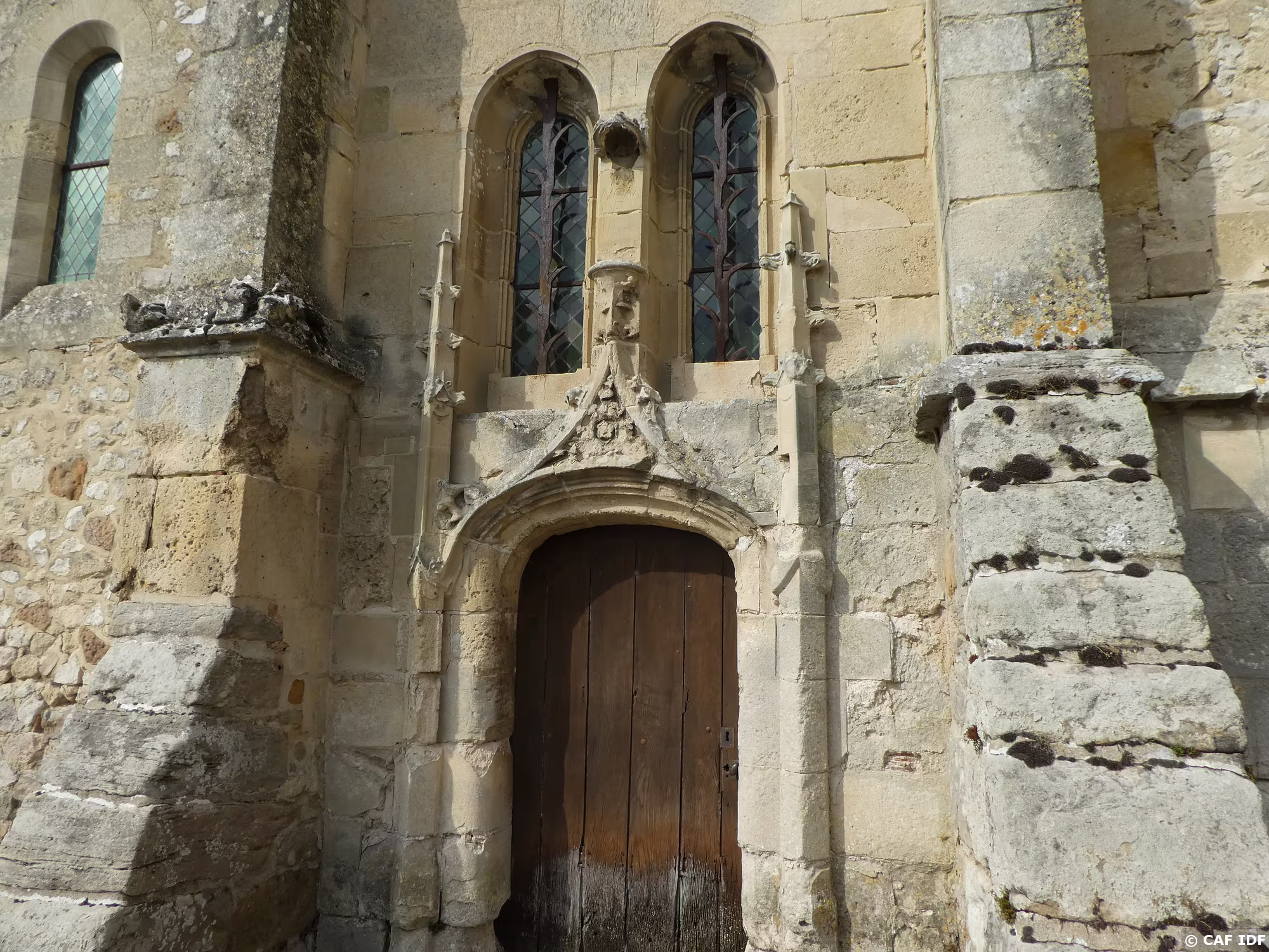 Porte flamboyante en anse de panier avec accolade et pinacles