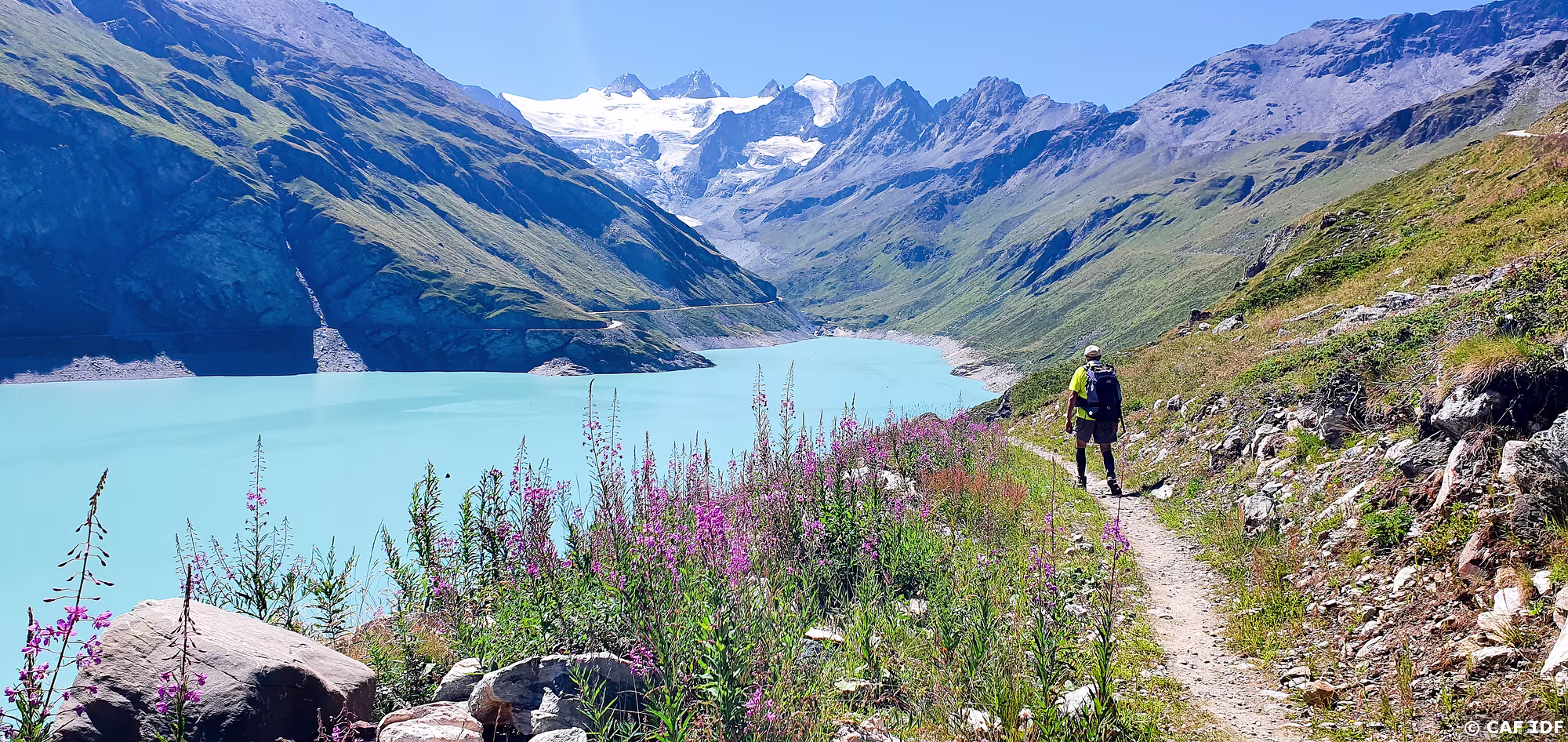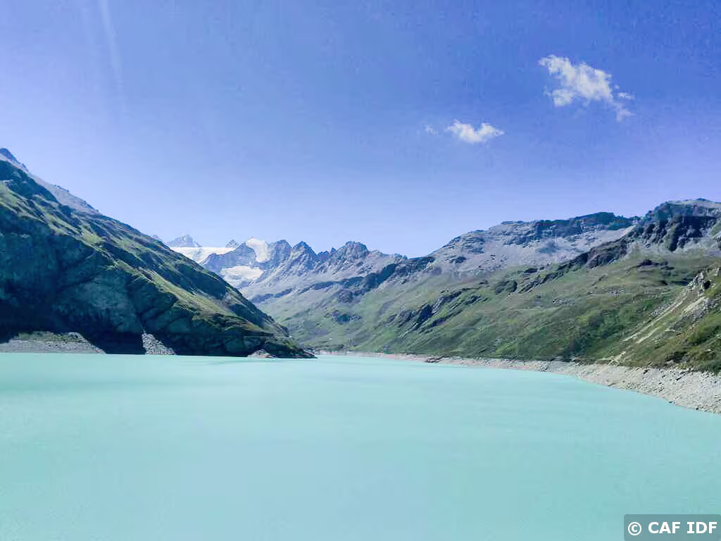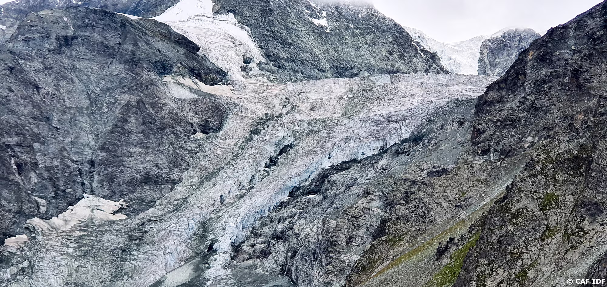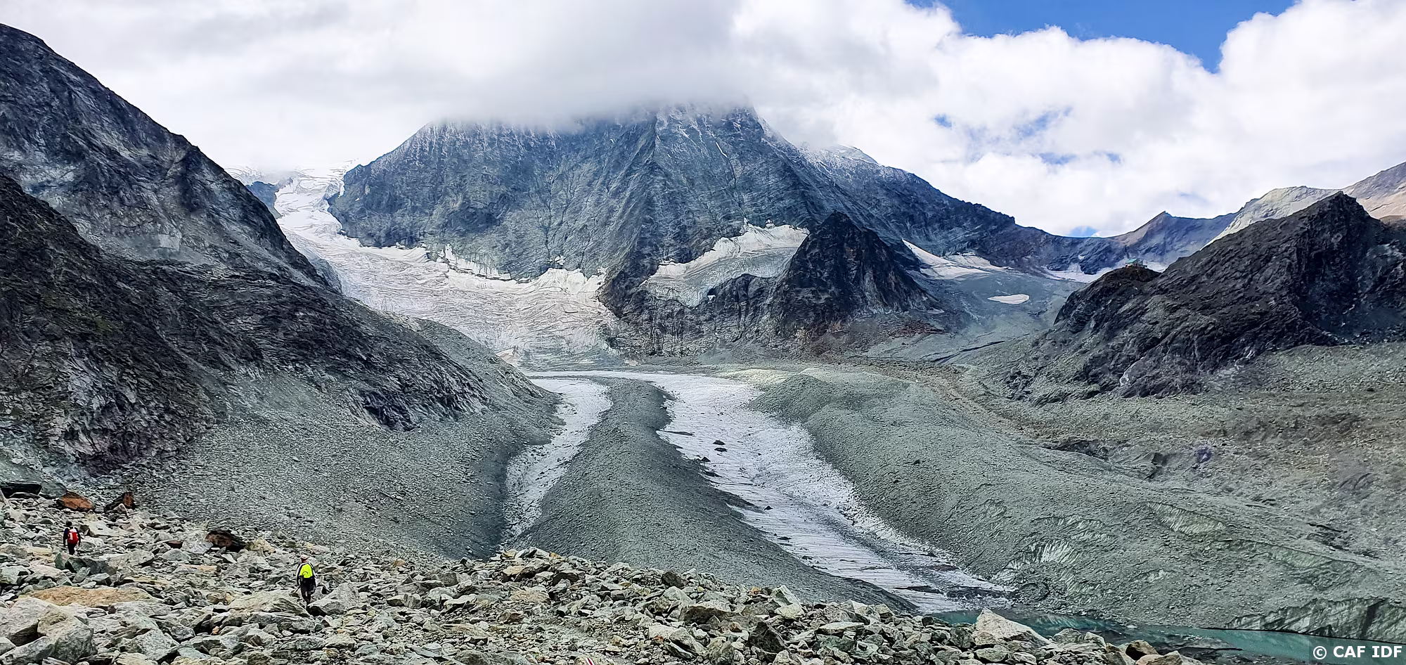 Vue sur le Bishorn (4151m) et le Weisshorn (4505m) avec le Turtmanngletschär, le Brunegggletschär puis le Turtmannsee.