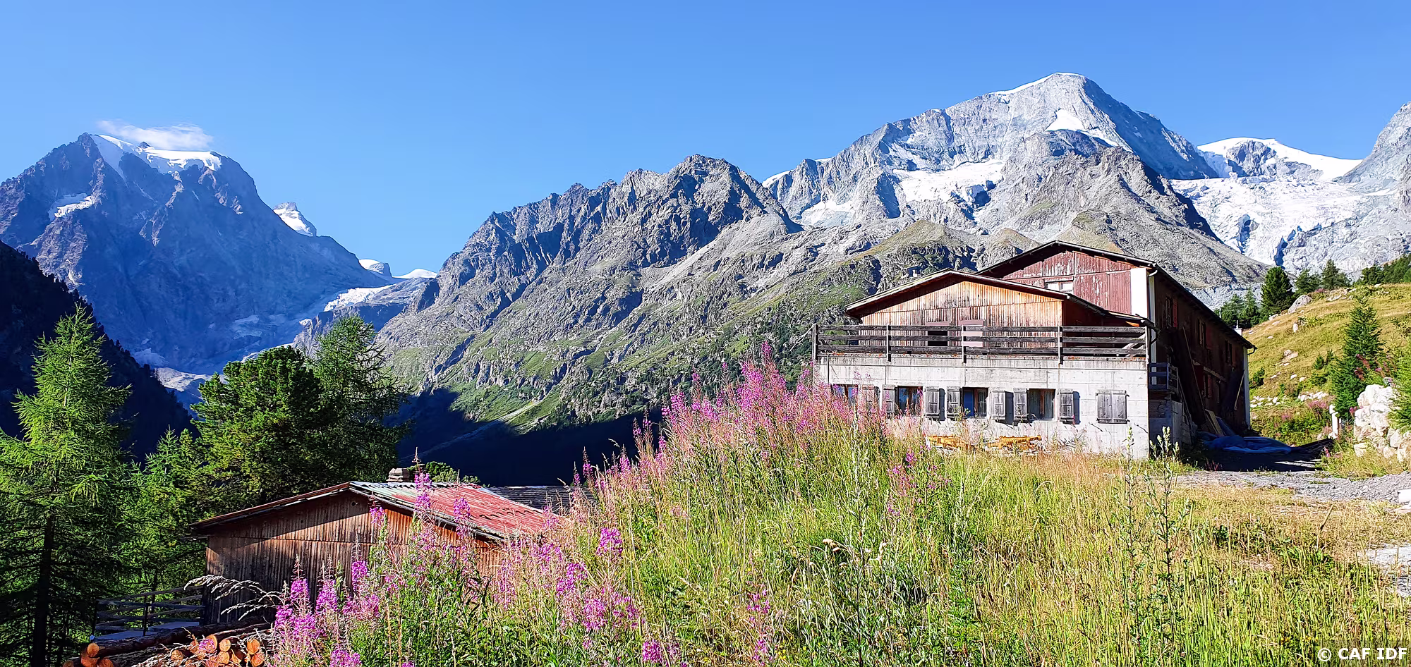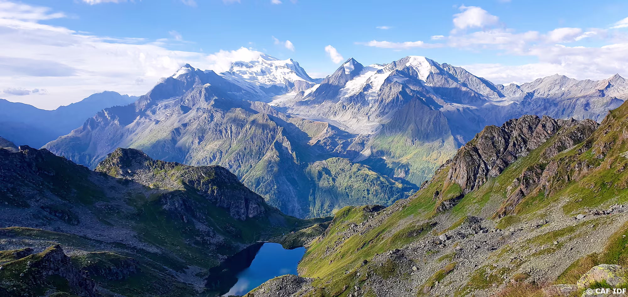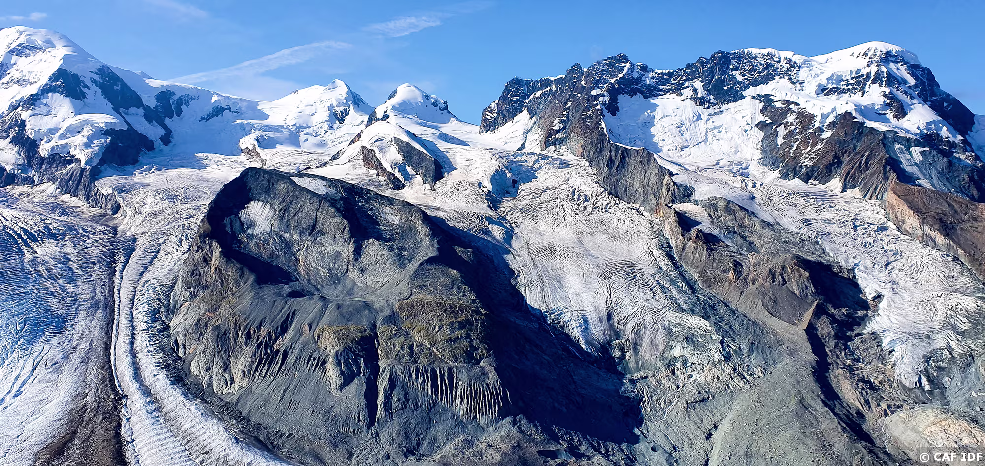 Vue sur le Val des Dix avec la Pointe du Vasevay (3355m), la Pointe des Chamois (3384m), le Glacier des Pantalons Blancs, les Rochers du Bouc, les Rochers de…