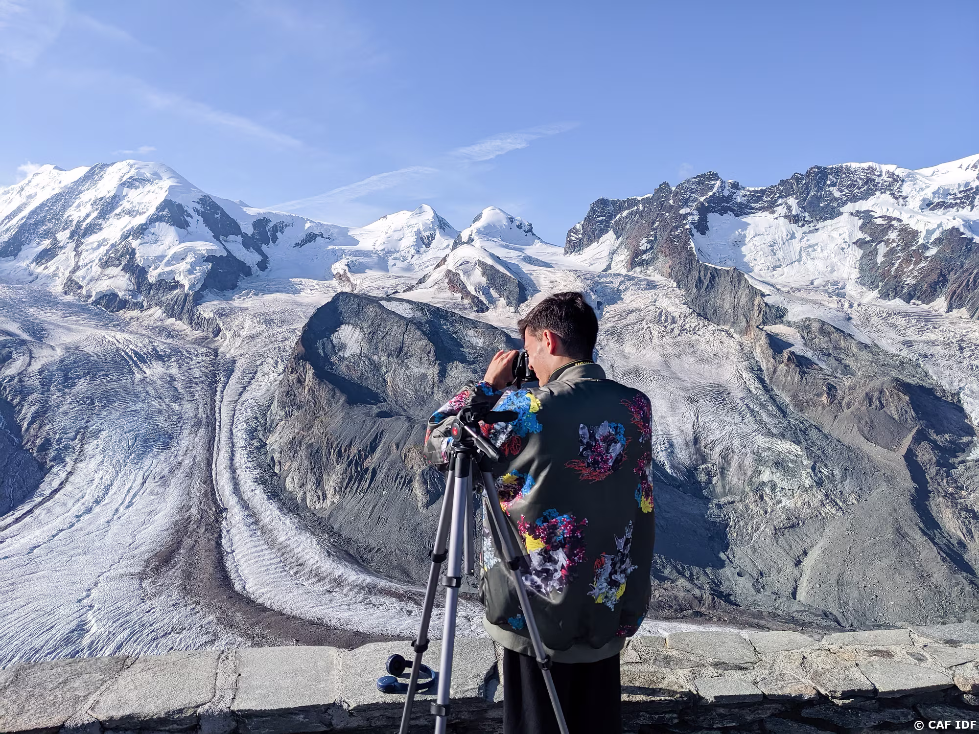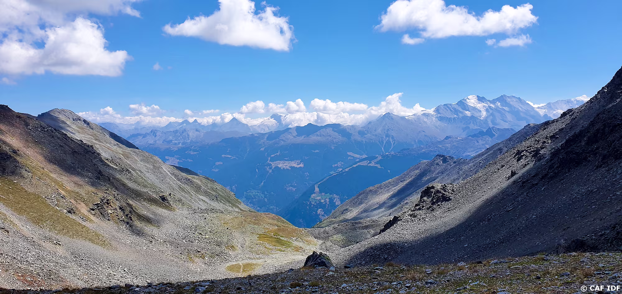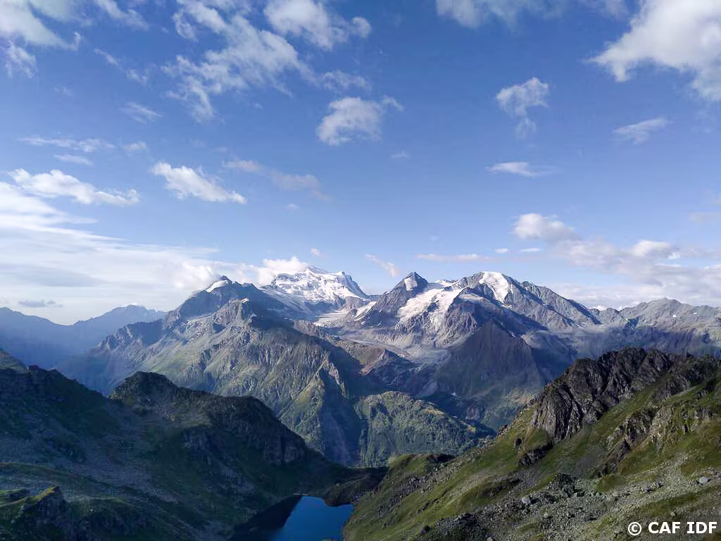 Vue sur le Combin de Grafeneire (4313m), les Aiguilles Rouges d'Arolla (3646m), la Pointe de la Vouasson (3490m) et le Mont Blanc à 72km du Col de la Forcletta…