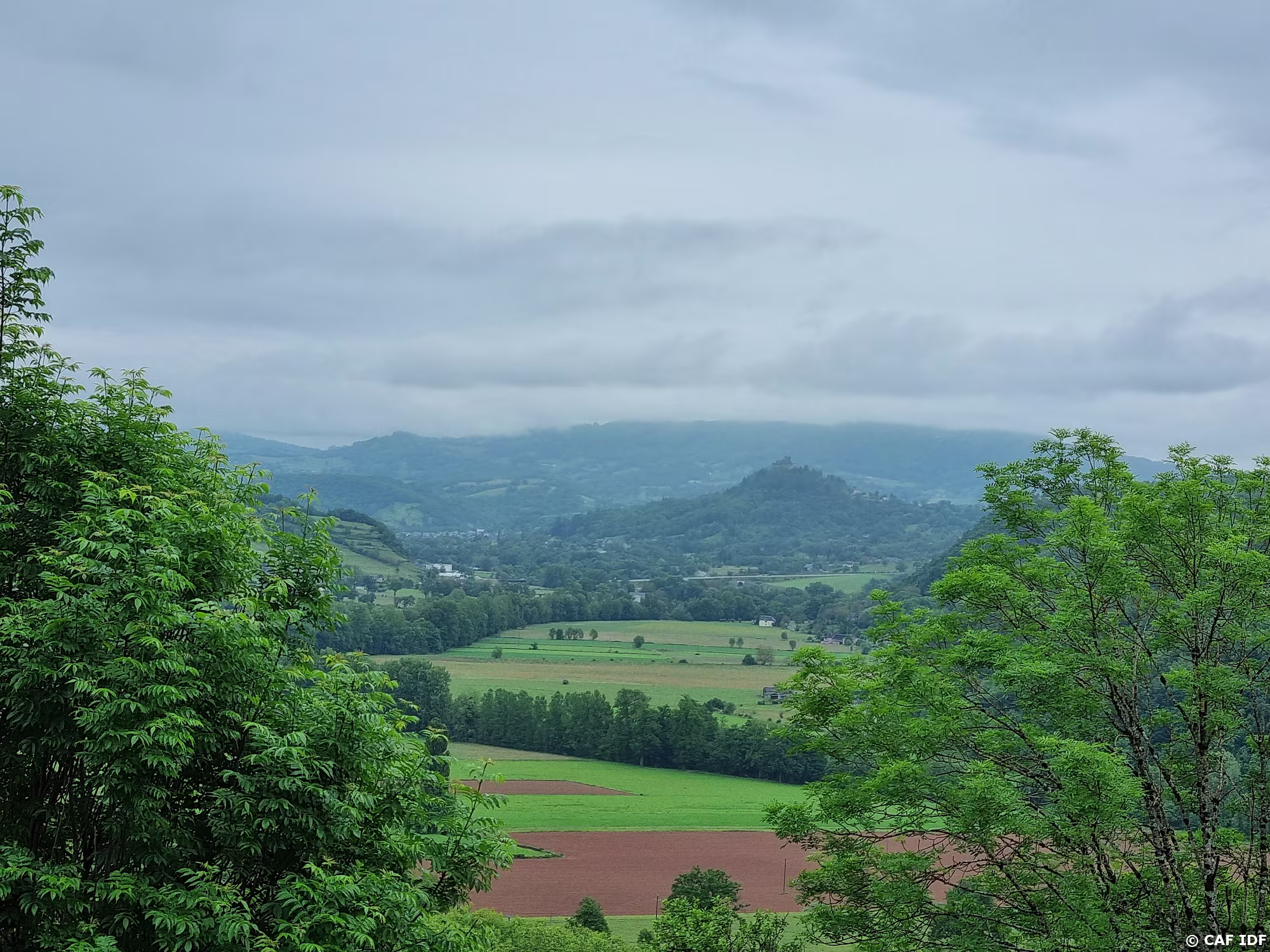 Depuis Vinnac, vue sur le pitonde basalte où se dressent les ruines du château de Calmont d'Olt au centre de la photo. En dessous à gauche Espalion