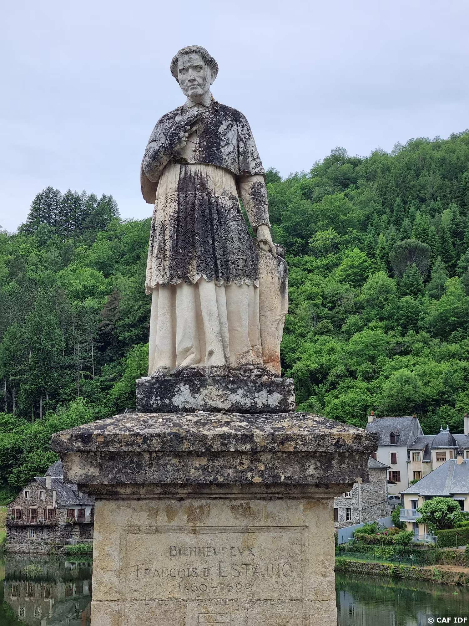 Le Pont Gothique sur le Lot vu du haut de la tour du château. Construit vers 1490, achevé sous l'impulsion de François d'Estaing dont la statue (1866) trône sur…