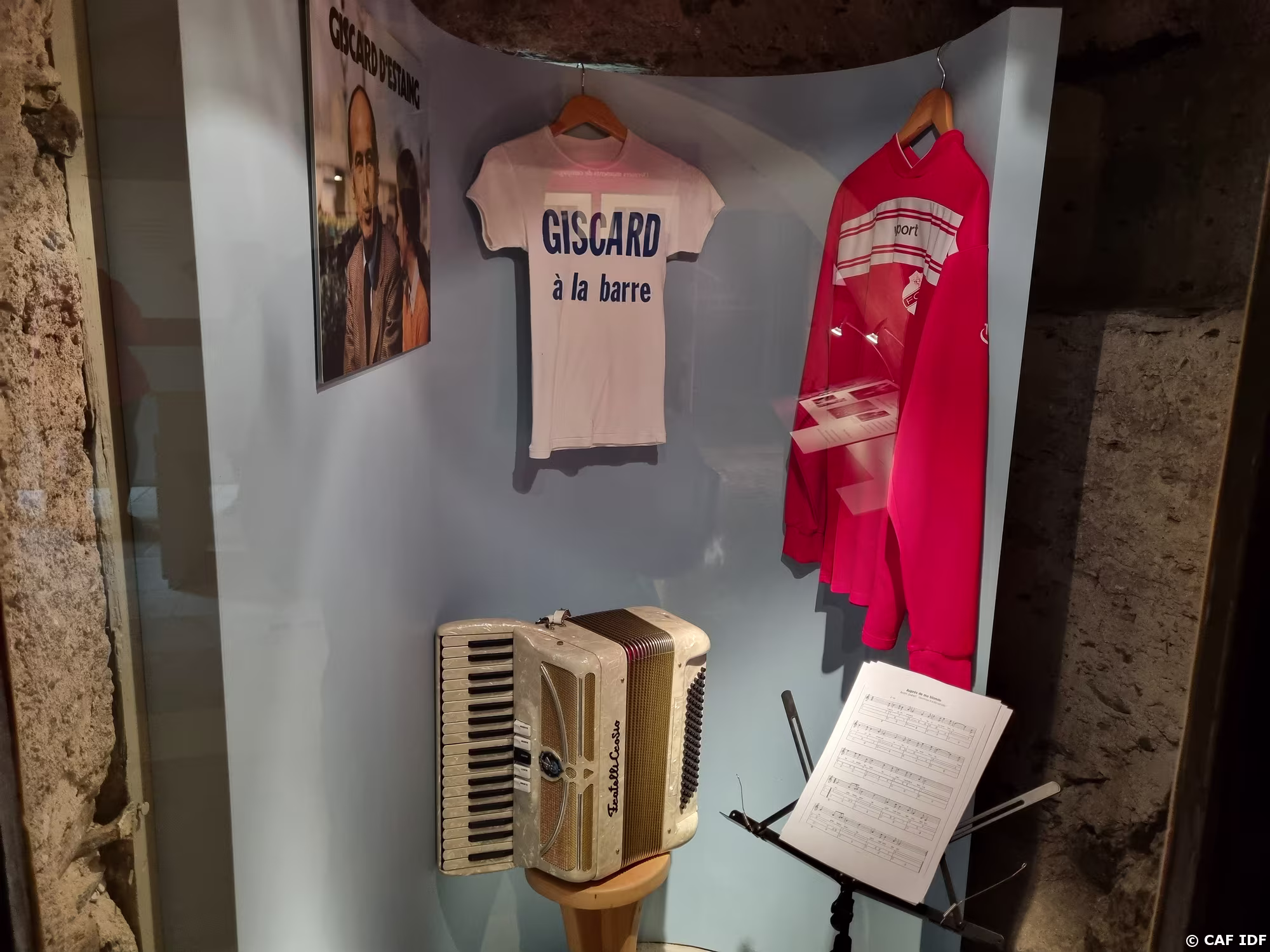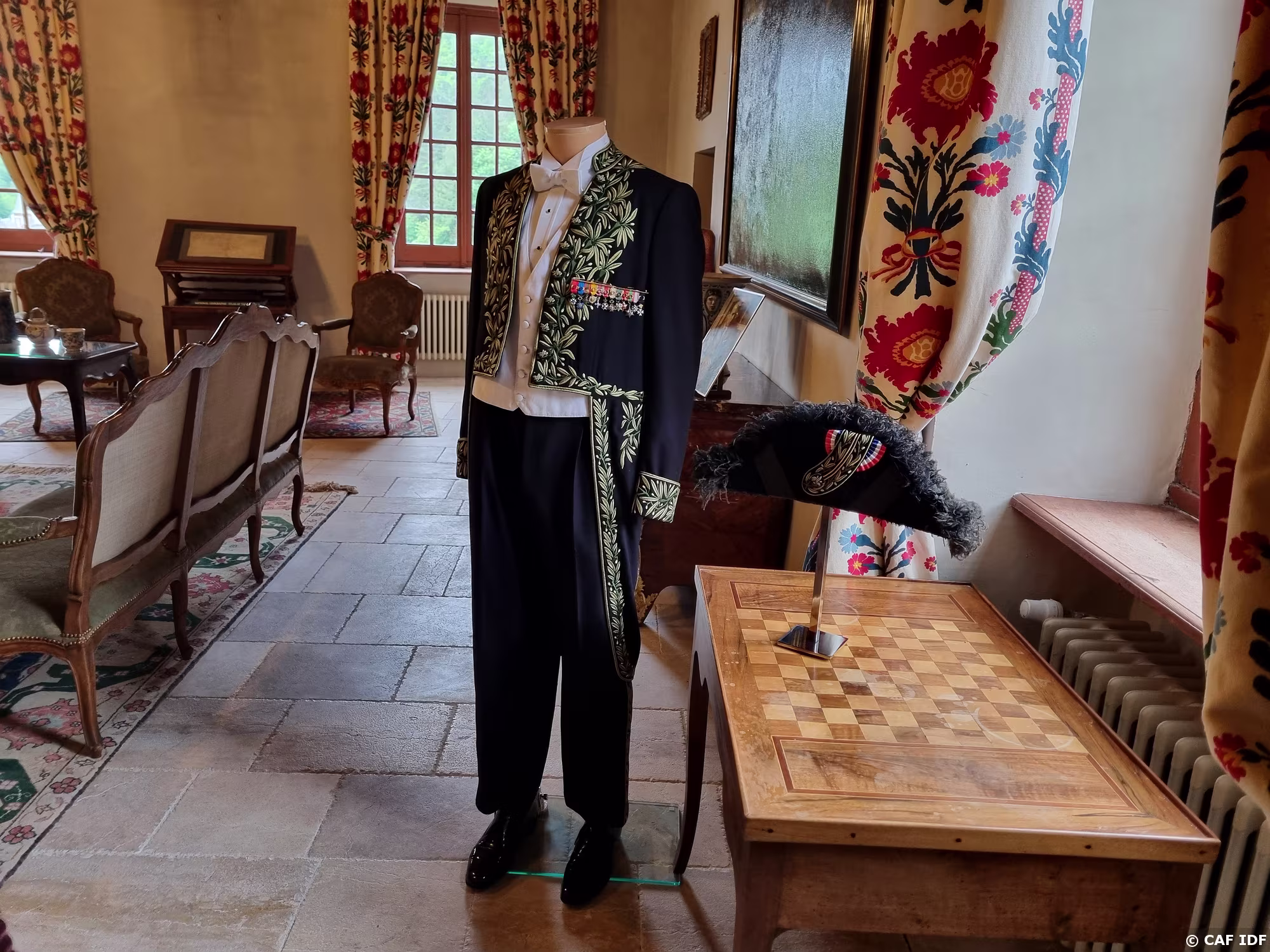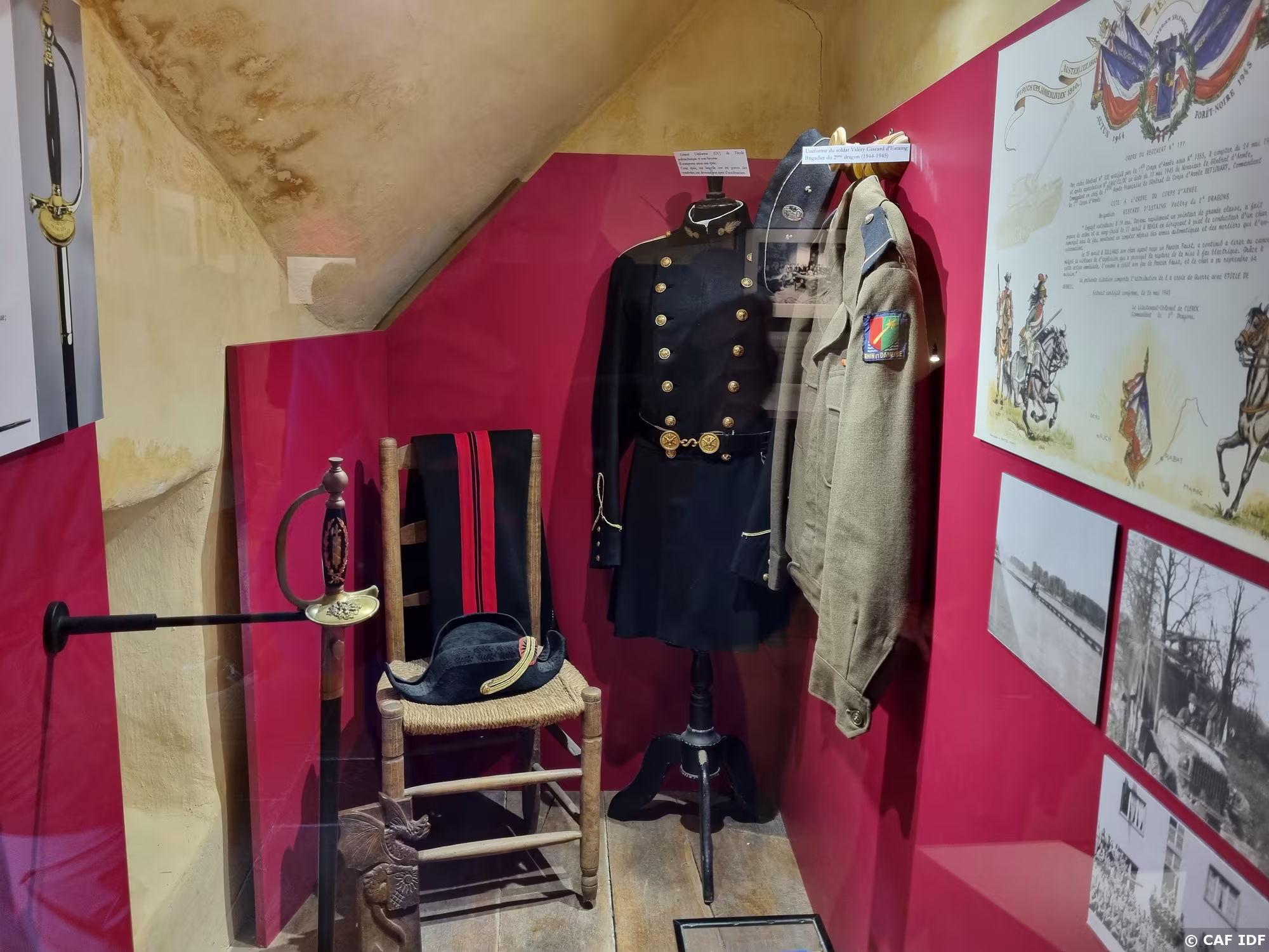 A droite uniforme du soldat V.G.E. Brigadier du 2ème dragon (1944-1945). A gauche : Grand uniforme de l'école polytechnique et son bicorne