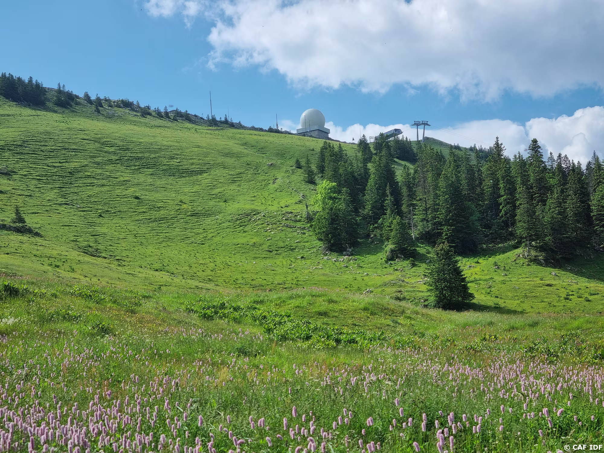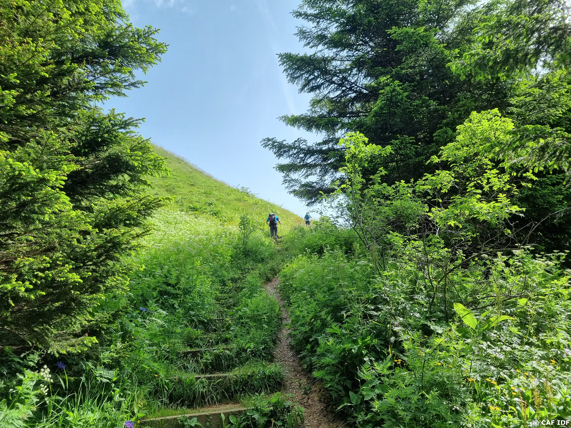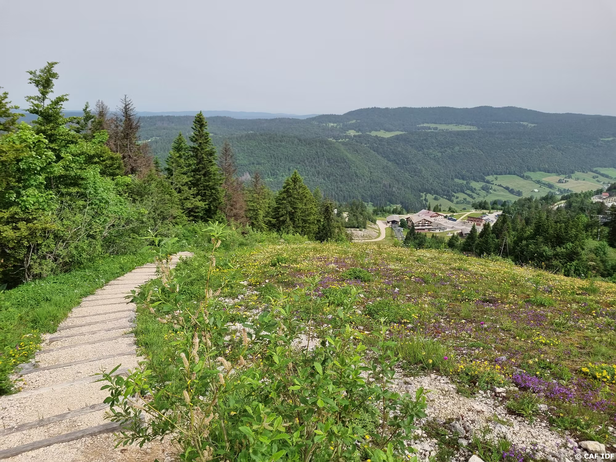 Sentier de montée au Petit Montrond bien aménagé avec beaucoup de marches. Il évite les pistes de ski et la descente des vététistes