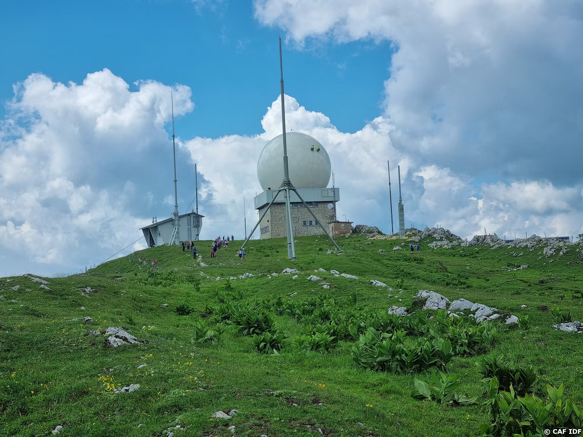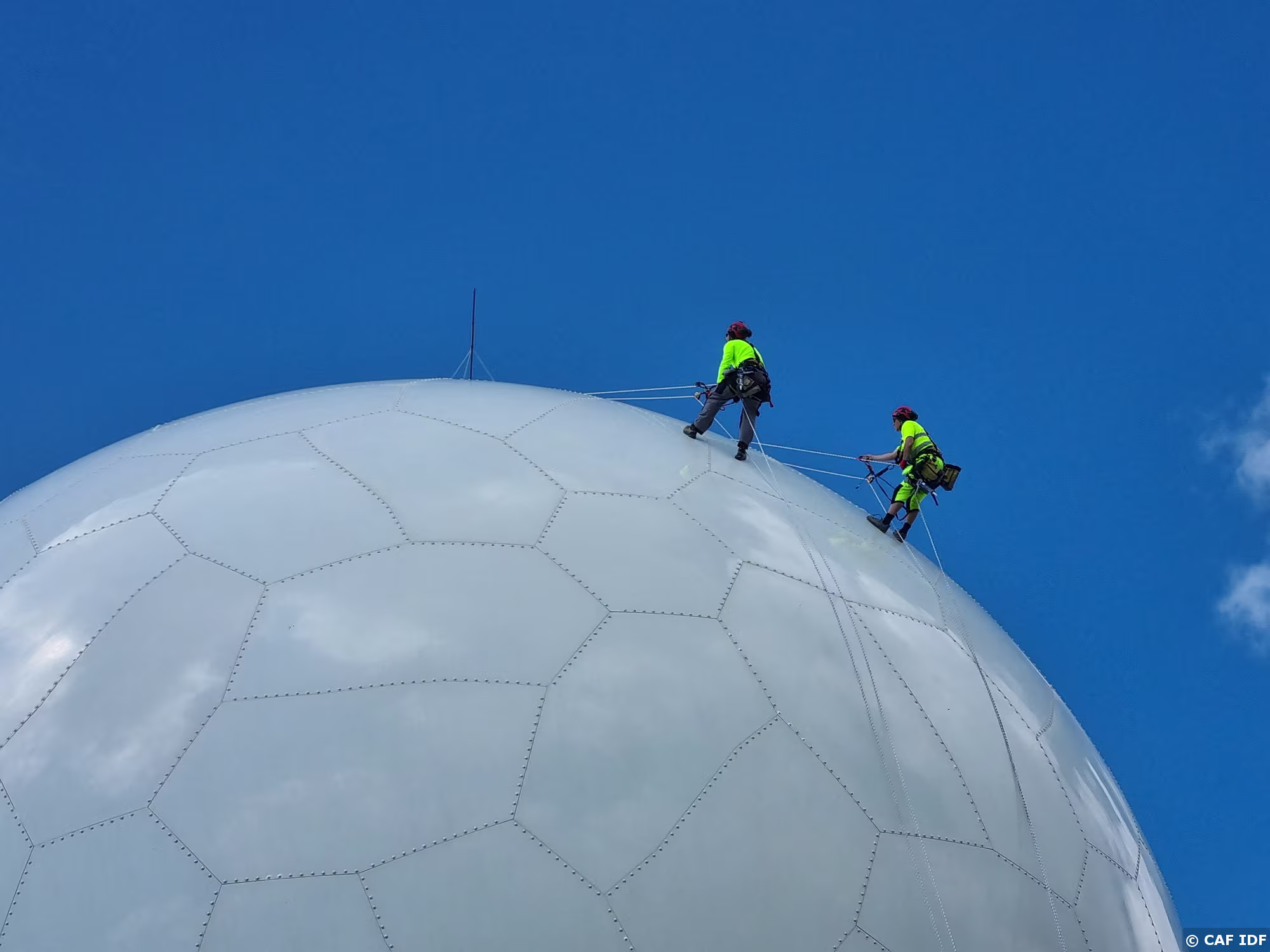 Un radôme flambant neuf, de même taille et couleur, a remplacé l'ancien. Contrôle effectué par des cordistes
