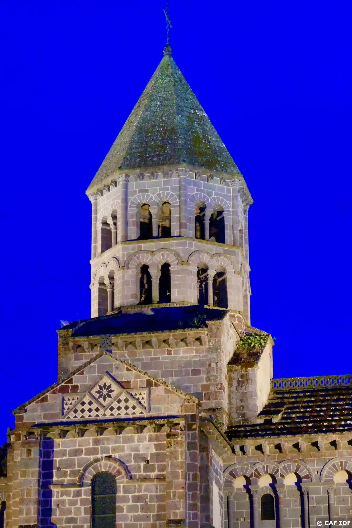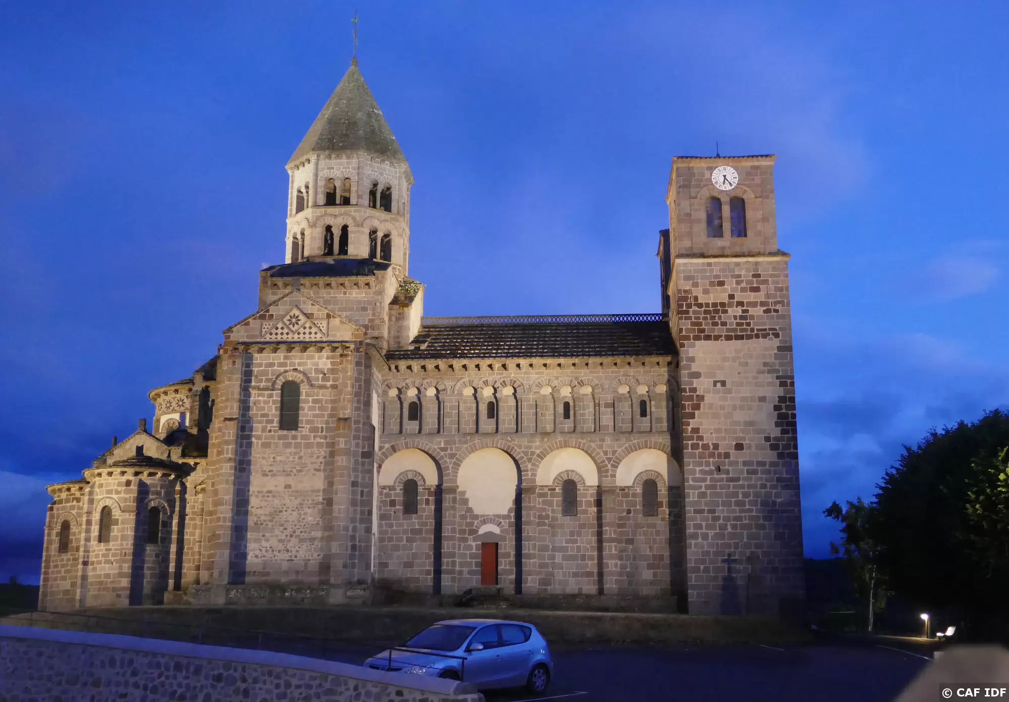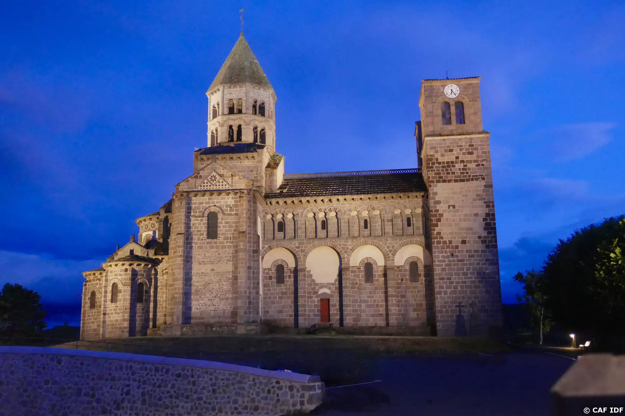 Église de St Nectaire, de style roman auvergnat, éclairée la nuit.
