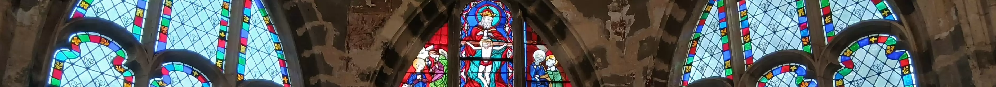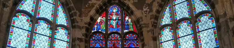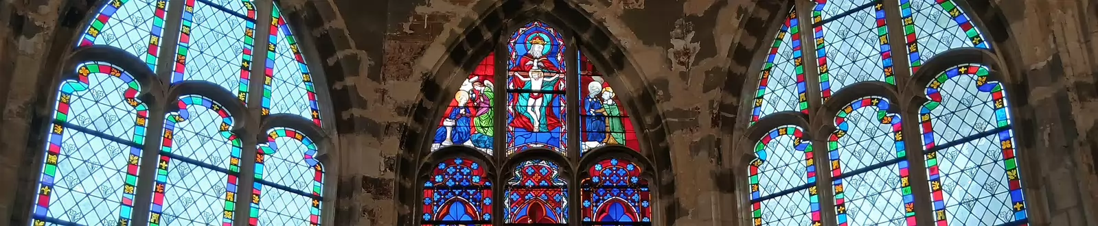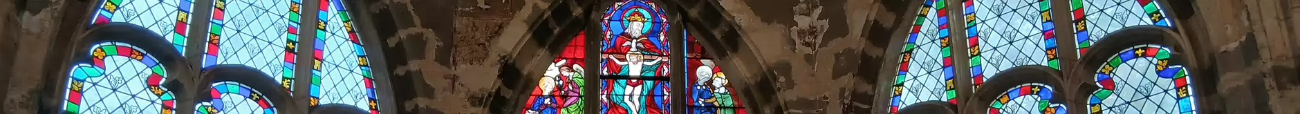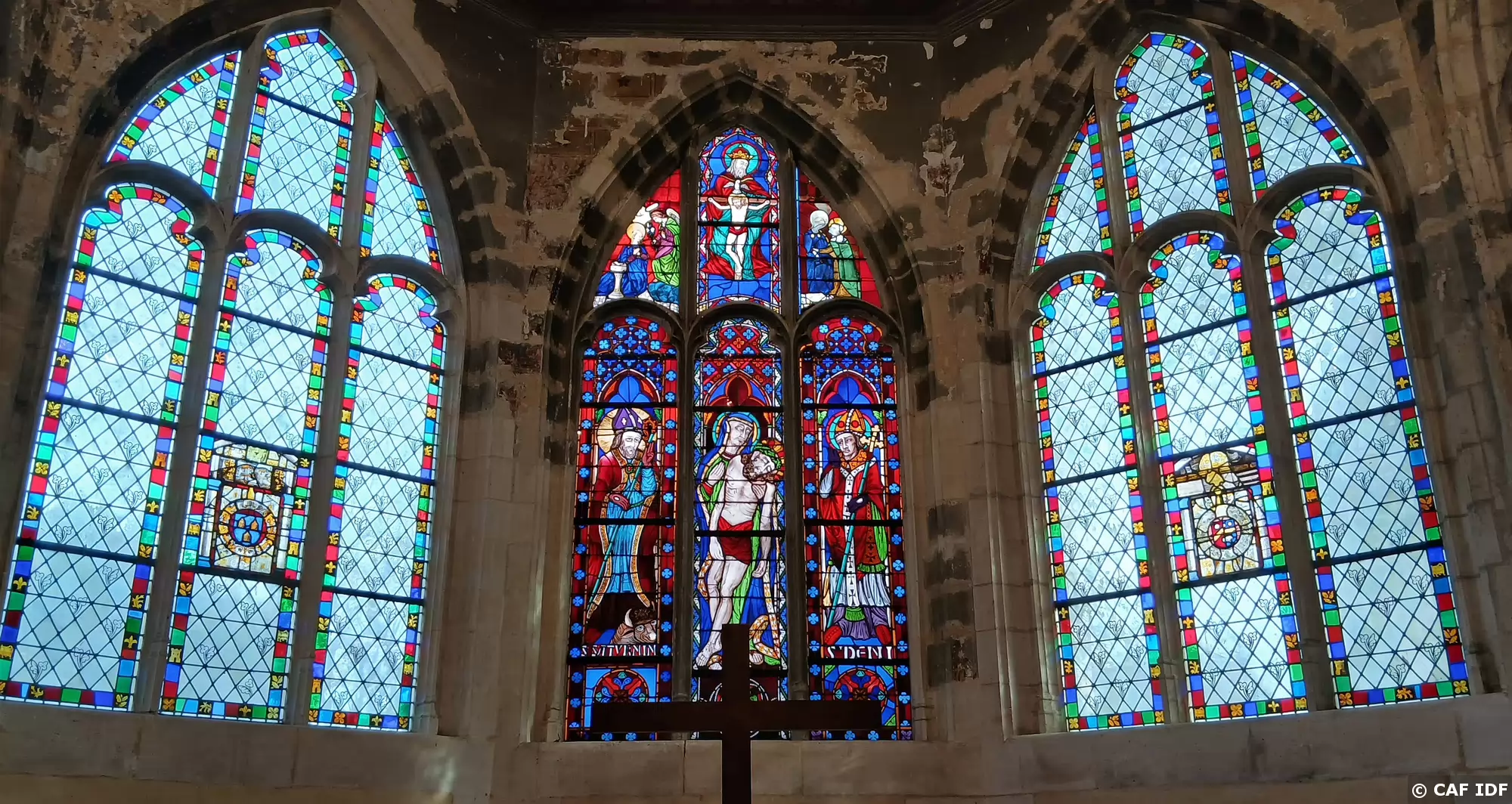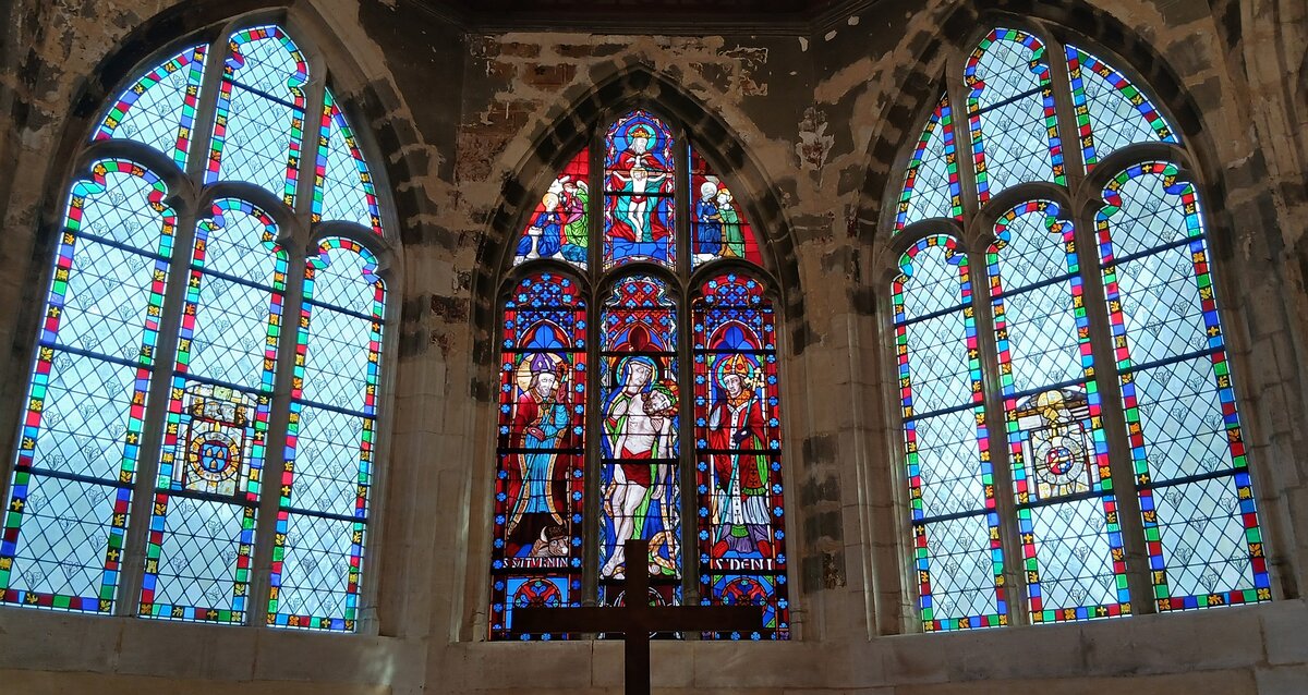 Les vitraux du chœur de l’église Saint Saturnin de Gentilly. Saint Saturnin, évêque de Toulouse, et saint Denis, évêque de Paris, entourent le Christ