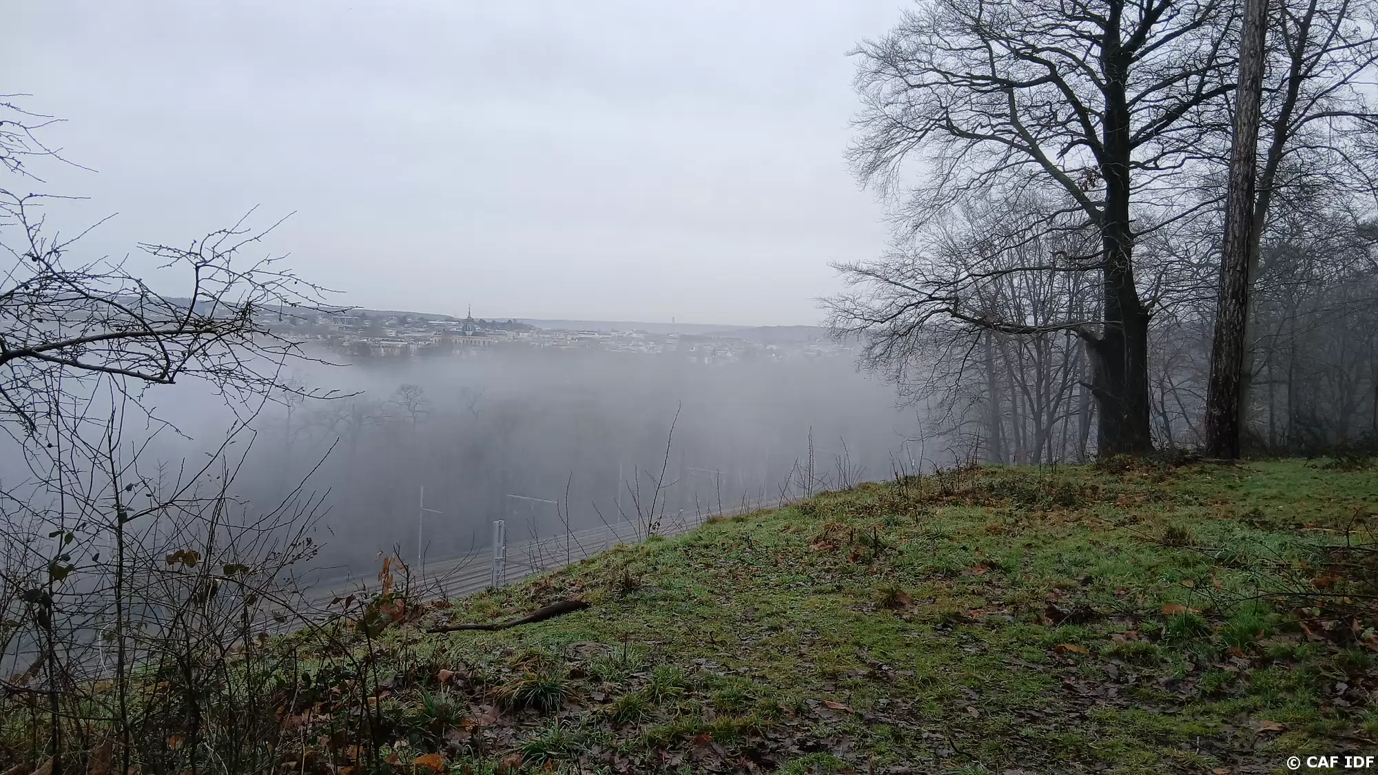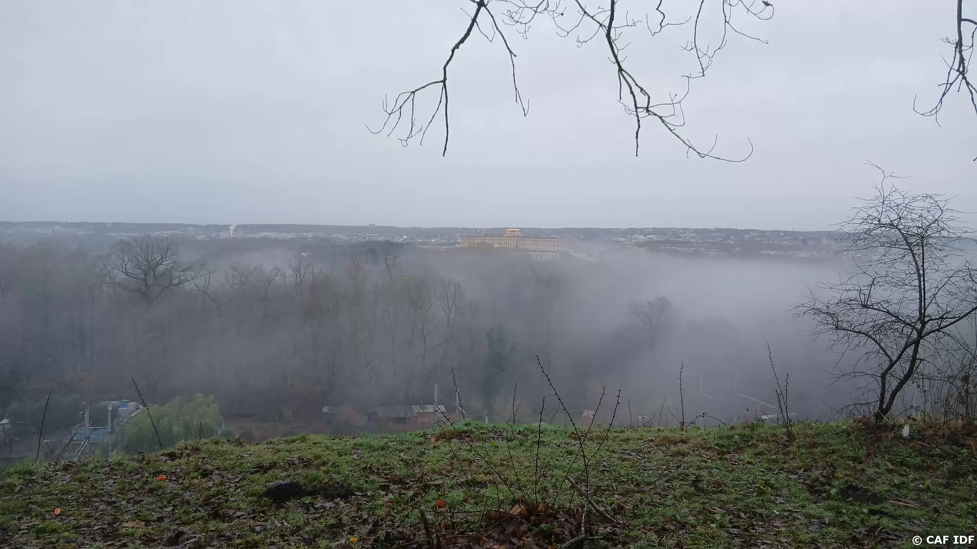Versailles dans la brume. On aperçoit la cathédrale Saint-Louis