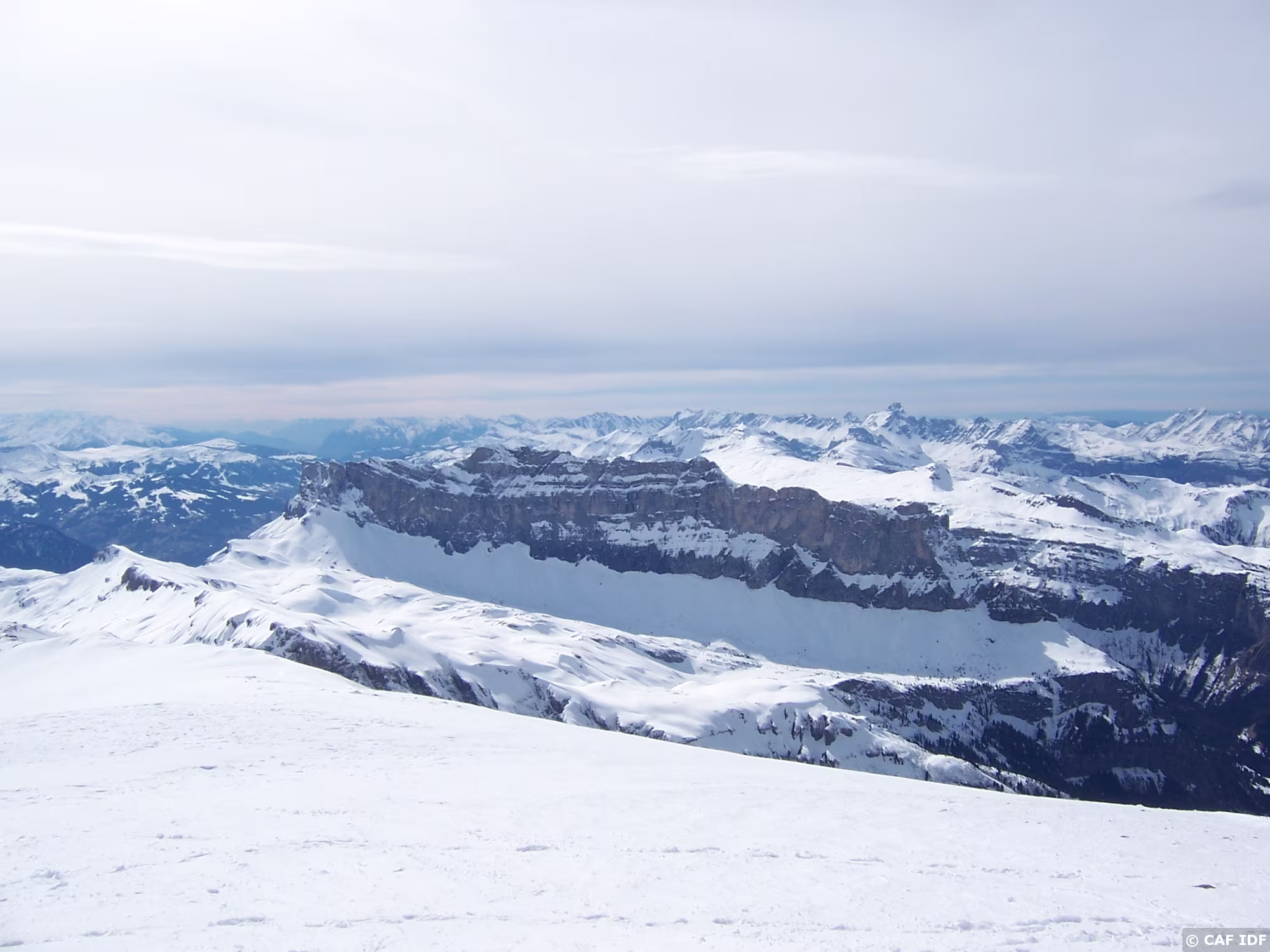 Vue vers le sud-ouest depuis le sommet du Mont Buet: Les Fiz au premier plan, les Aravis au fond, d'où émerge la Pointe Percée.