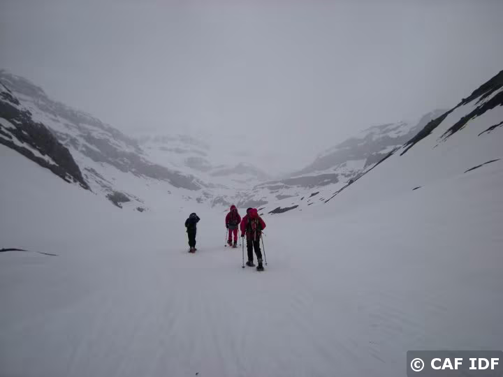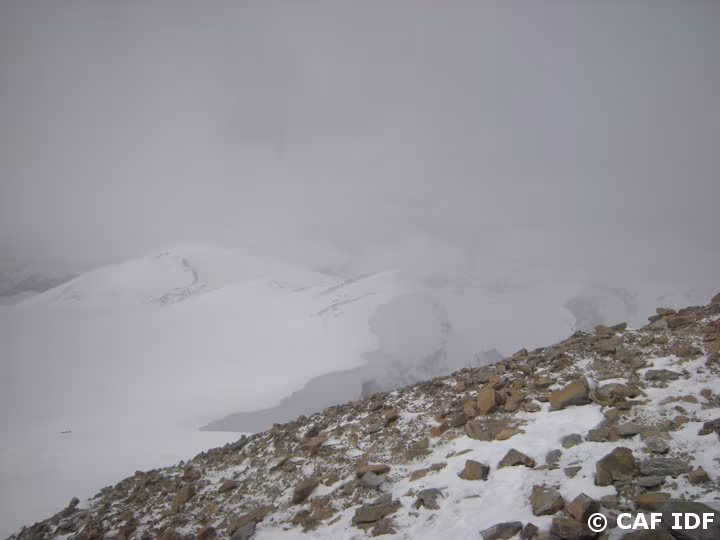 La pente se raidit à l'approche du sommet. Les crampons sont préférables aux raquettes.