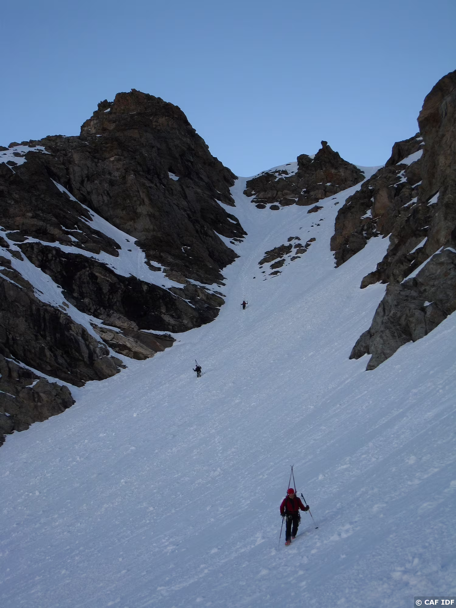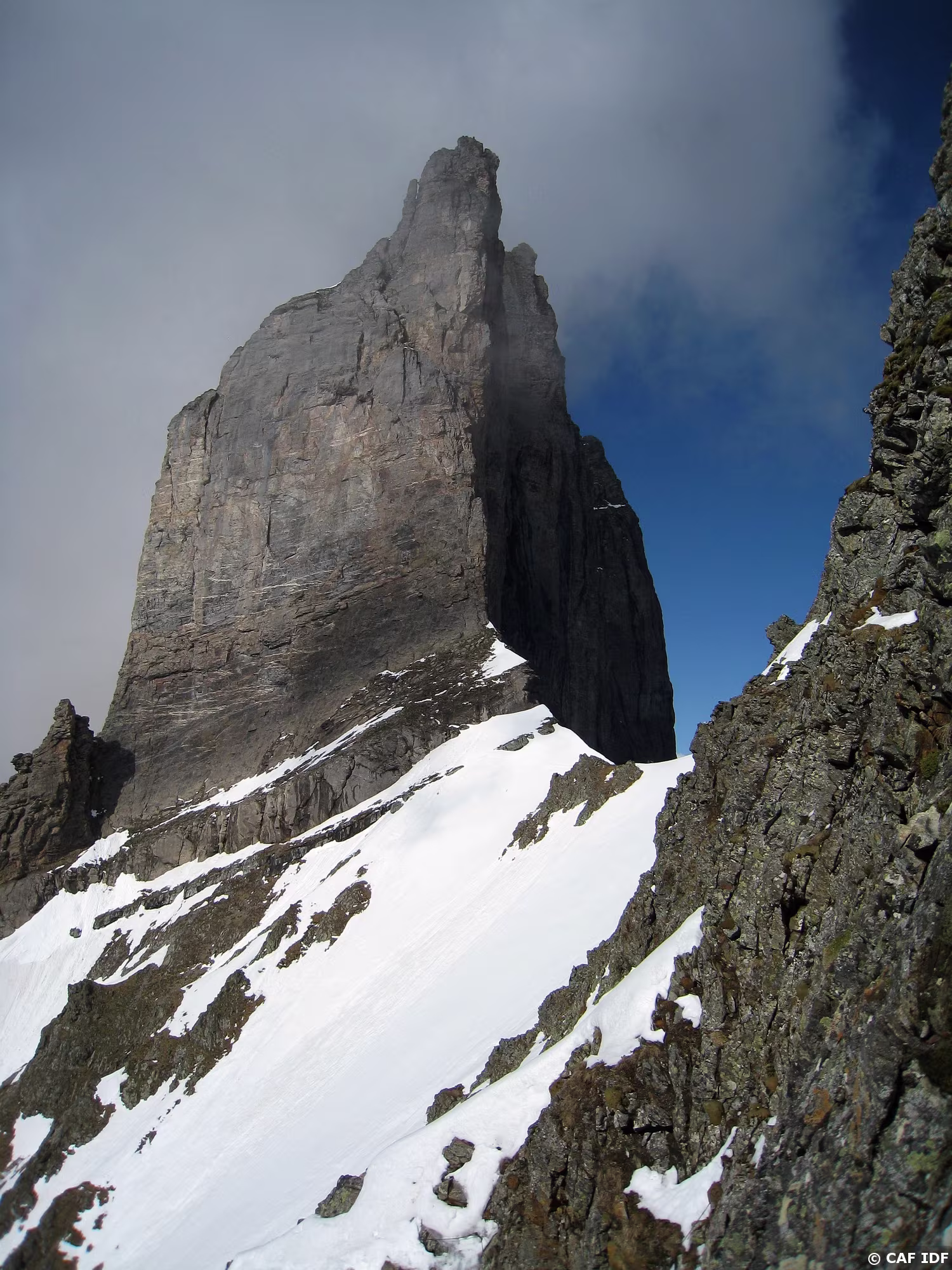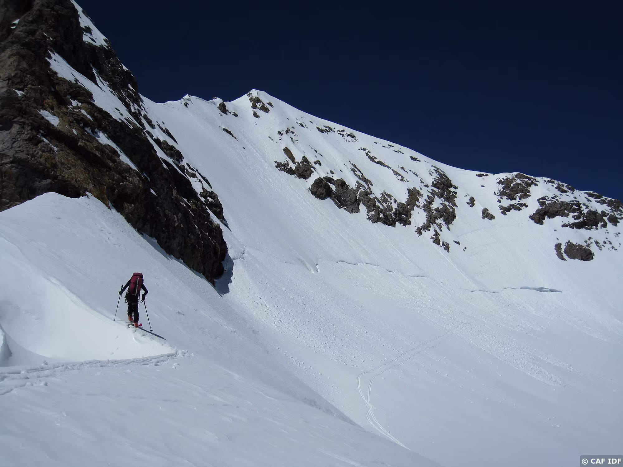 L'itinéraire de montée depuis la brèche 3032 à gauche