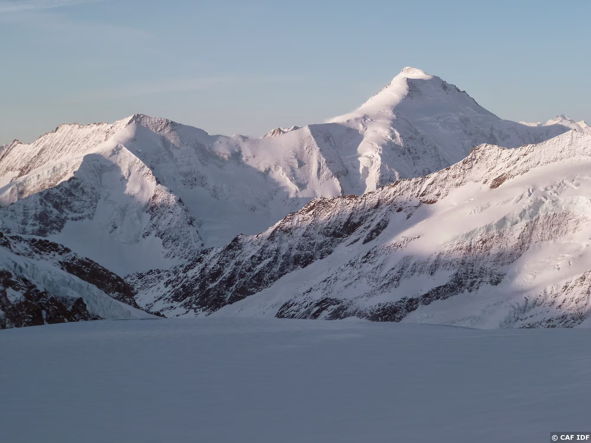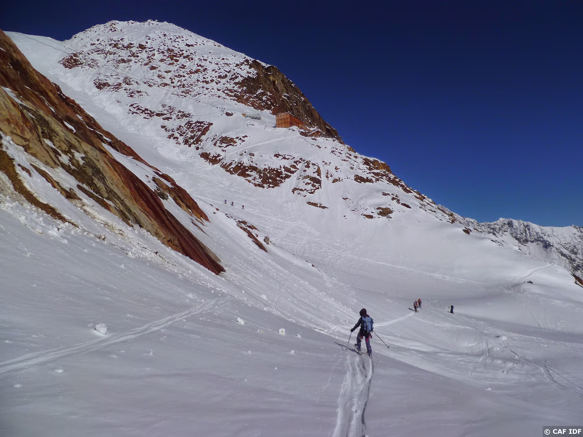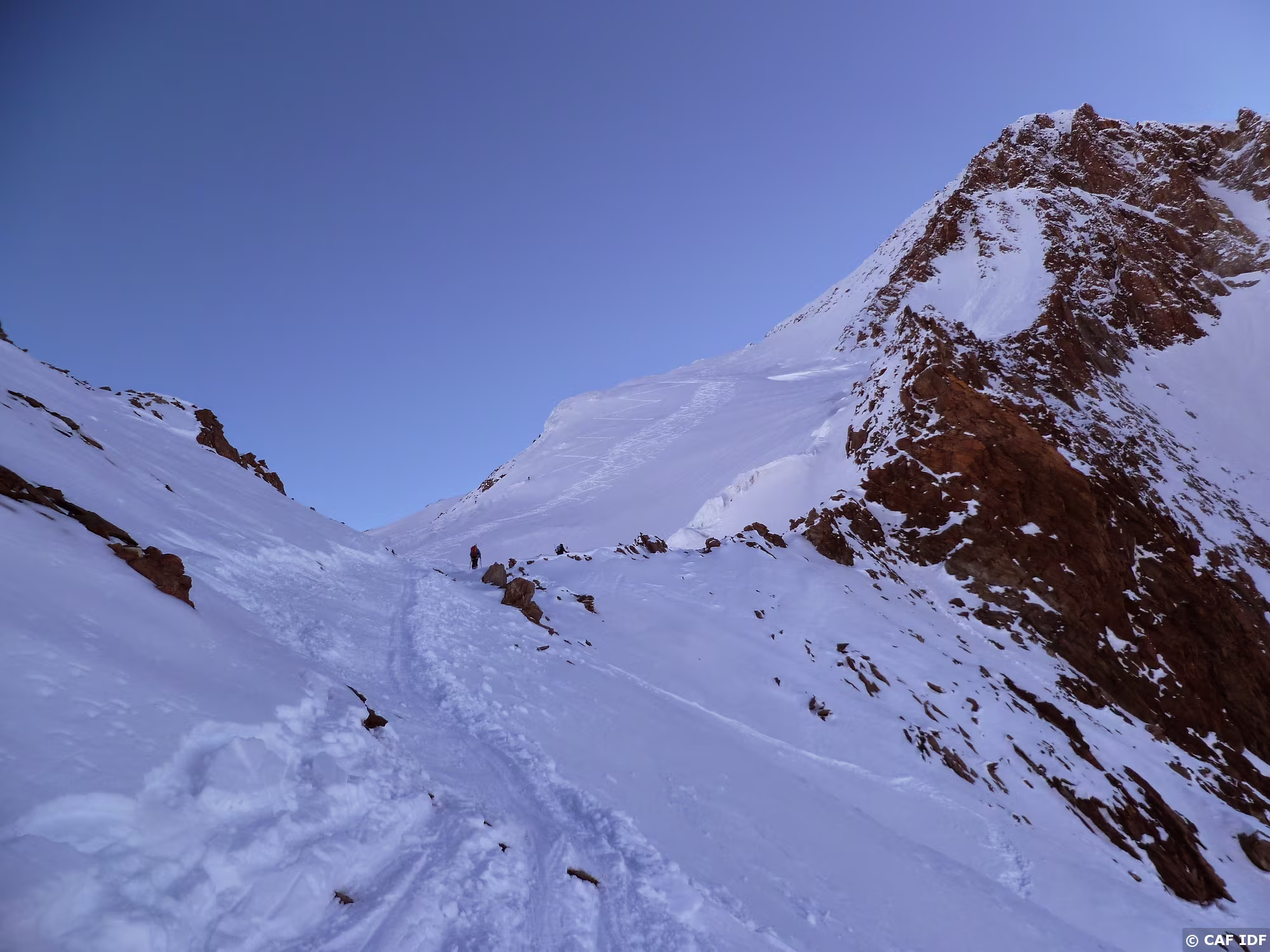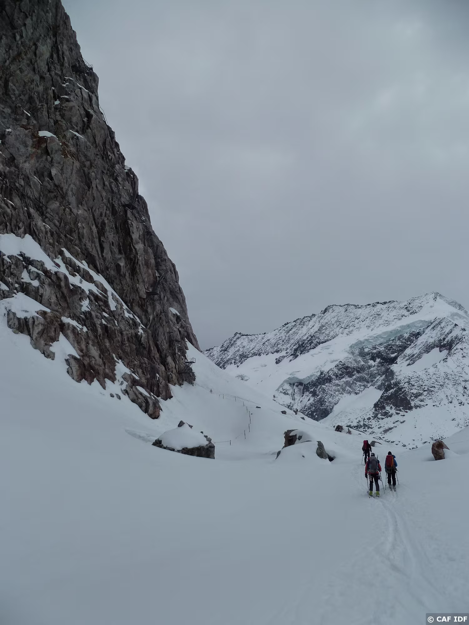 Montée au Finsteraarhorn en évitant les plaques du couloir au dessus du refuge. Elle est tracée jusqu'au col...et après?